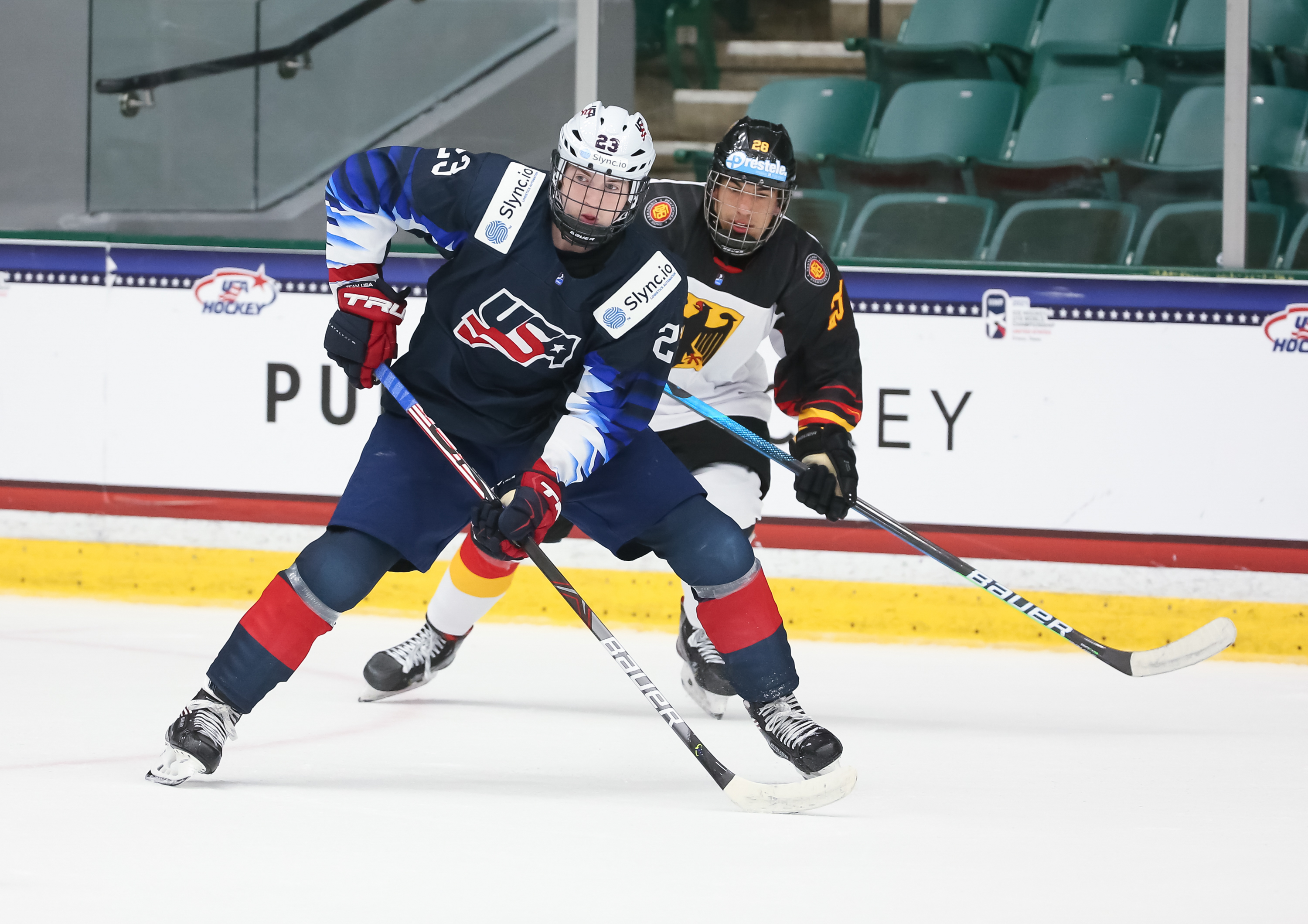 At 7:35, the towering Charlie Stramel put the U.S. up 4-2 with a breakaway goal, maintaining his focus as German defenders lunged with sticks and scoring on the forehand. Seconds later, Wolf had to be sharp to stop Logan Cooley on yet another breakaway.