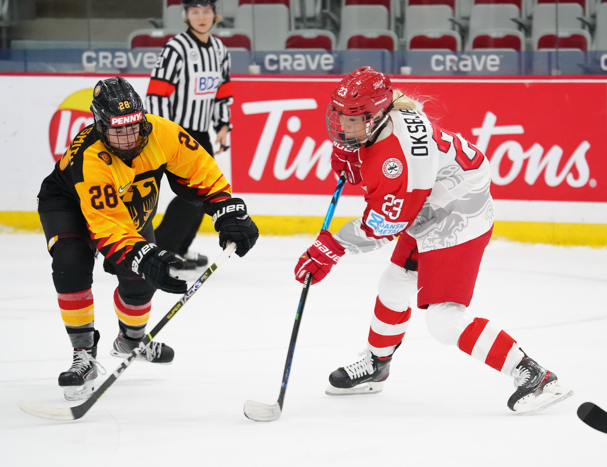 Germany edged an impressive Danish women's national team this afternoon in Calgary by a 3-1 score to improve its record to 2-0 and move into a tie for top spot with the Czechs in Group B with six points. The win goes a long way to giving the Germans a place in the quarter-finals on Saturday while also doing serious damage to the Danes’ playoff ambitions.