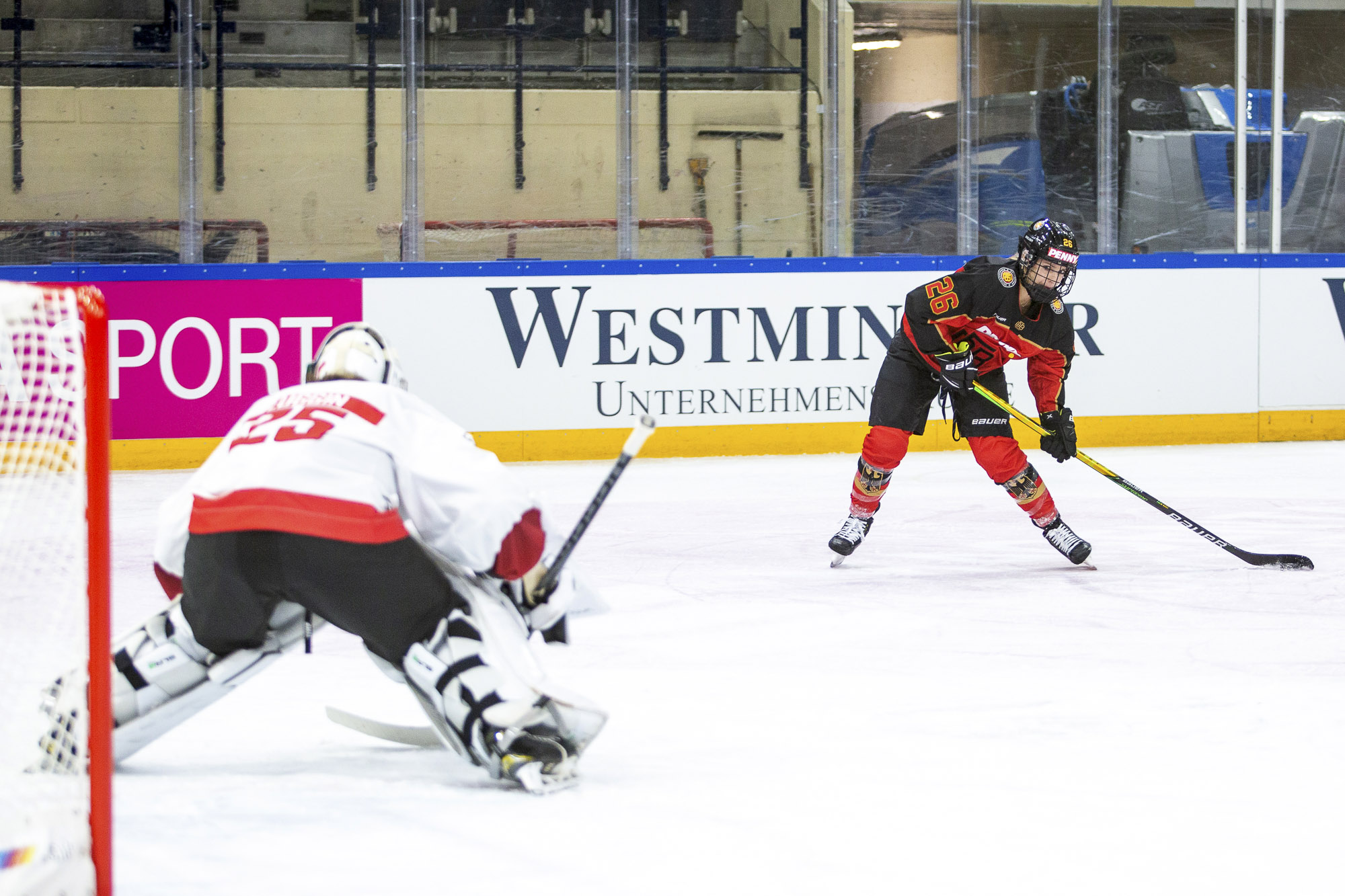 Then the momentum swung to Austria as the Germans took consecutive penalties, the first leading to a penalty shot that was stopped by Arbstrieter. But on the second Austrian forward Anja Trummer got off a shot on Arbstrieter from the middle of the right circle that the Germany goalie was unable to freeze, leading to a rebound from Janine Weber that went through to give Austria a 2-0 lead with five minutes to go in the frame.