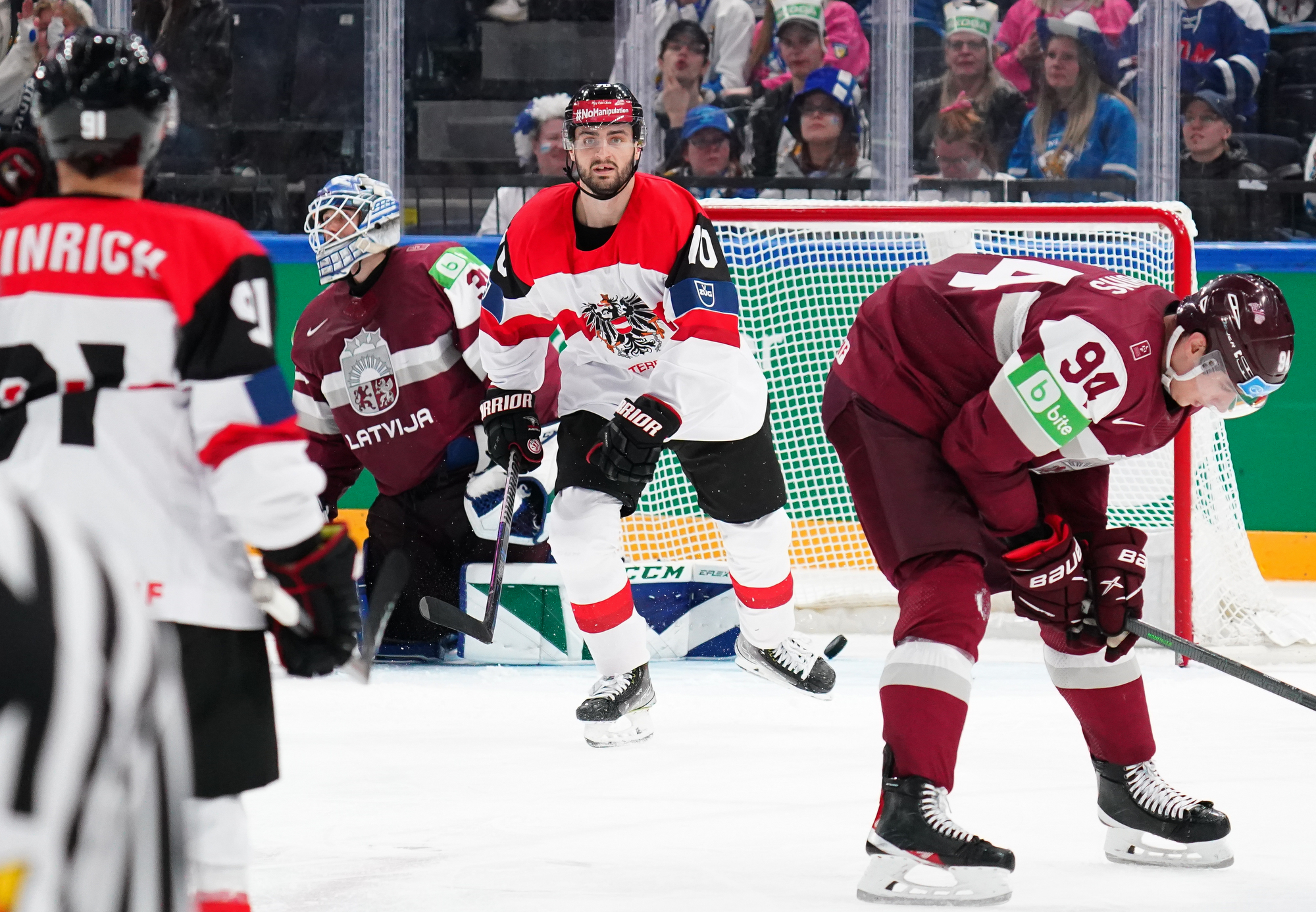 Sensing momentum on their side, the Austrians pressed for more. Rushing into the zone minutes later, Peter Schneider’s initial shot was stopped by Silovs. Henrich got the rebound and tried to go upstairs but the Latvian keeper leaned forward and took the shot on his blue-and-white Vancouver Canucks mask, preserving the tied score.