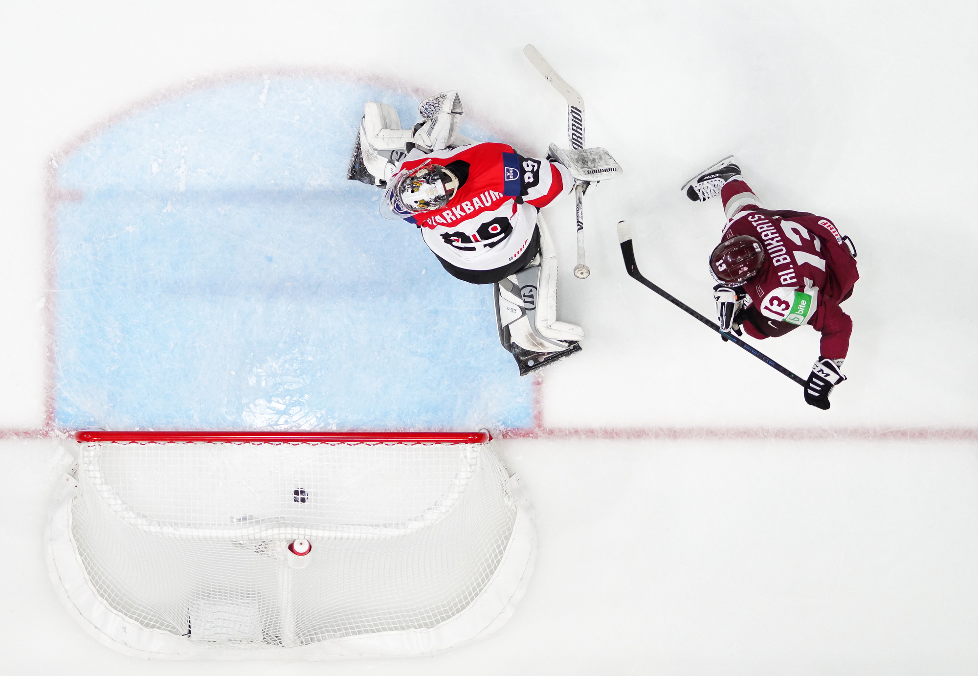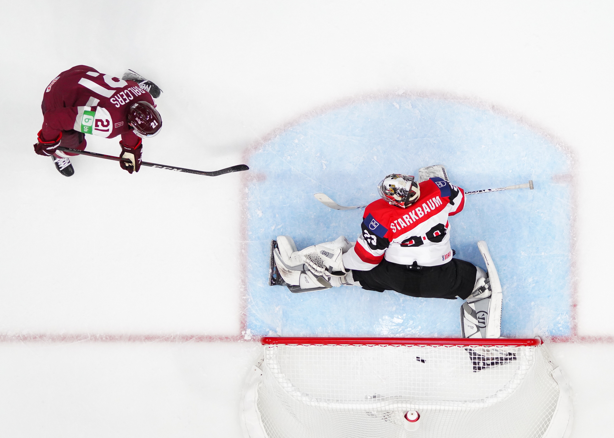 Latvia then had a pair of power-play chances and took the lead on the second one, just shy of the game’s midpoint. Starkbaum looked to have a clear view of Karlis Cukste’s point shot but Rihards Bukarts reached out his stick to make a one-handed tip that perfectly re-directed the puck through the Austrian goalie’s pads.