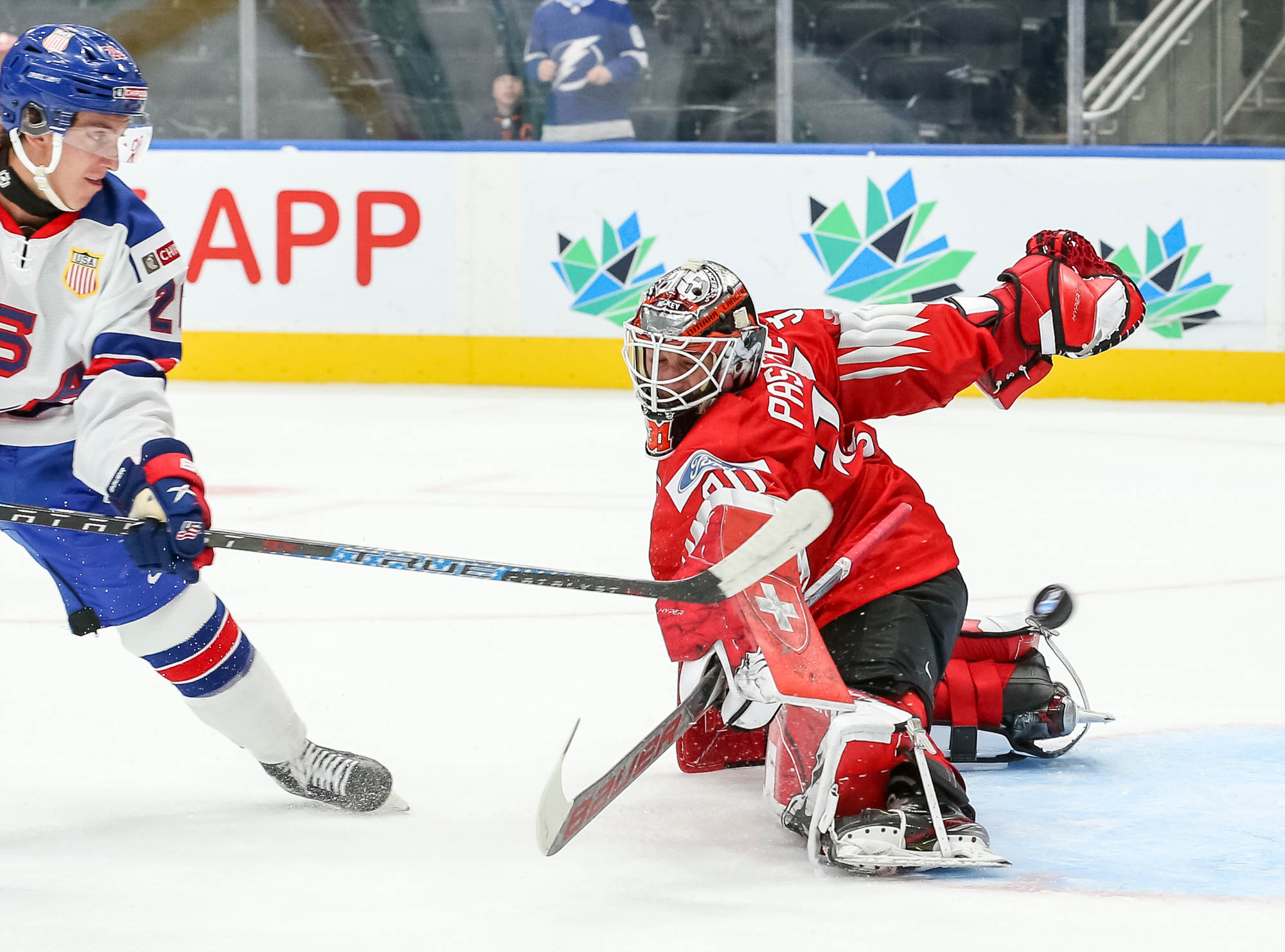 And yet, the Swiss came out and skated stride for stride with the Americans in the opening period. Indeed, they held a slight advantage in shots until late in the period but more U.S. shots were dangerous. They were stopped by some fine play form Swiss goalie Kevin Pasche, and a lack of finish around the net. Pasche played at the 2021 U18s and also in one game last Christmas at the U20, but this was his first game here now in Edmonton. He also sports a helmet with an inspirational mantra on the back that reads: “Don’t be afraid of failure. This is the way to succeed.”