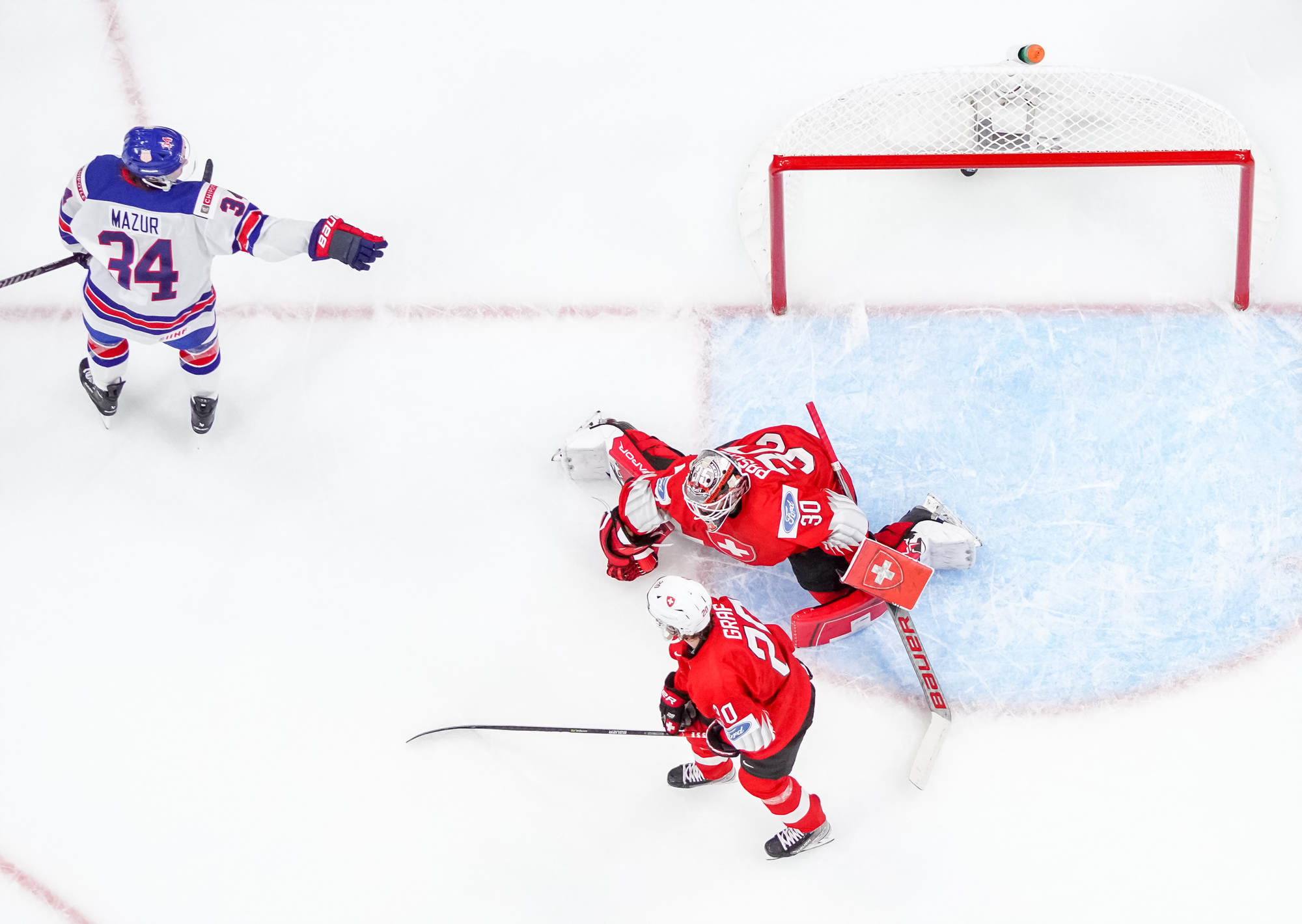 That was as close as the Swiss ever got. Brock Faber wired a high shot over the shoulder of Pasche at 11:29 to make it 2-1. Landon Slaggert then made a great cross-ice pass to Mazur, who blasted a one-timer to the back side of Pasche at 13:22 to double the lead, and then they got two more thanks to beautiful tips in front.