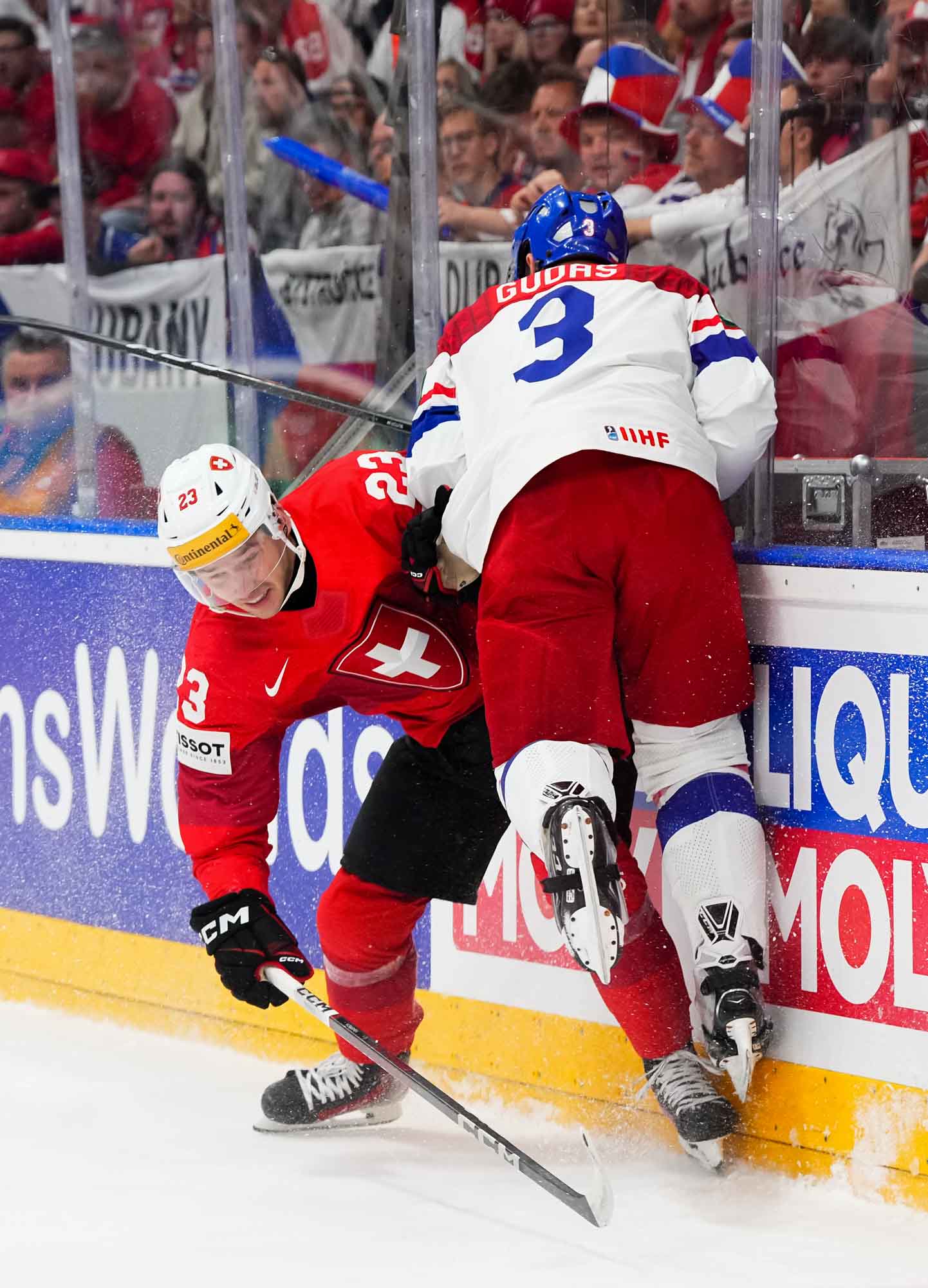 In an O2 Arena shaking with thunderous pro-Czech chants, horns, and drums, the teams set a furious pace in the penalty-free first period. Nearing the six-minute mark, forward Ondrej Beranek was so fired up that he accidentally leaped into the Swiss bench while trying to keep a puck in the attacking zone.