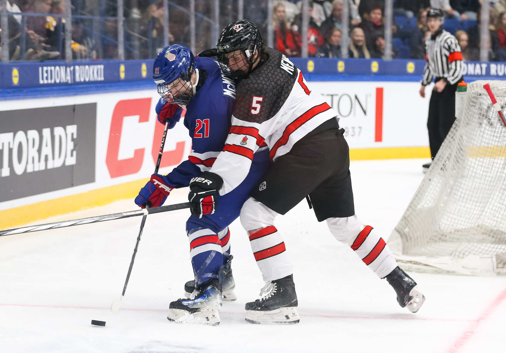 With under three minutes to play, the U.S. pulled Kempf for the extra attacker. However, McKenna completed his hat trick with the empty-netter at 18:42, taking over the tournament goals lead (10). The Canadian party was on.
