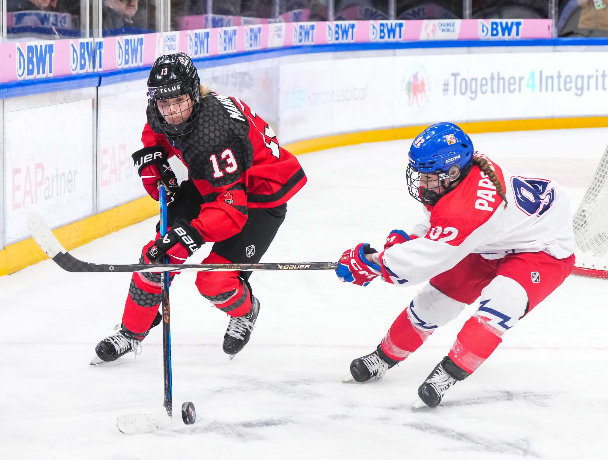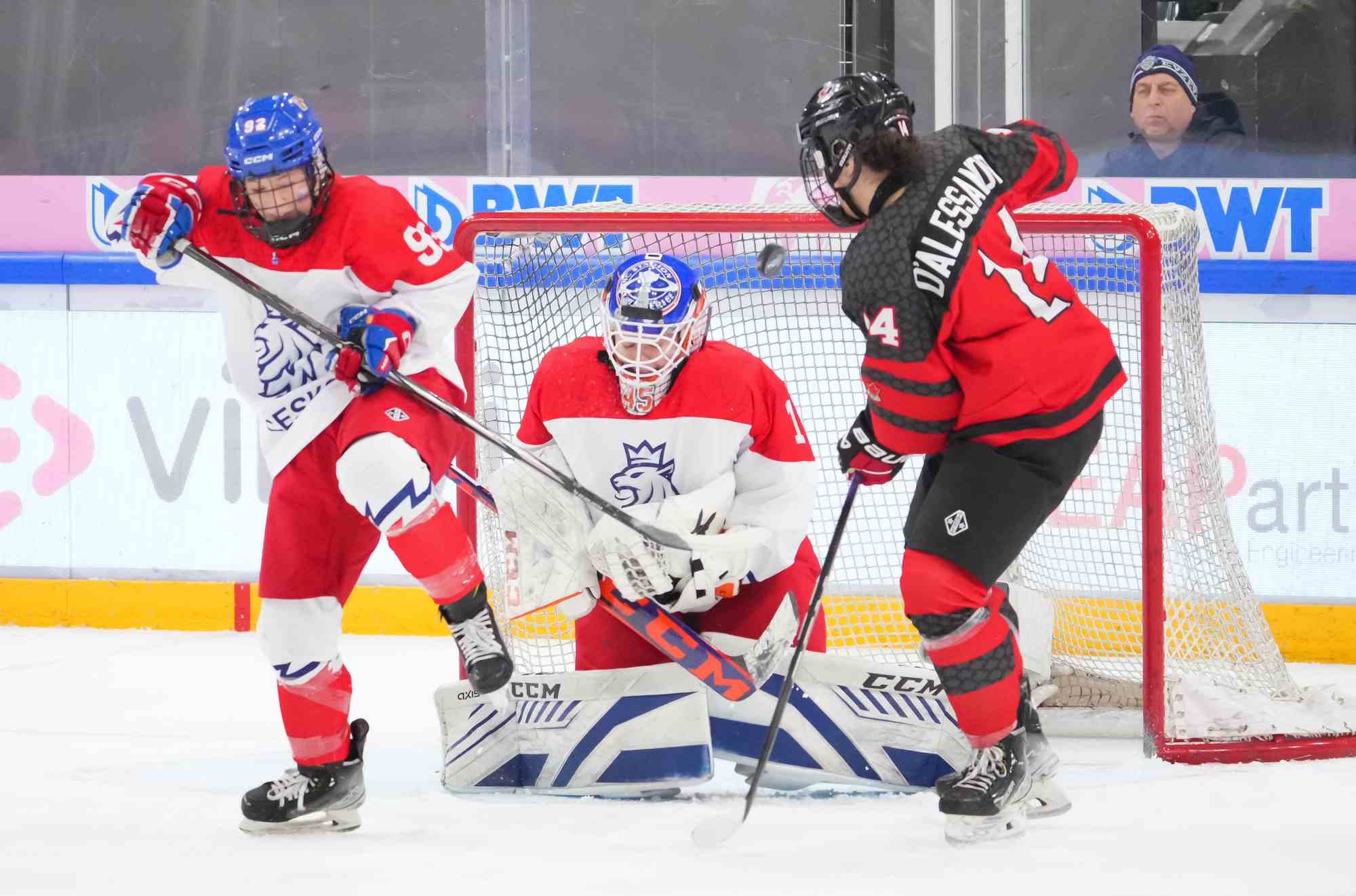 Passion ramped up as pounding Czech drums competed with "Go Canada go!" chants. The Czechs came out determined to force the play. The ever-slippery Sapovalivova cut back from the side boards, skated behind the net and centred the puck on her backhand to Cabelova, who scored from the doorstep at 3:32.