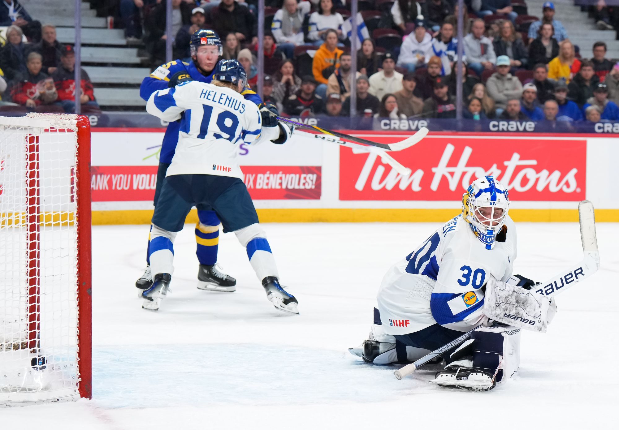 Heading into this showdown, the Finnish penalty kill had allowed just one goal. But Sweden made it 2-2 with its top-ranked power play at 18:07. Stenberg's one-timer from the right faceoff circle deflected off Veeti Vaisanen past Rimpinen.