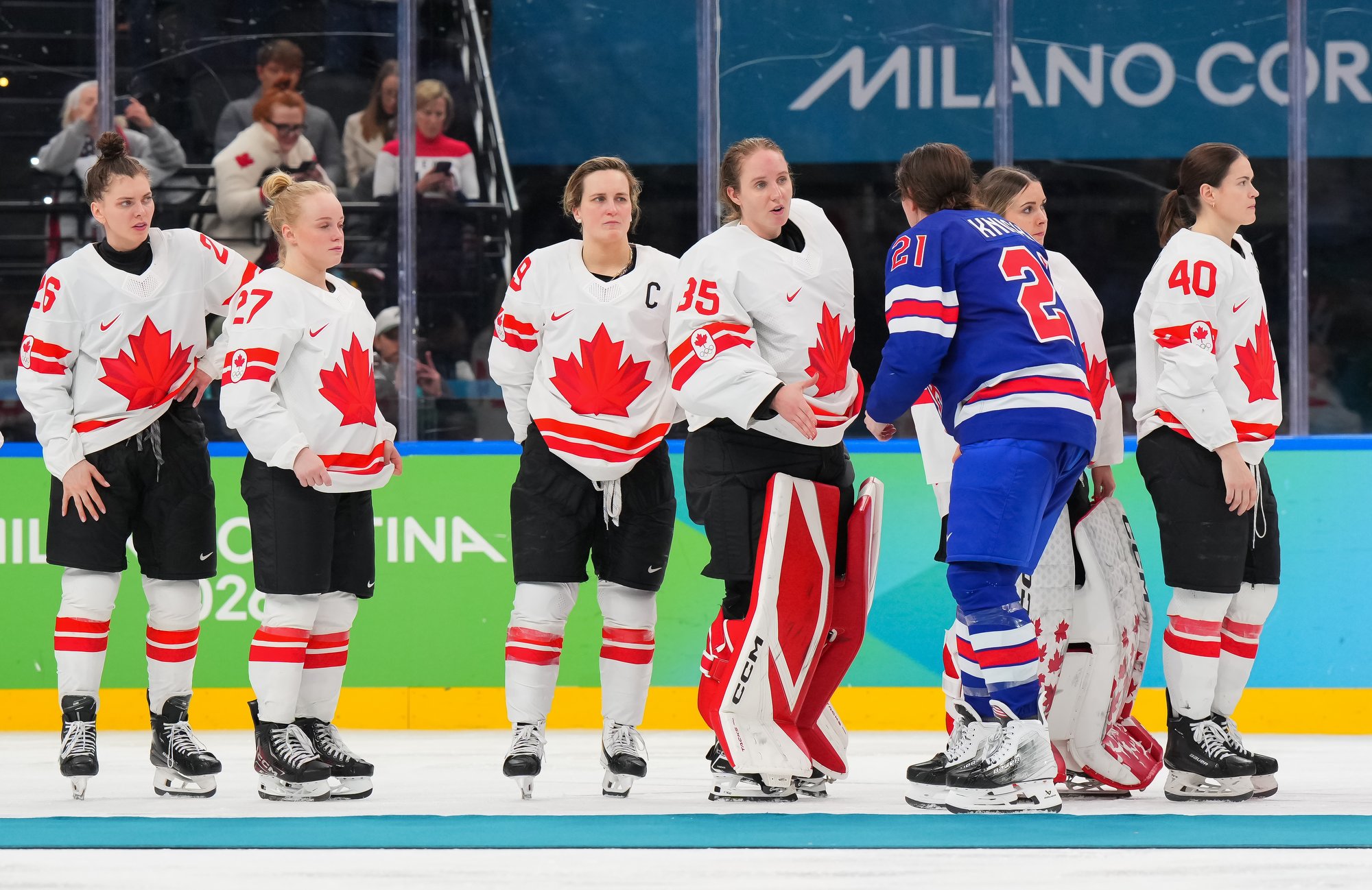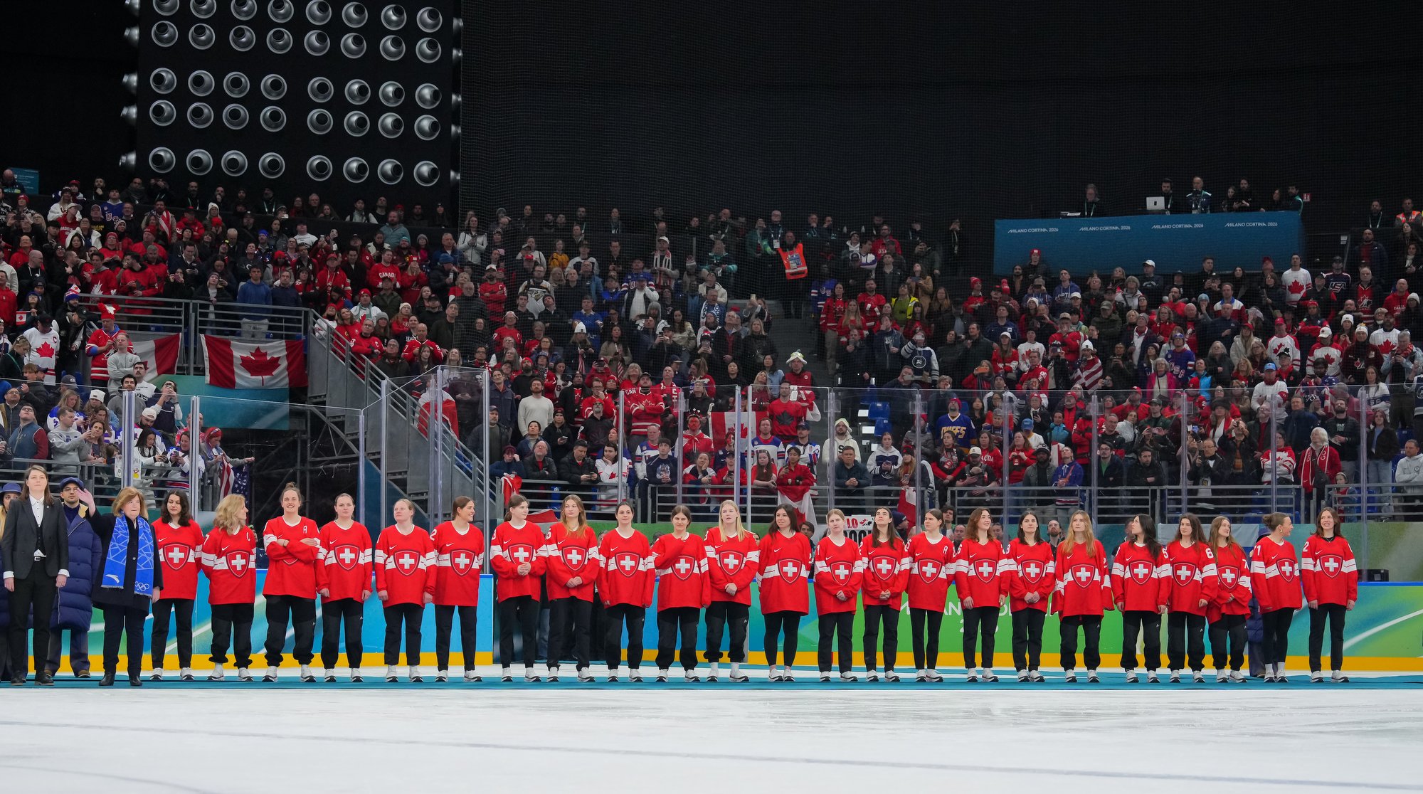 Santagiulia was packed with screaming fans, split more or less evenly between the two nations, and they had plenty to cheer for right from the get-go. Canada’s biggest challenge was to negate the U.S.’s flow and speed. To that end, they dumped the puck in and made the American defence chase the puck. In trouble in their own end, they cleared the puck to open ice, again forcing the Americans to chase down every loose puck. One-on-one battles along the boards? Not so much. Canada wasn’t interested.
