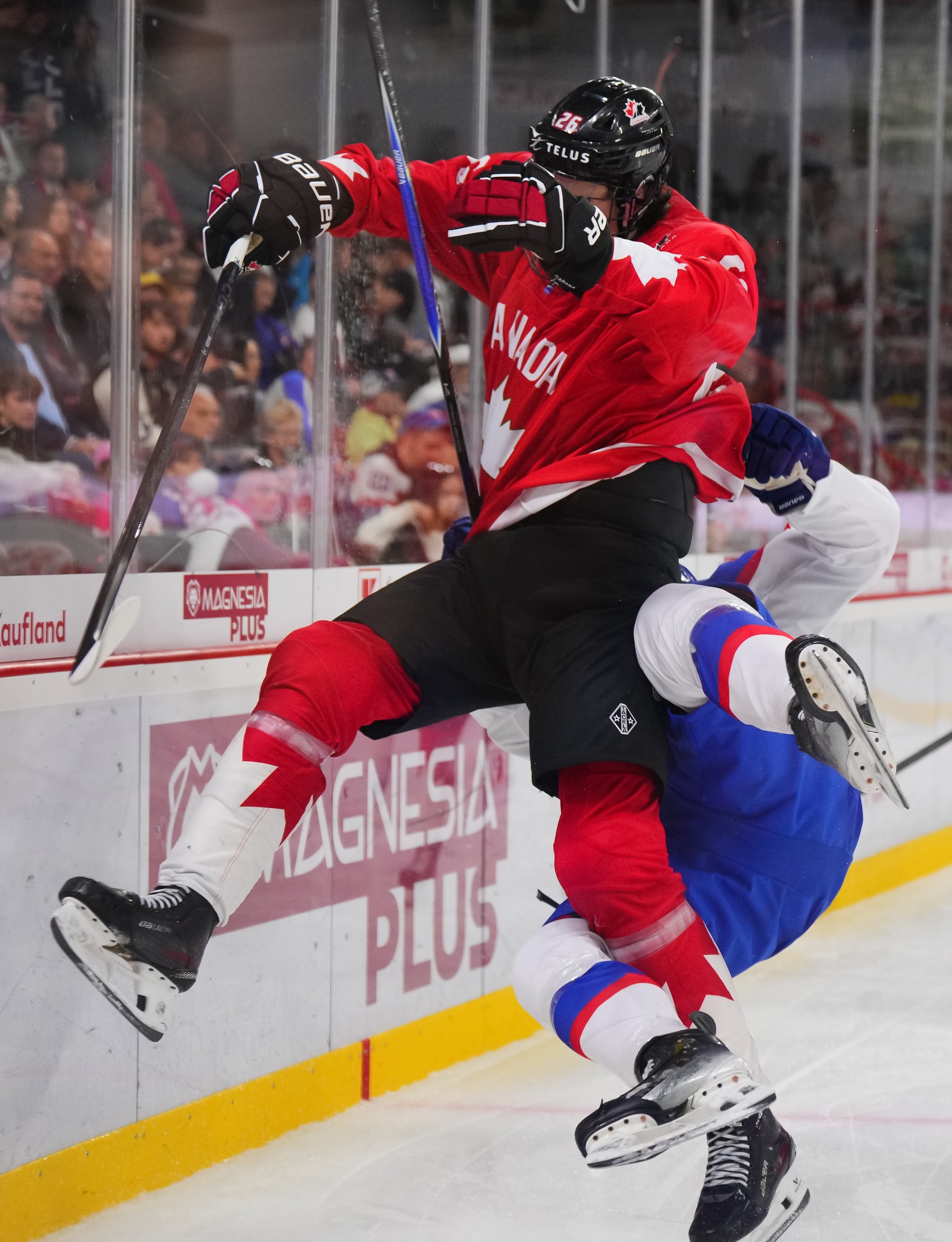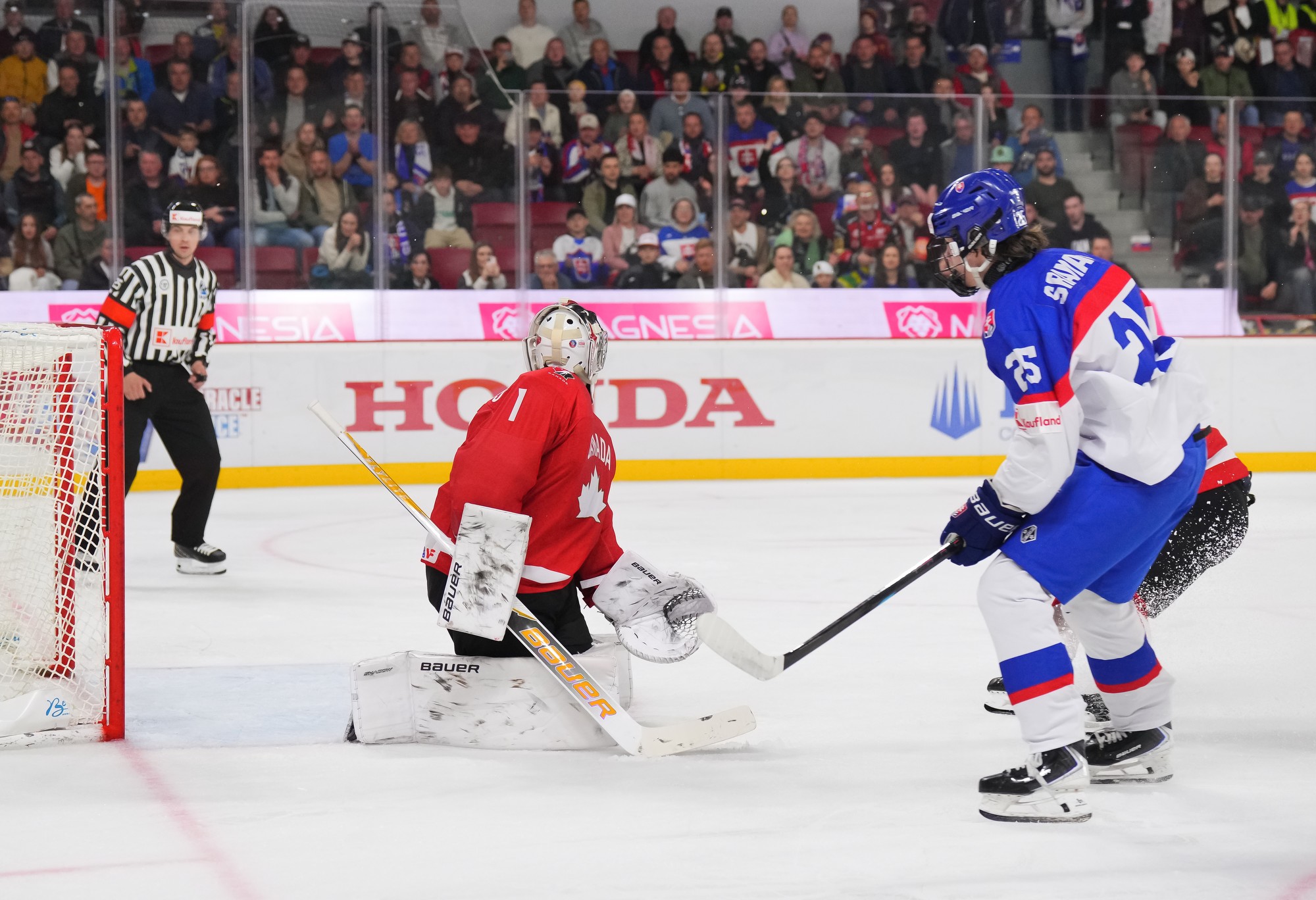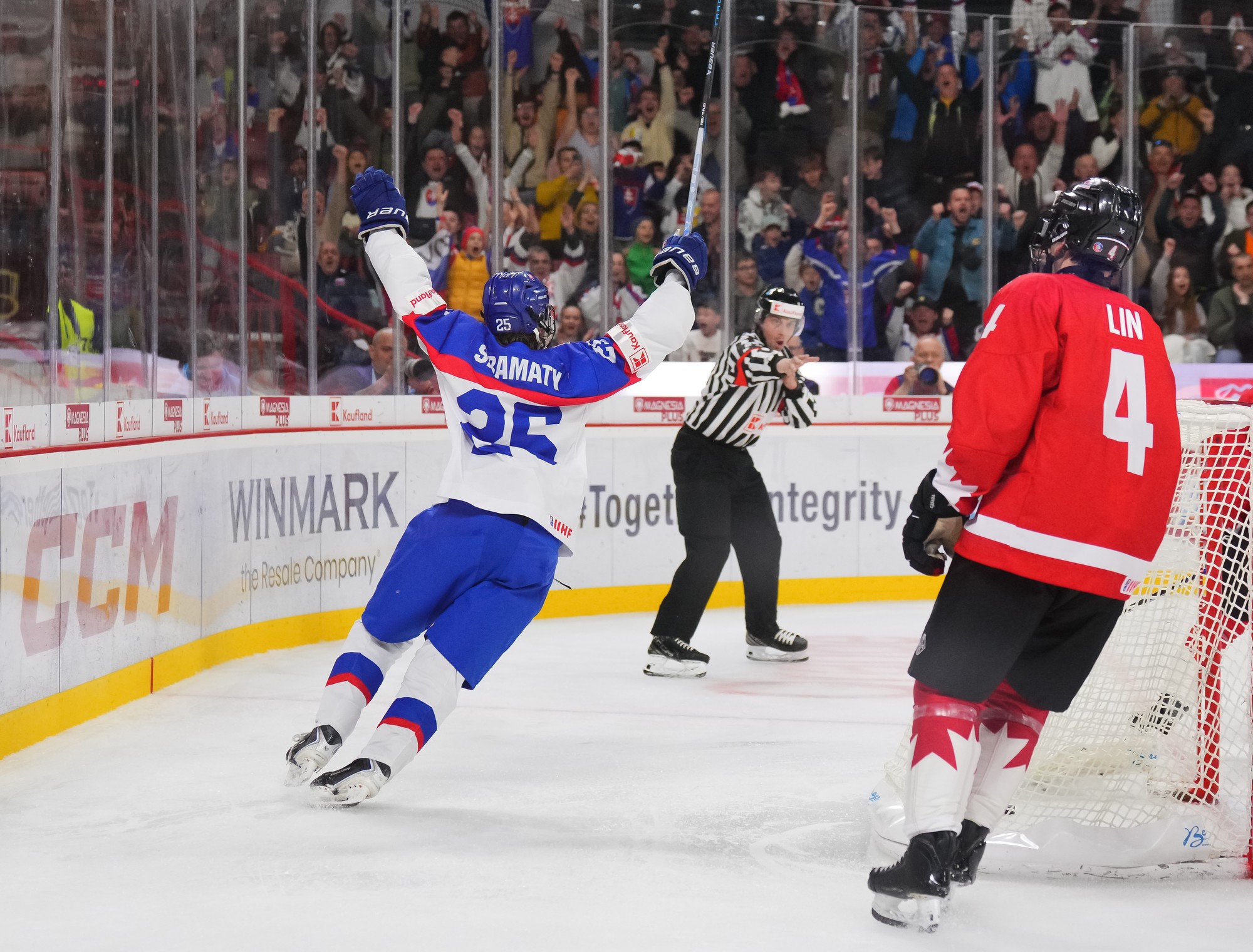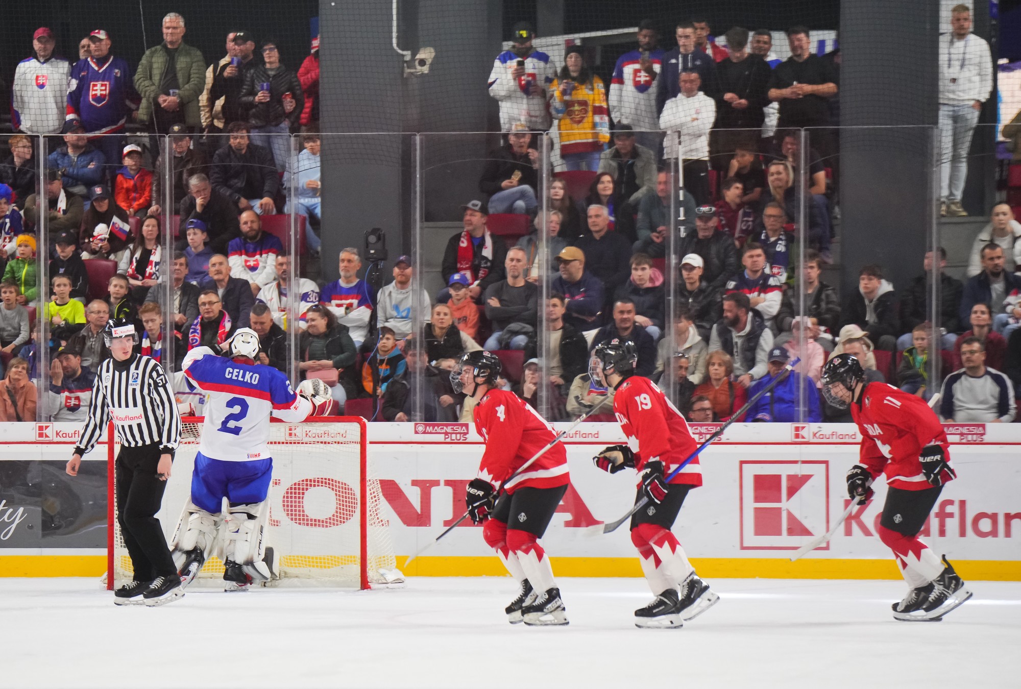 But Canada has resilience in its hockey DNA. A couple of minutes after that goal, with the jubilation still bubbling around the arena, a Slovak penalty led to an equalizer. This was one from the coach’s playbook, slick passing around the zone culminating in Adam Valentini’s feed in front of the net for Mathis Preston to touch home at the back door.