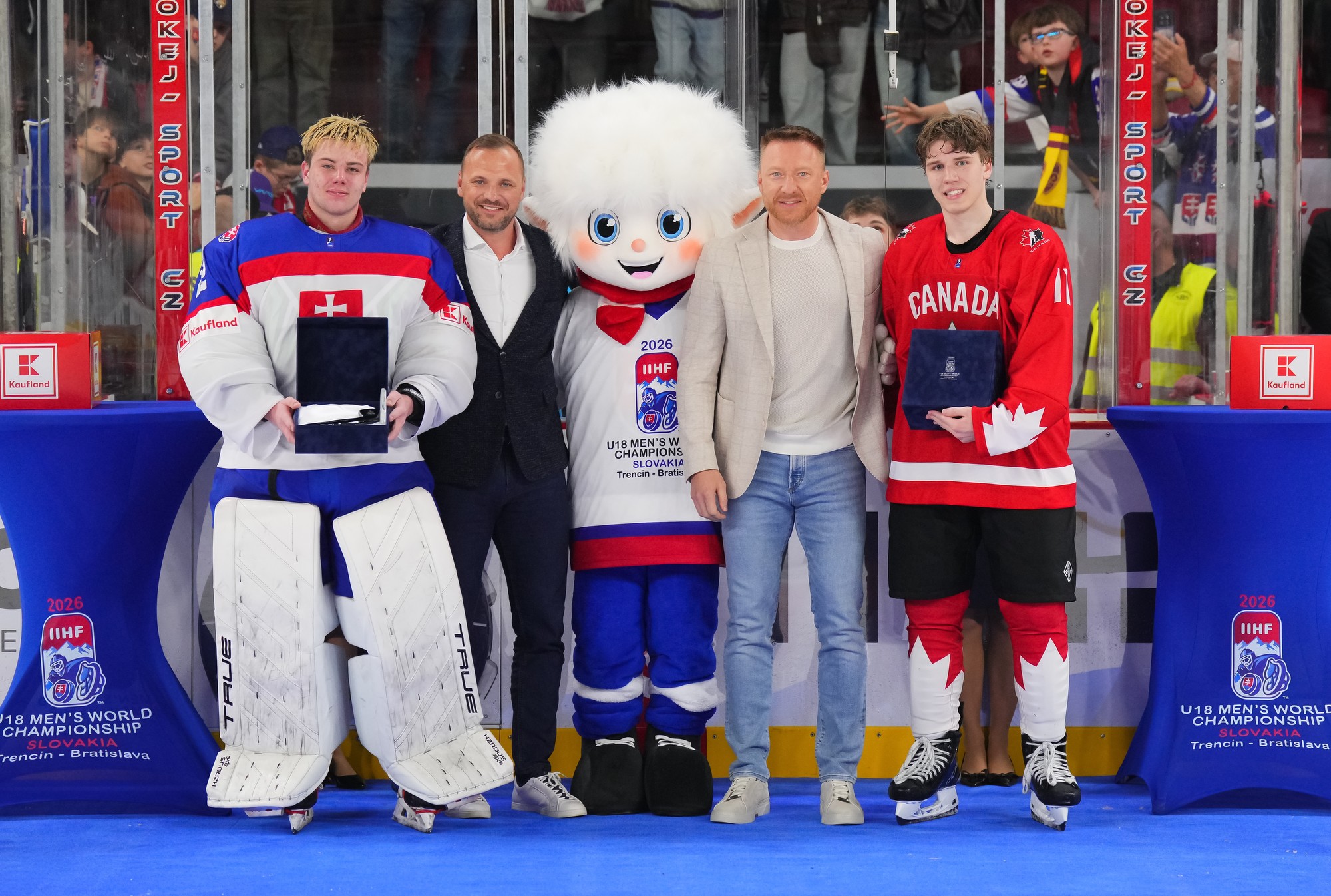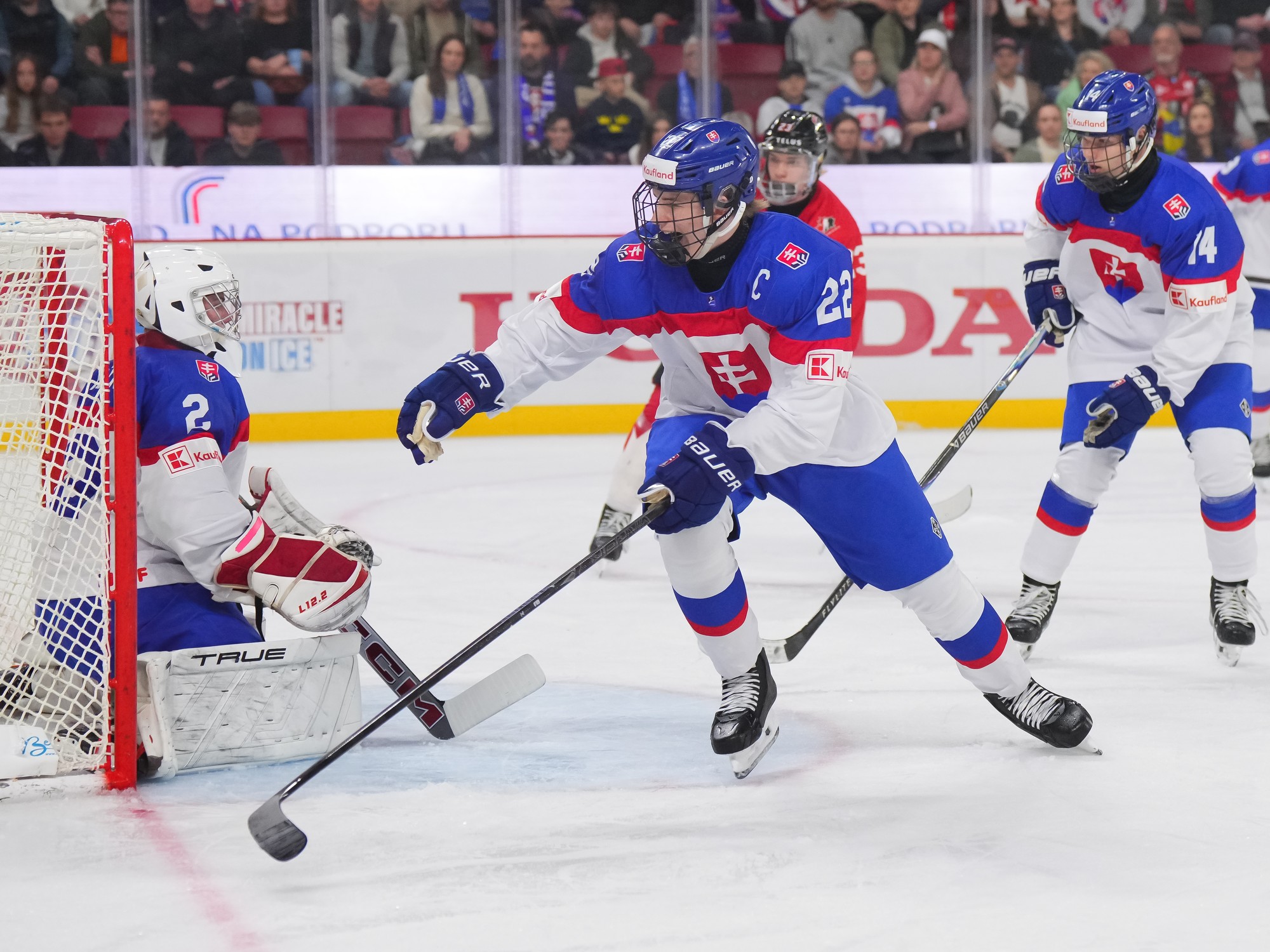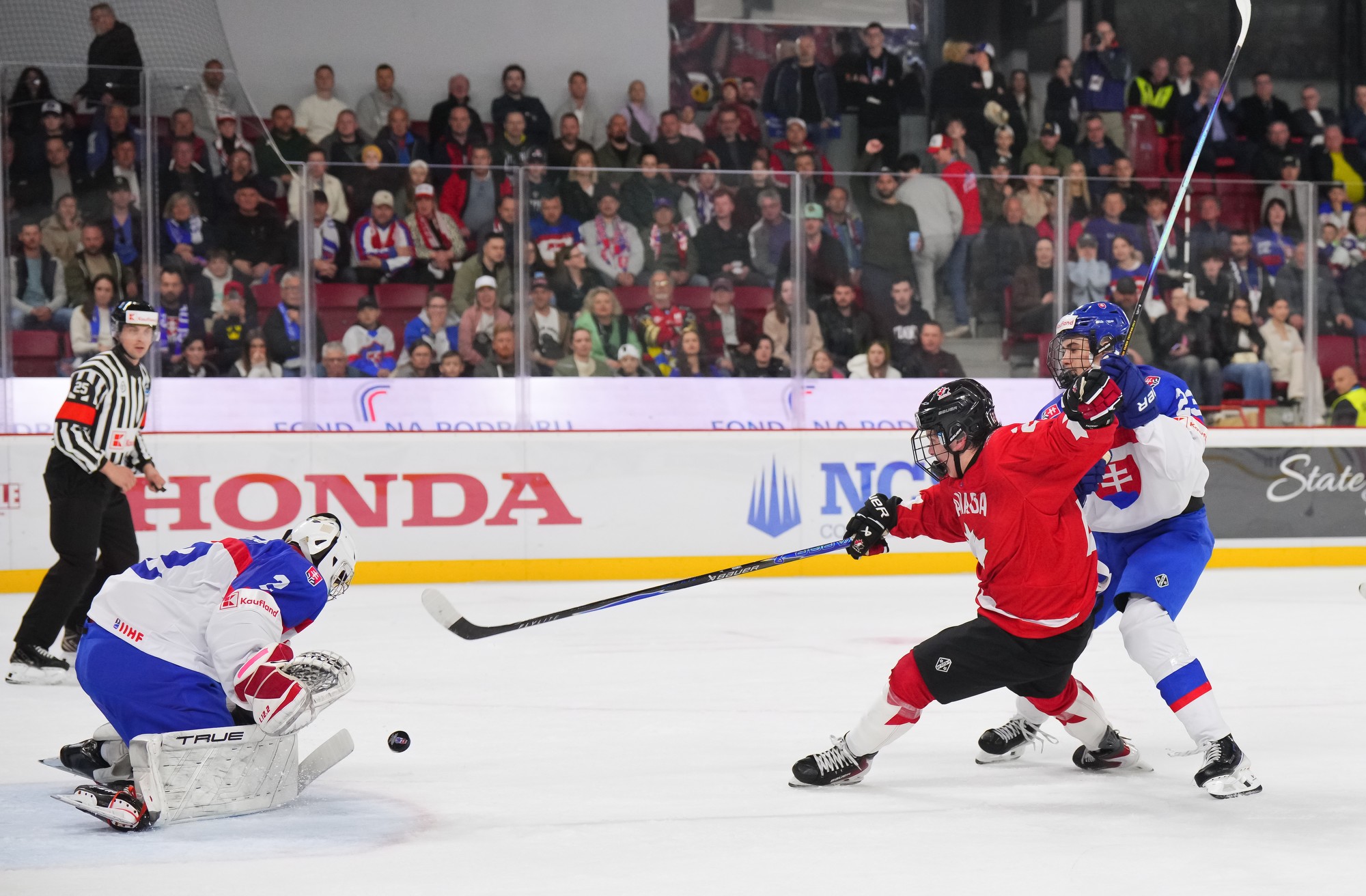 Kazda’s neat finish, drawing back-up goalie Carter Esler off his crease and calmly slotting the puck behind him, sparked joyous scenes at a fervent Pavol Demitra Stadium on the opening night of the 2026 IIHF Men’s U18 World Championship.