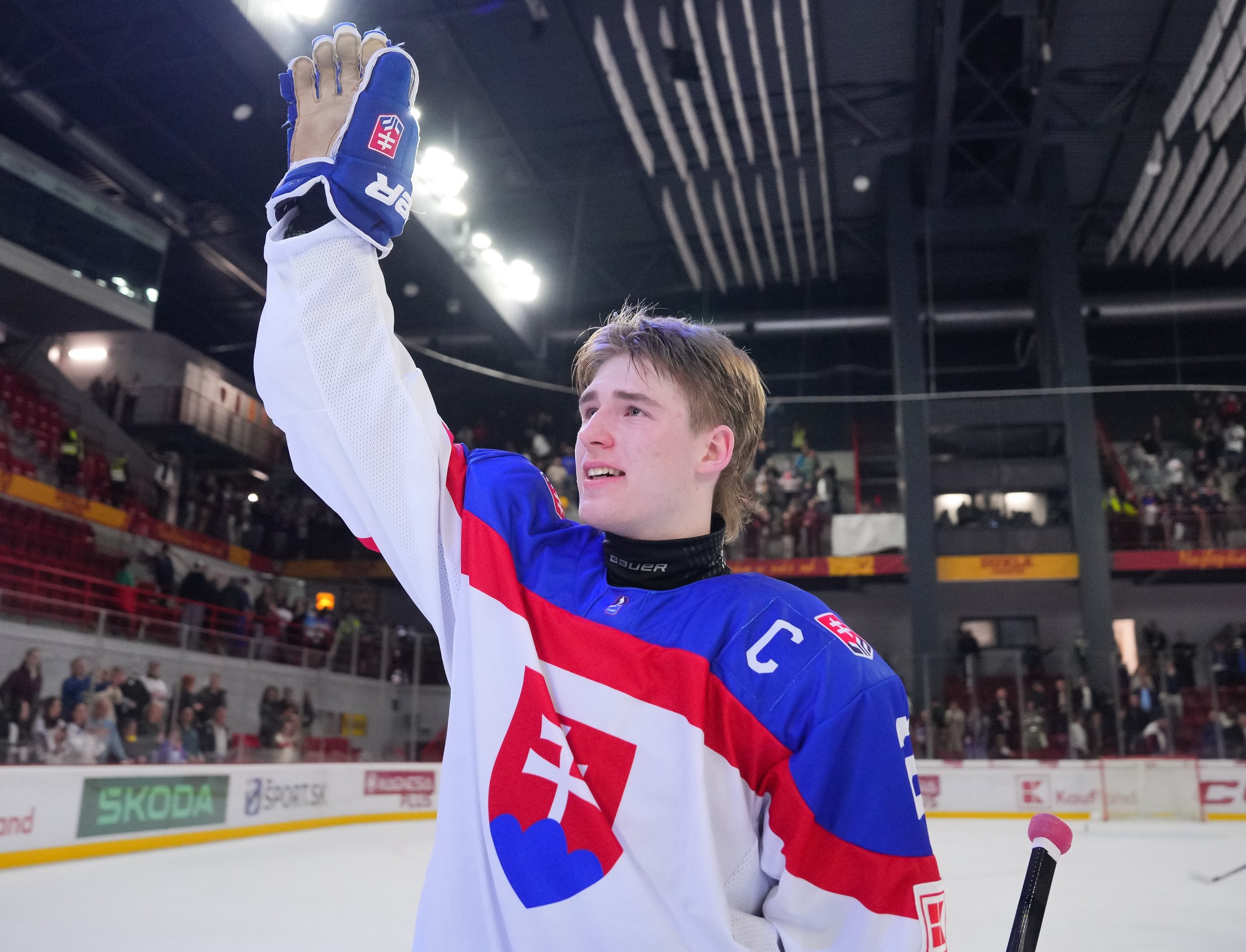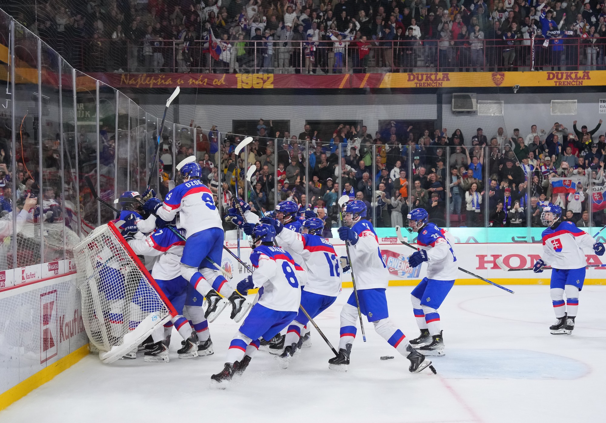 Slovakia's Timothy Kazda celebrates after a scoring a penalty shot on Canada to decide the teams' 2026 IIHF U18 Men's World Championship Group A game in Trencin, Slovakia.