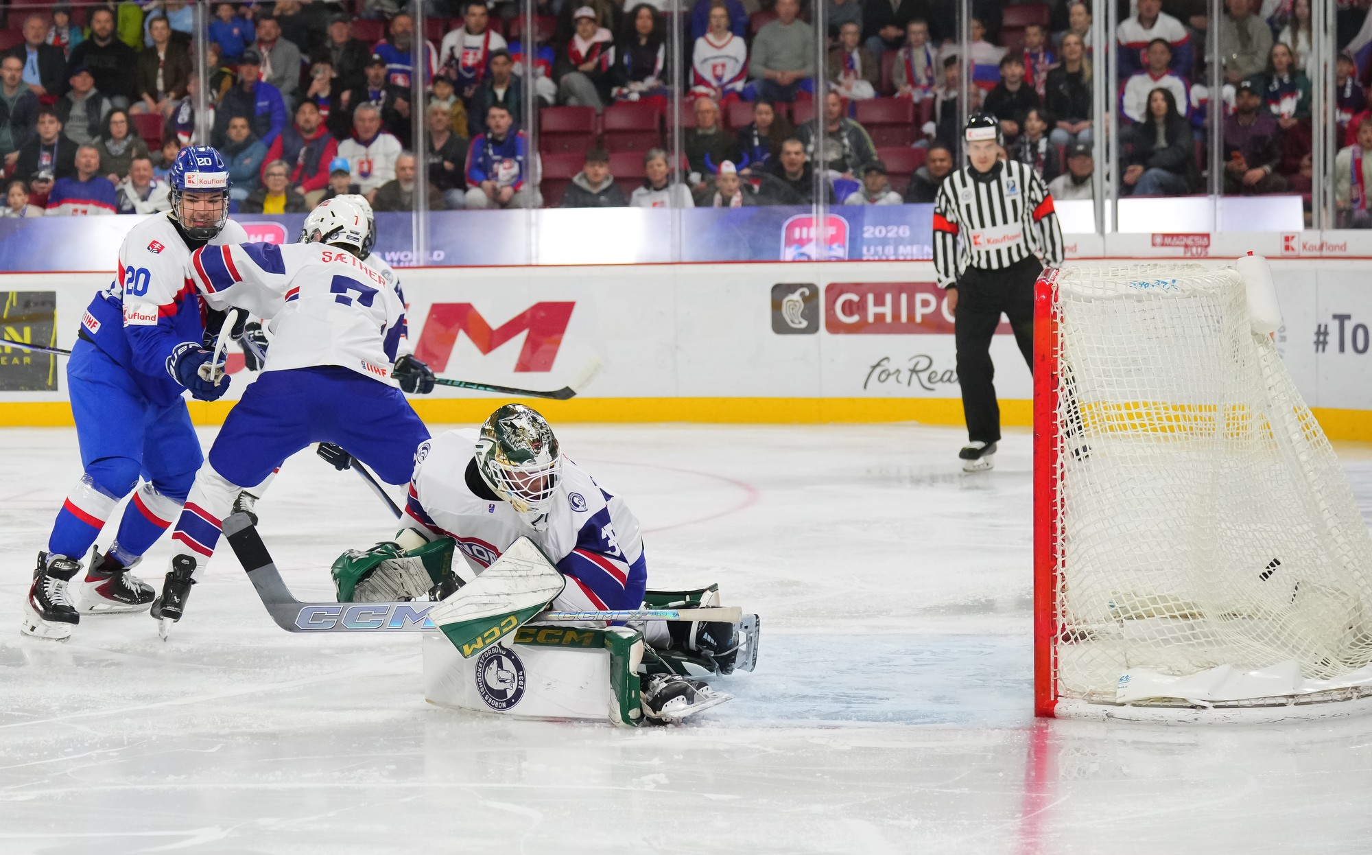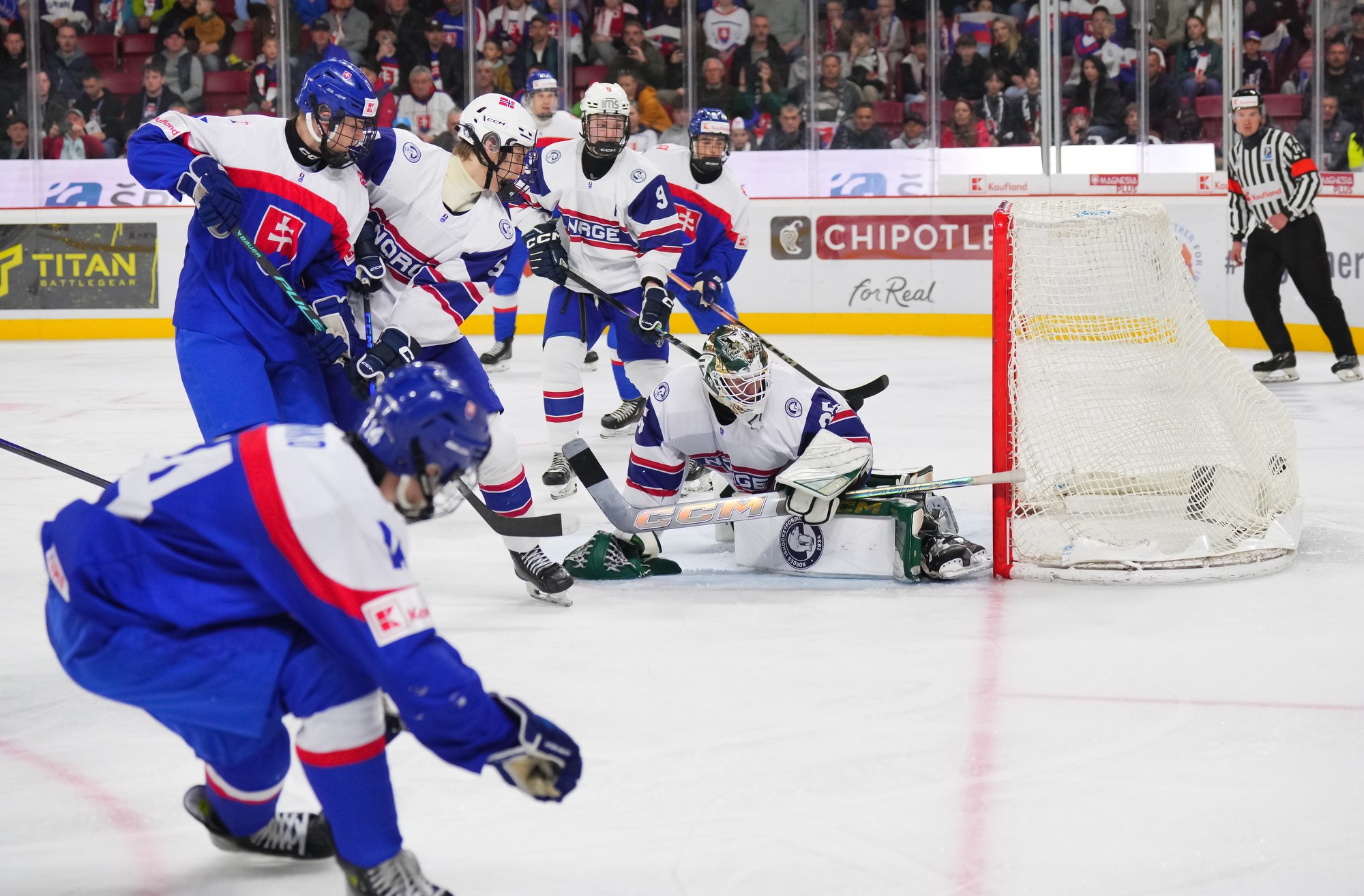 Norwegian goalie Maximillian Aas makes a save on Slovakia's Samuel Sramaty during the teams' 2026 IIHF U18 Men's World Championship in Trencin.