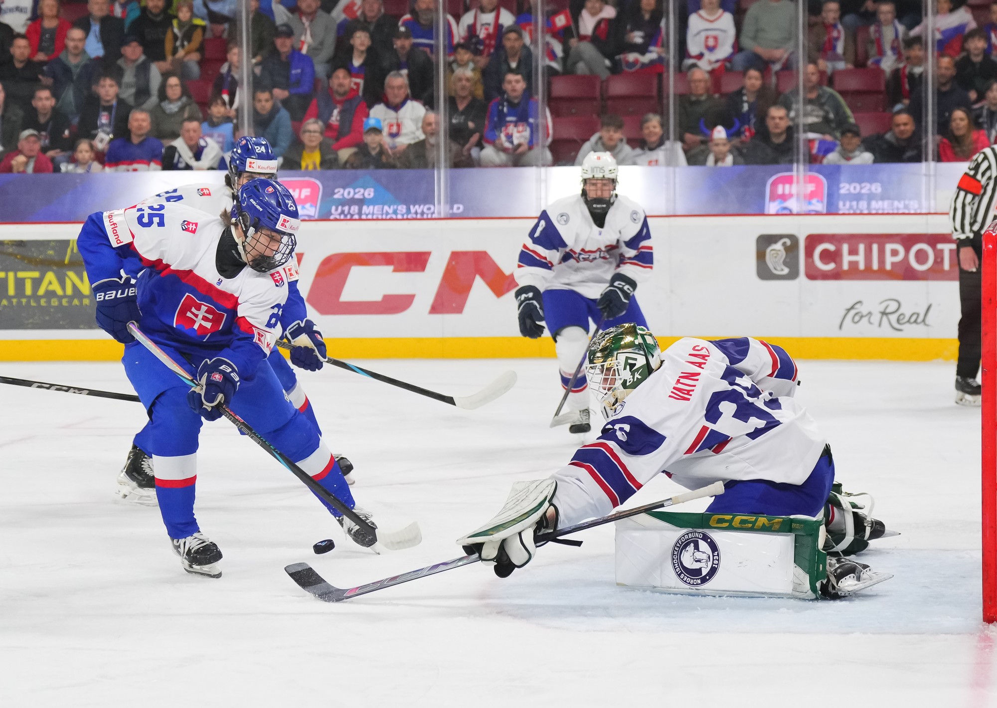 Slovakia saw the game drifting out of control and boosted its own offence. Timothy Kazda, last night’s penalty shot hero, spotted Aas moving across his crease and fired to the open side; the Norwegian goalie recovered well to get his pad behind it.