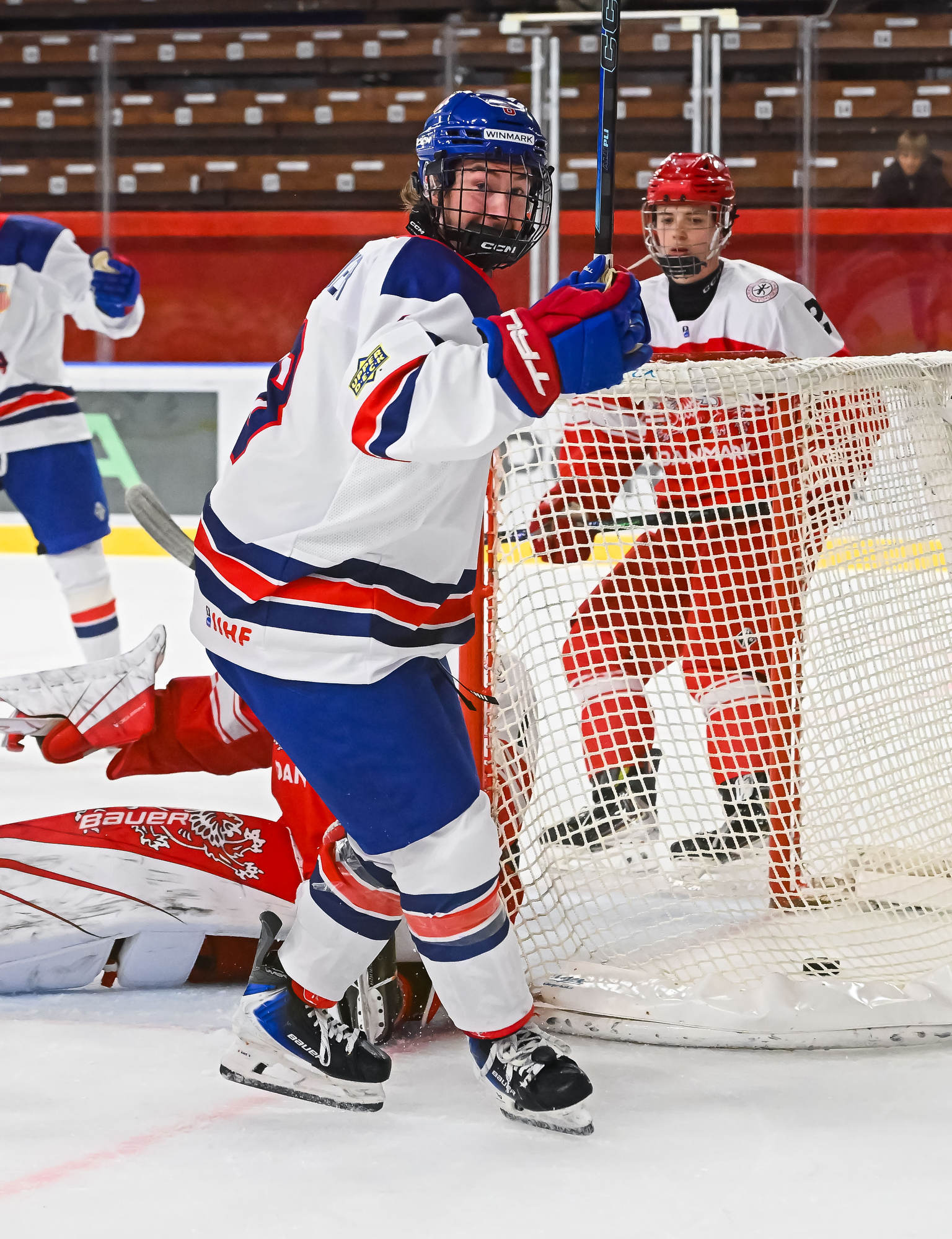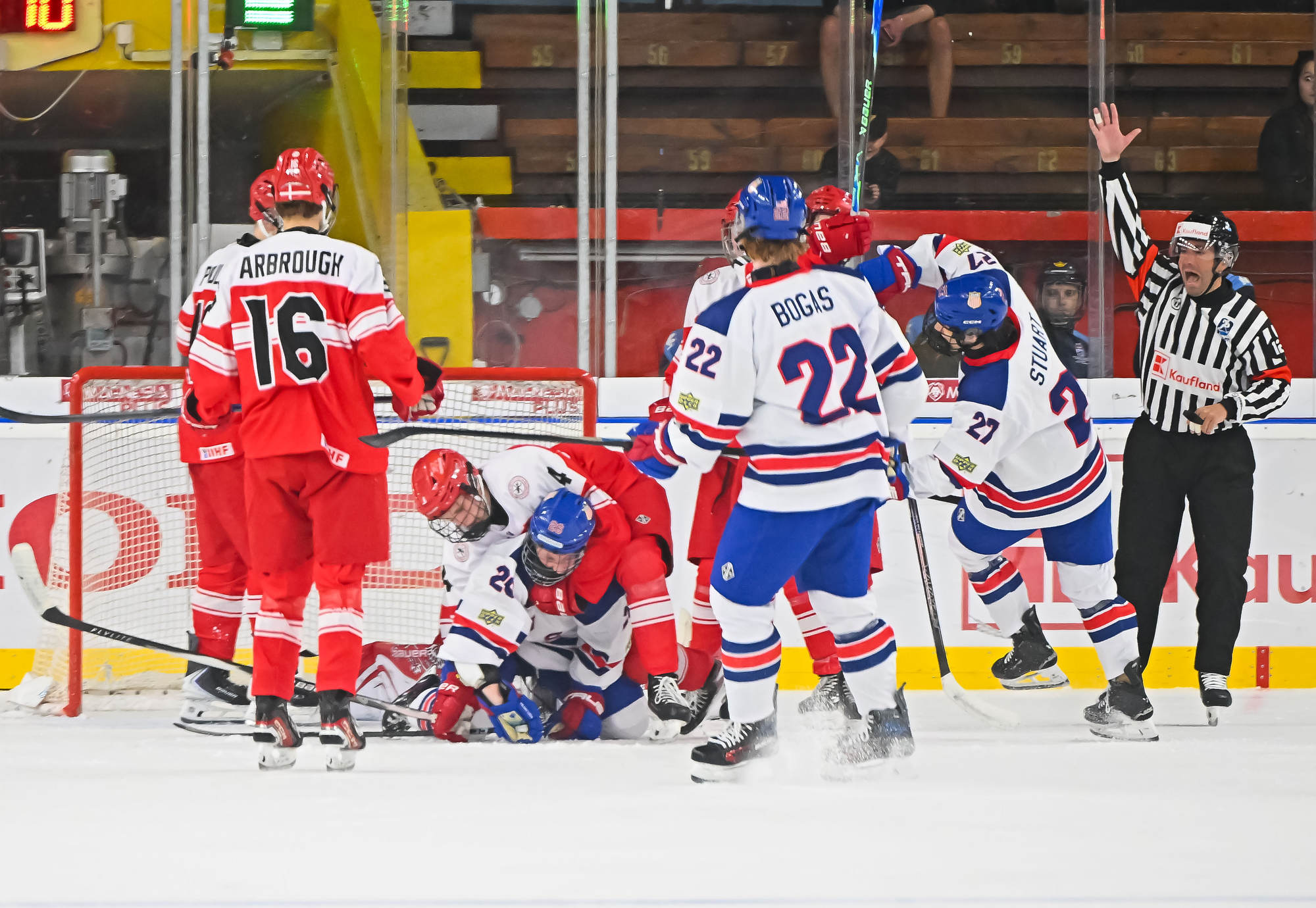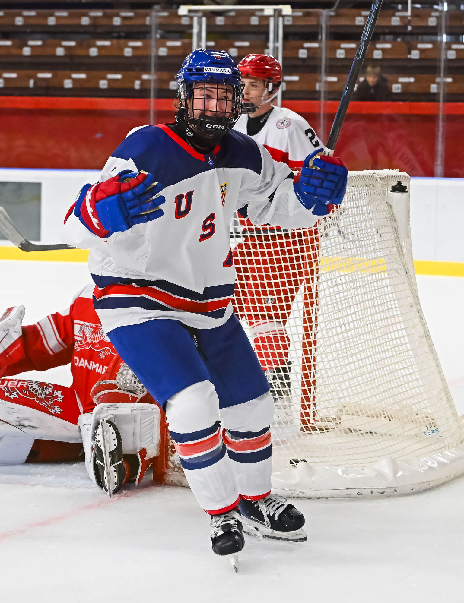 Desperate to keep it a one-goal game, Danish coach Flemming Green challenged that the puck was directed in by the skate. However, the goal stood, sending the USA back to the power play and putting the game away.