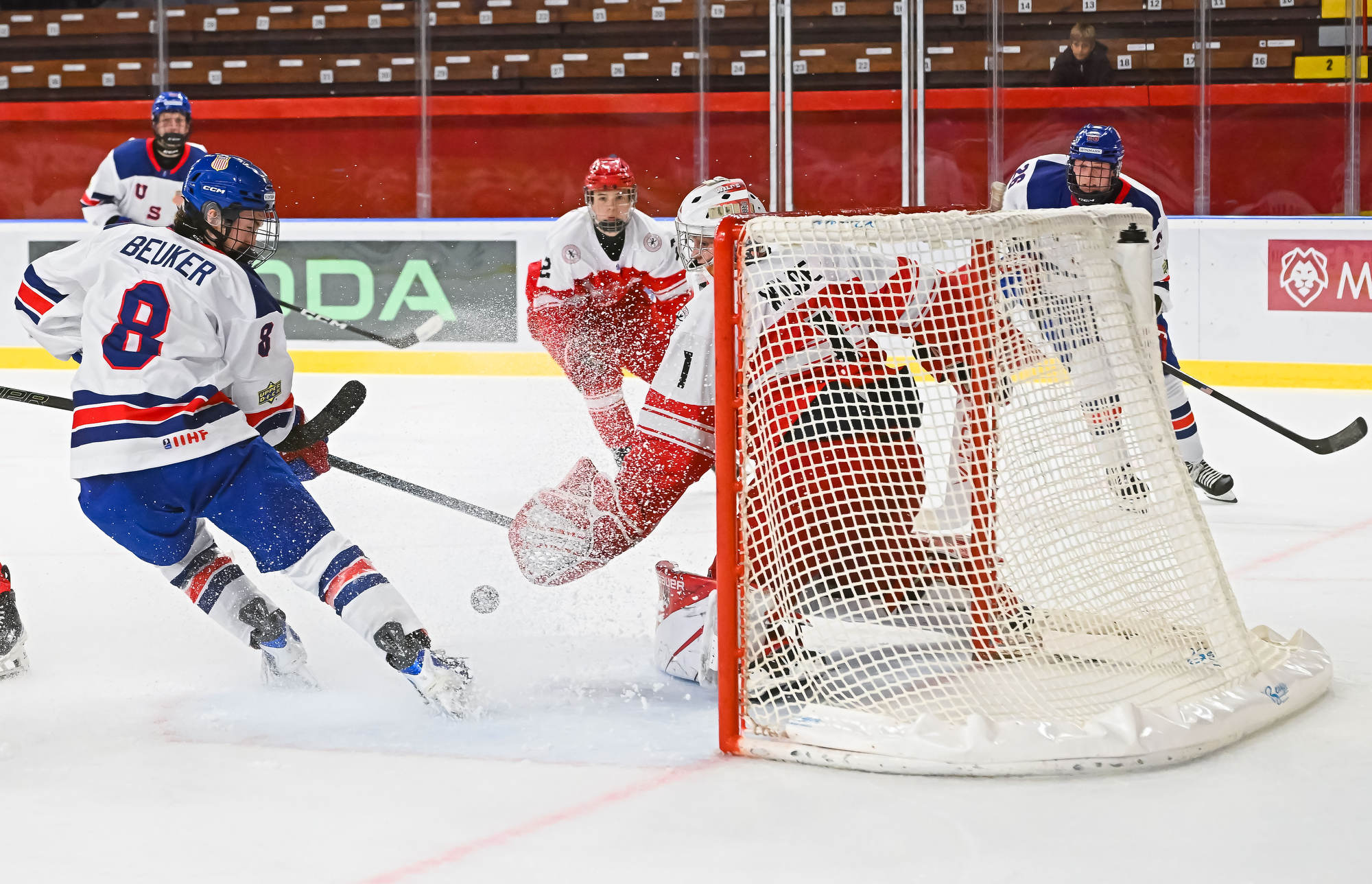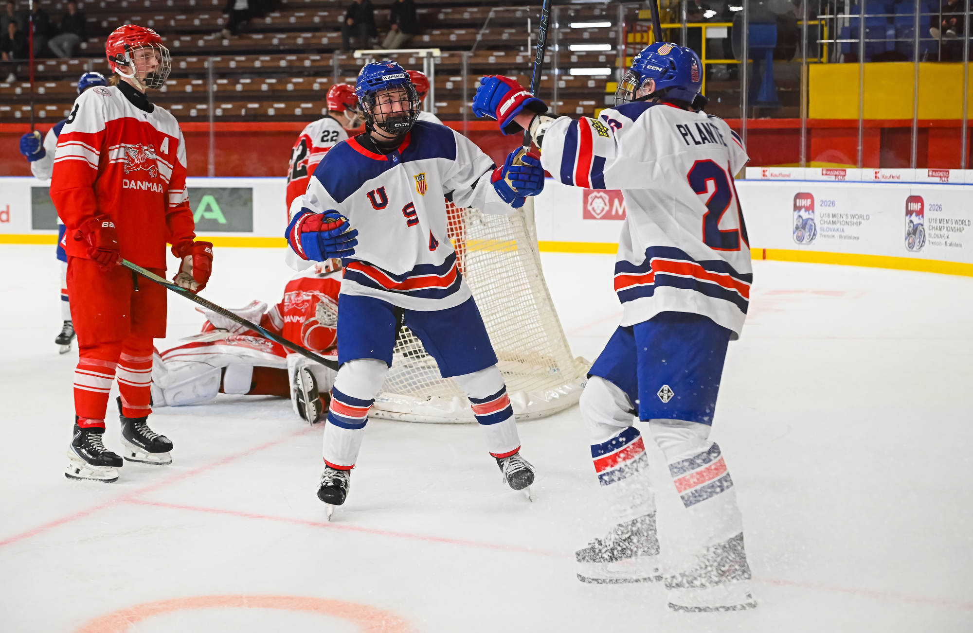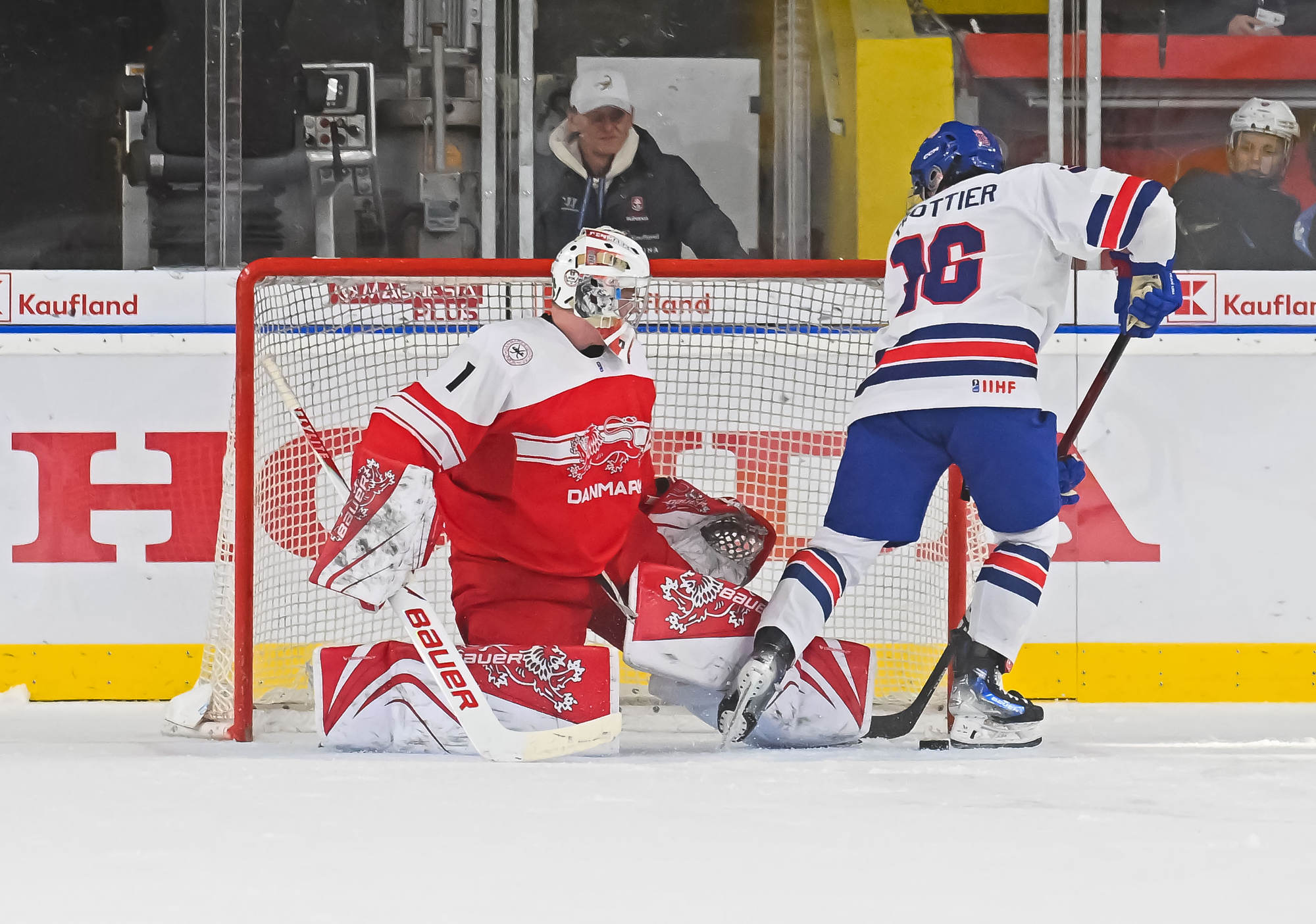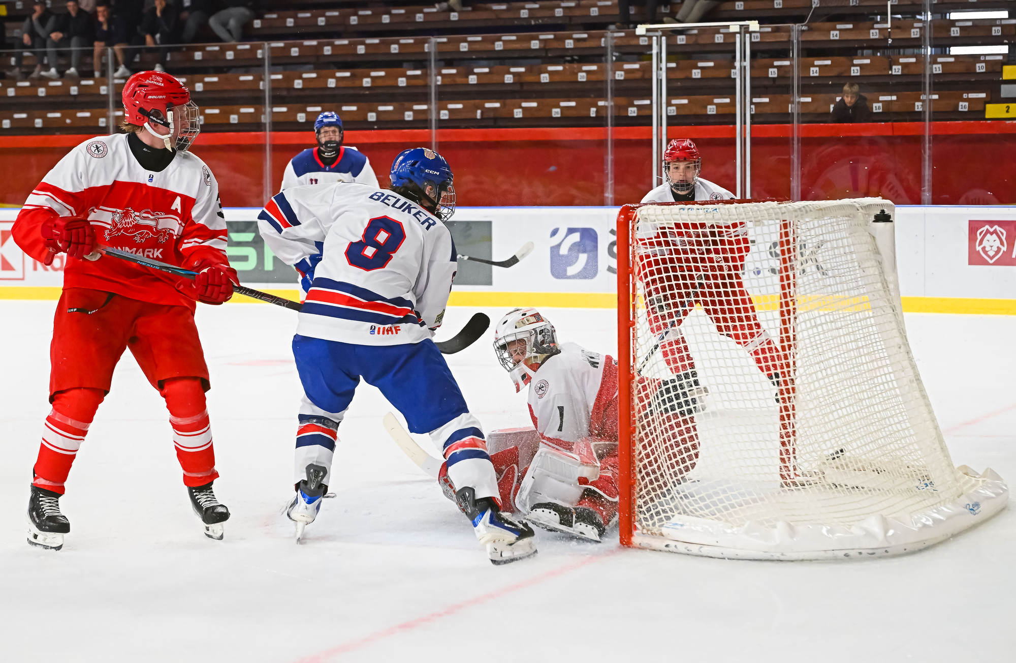 The Americans again held a decisive edge in play in the third period, outshooting the Danes 19-1. Wilde made several more great saves, but the 2-0 goal finally came on a lucky bounce. On the power play, Victor Plante’s centring pass went off the skate of Beuker and in with 3:17 to play.