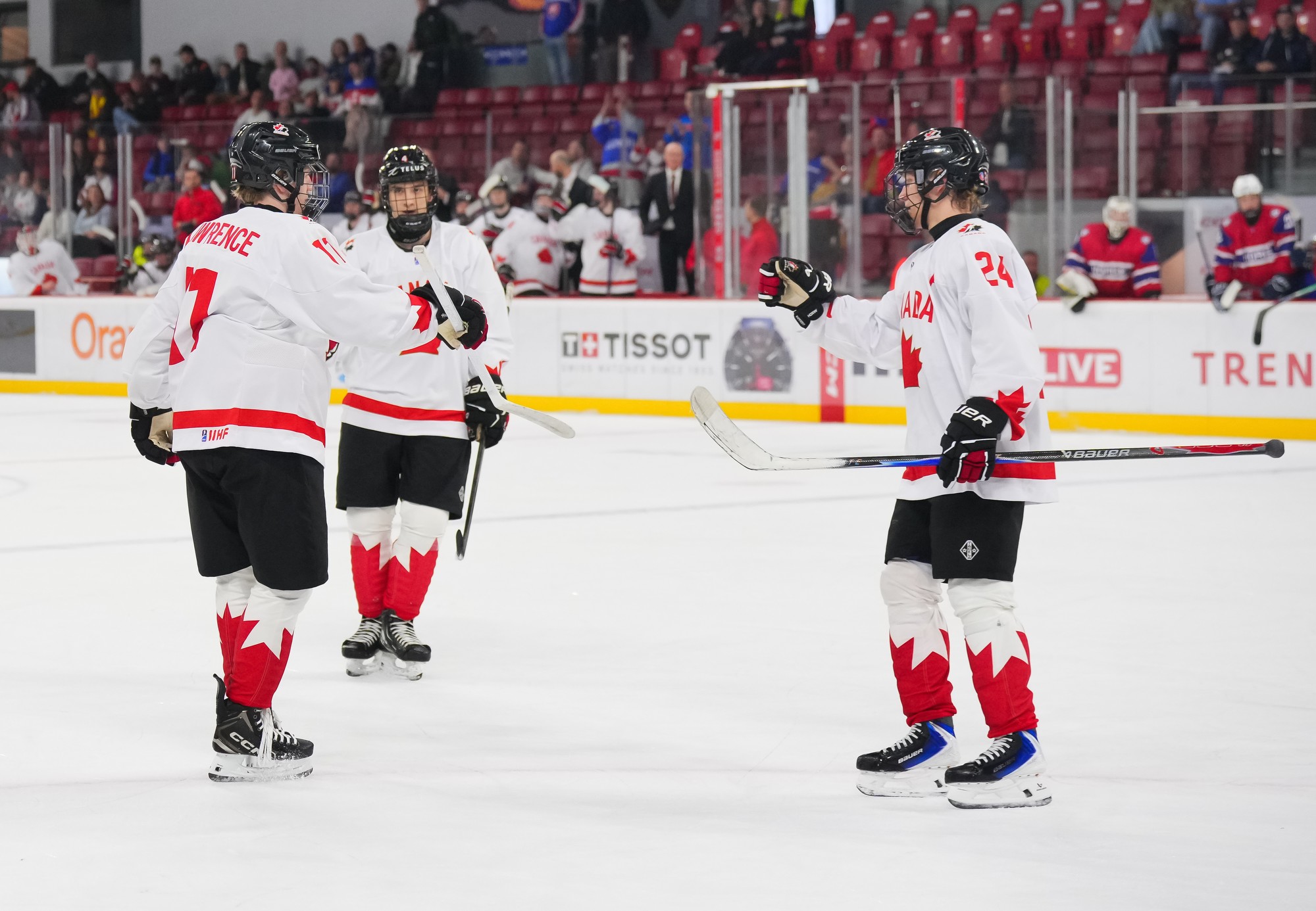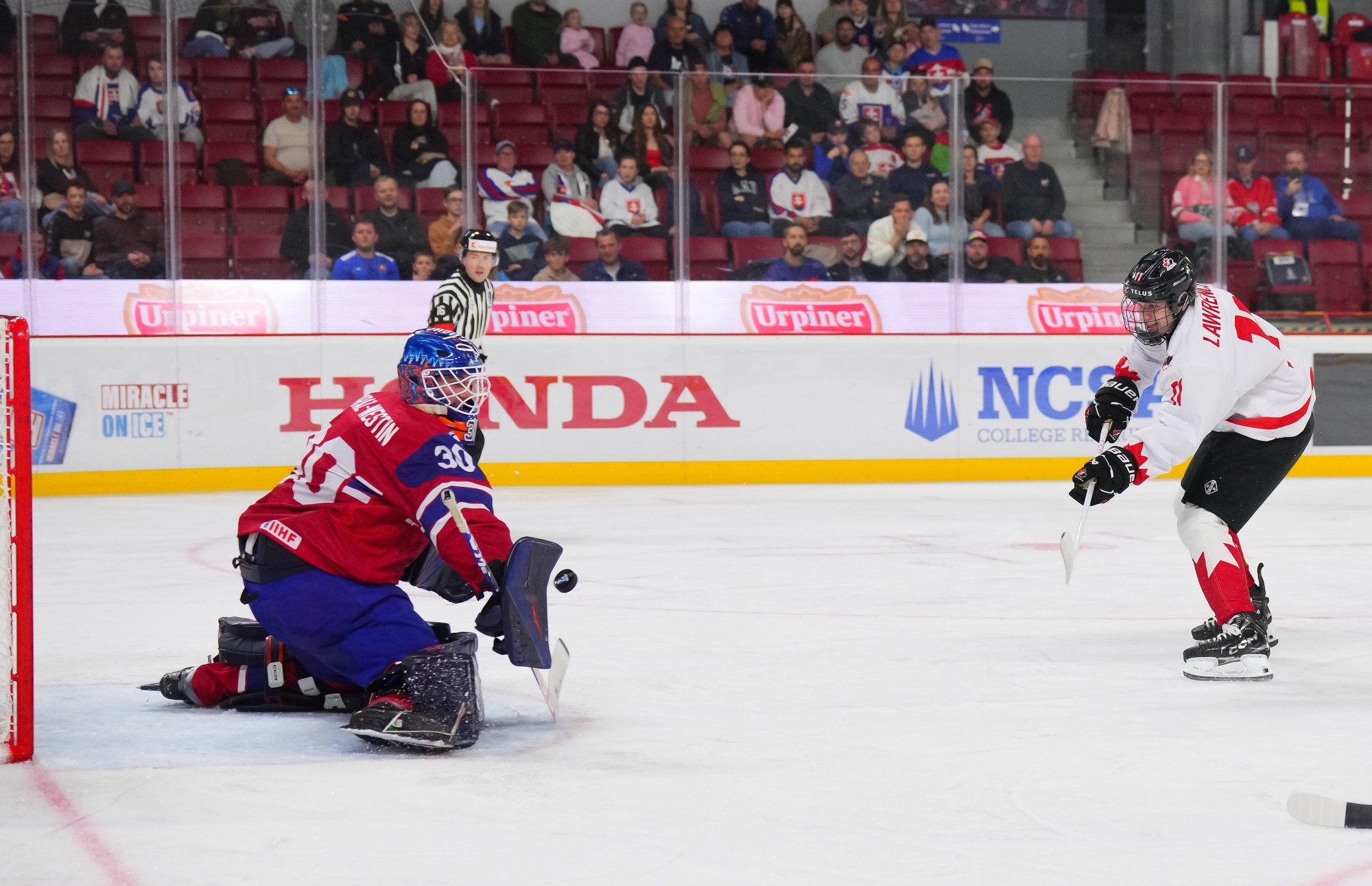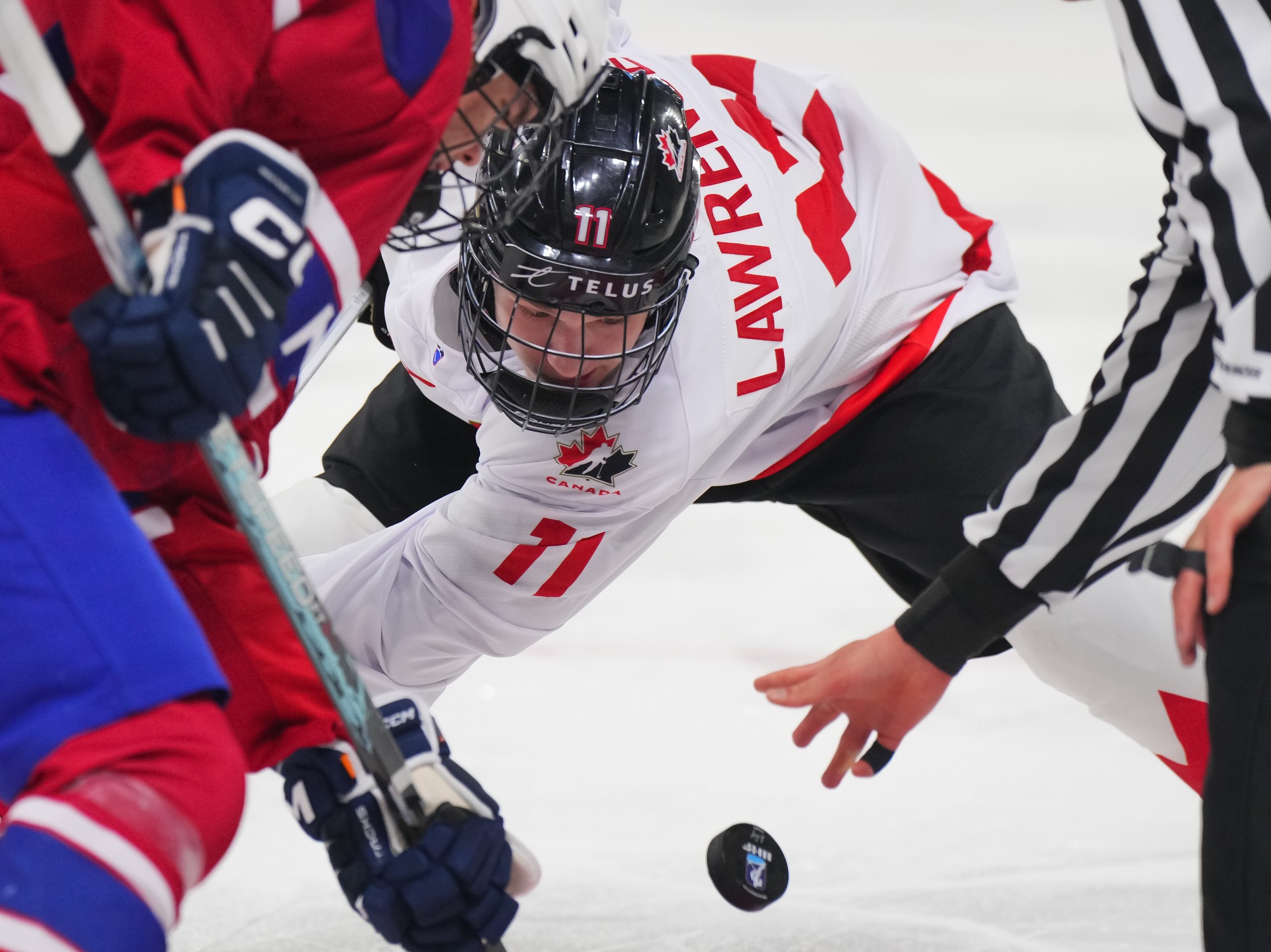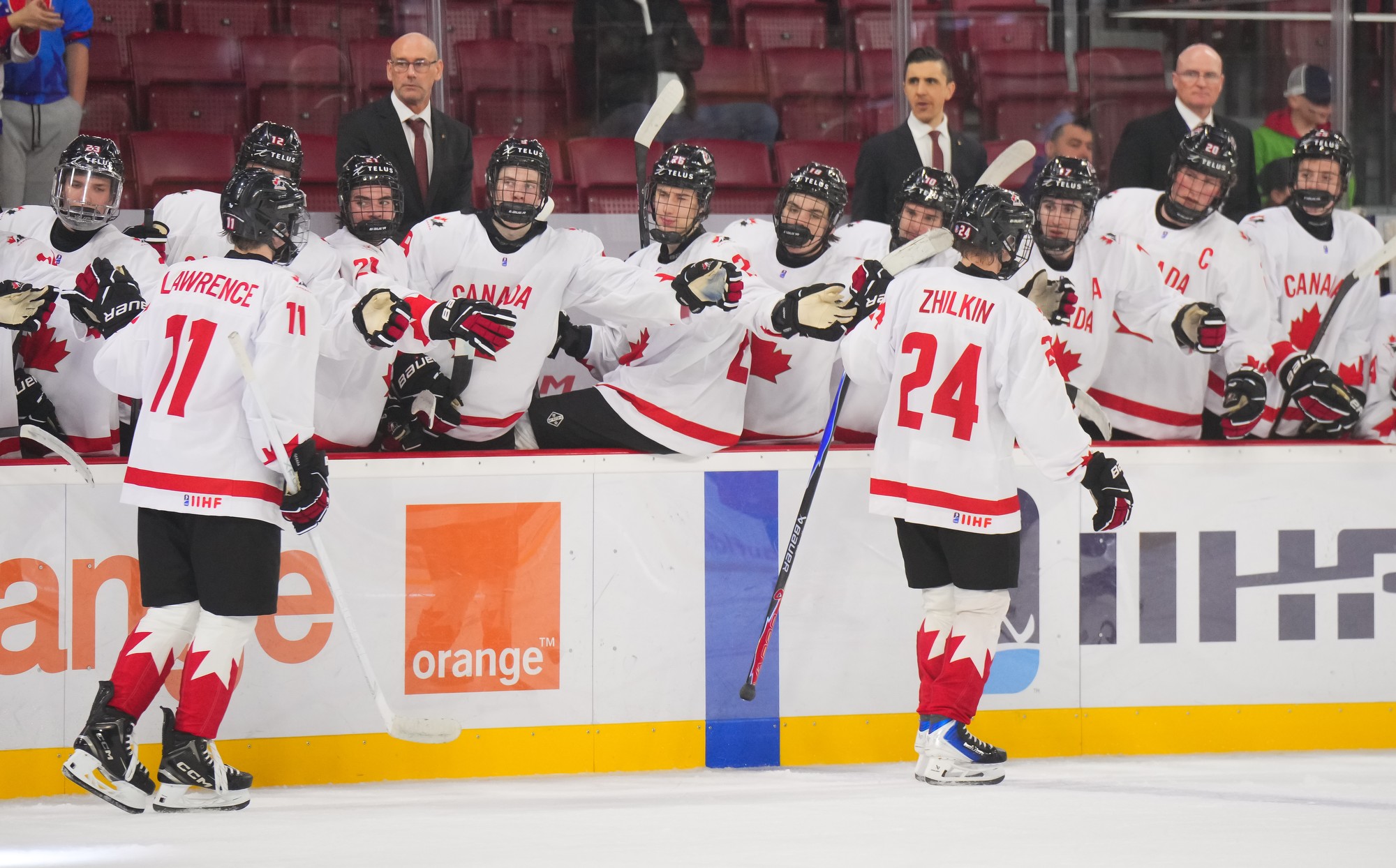 Canada did not have to wait long for more goals. In the 17th minute Zhilkin redirected a Mathis Preston feed into the net, then he assisted as Lawrence added a third just before the intermission for a second power play goal of the game.