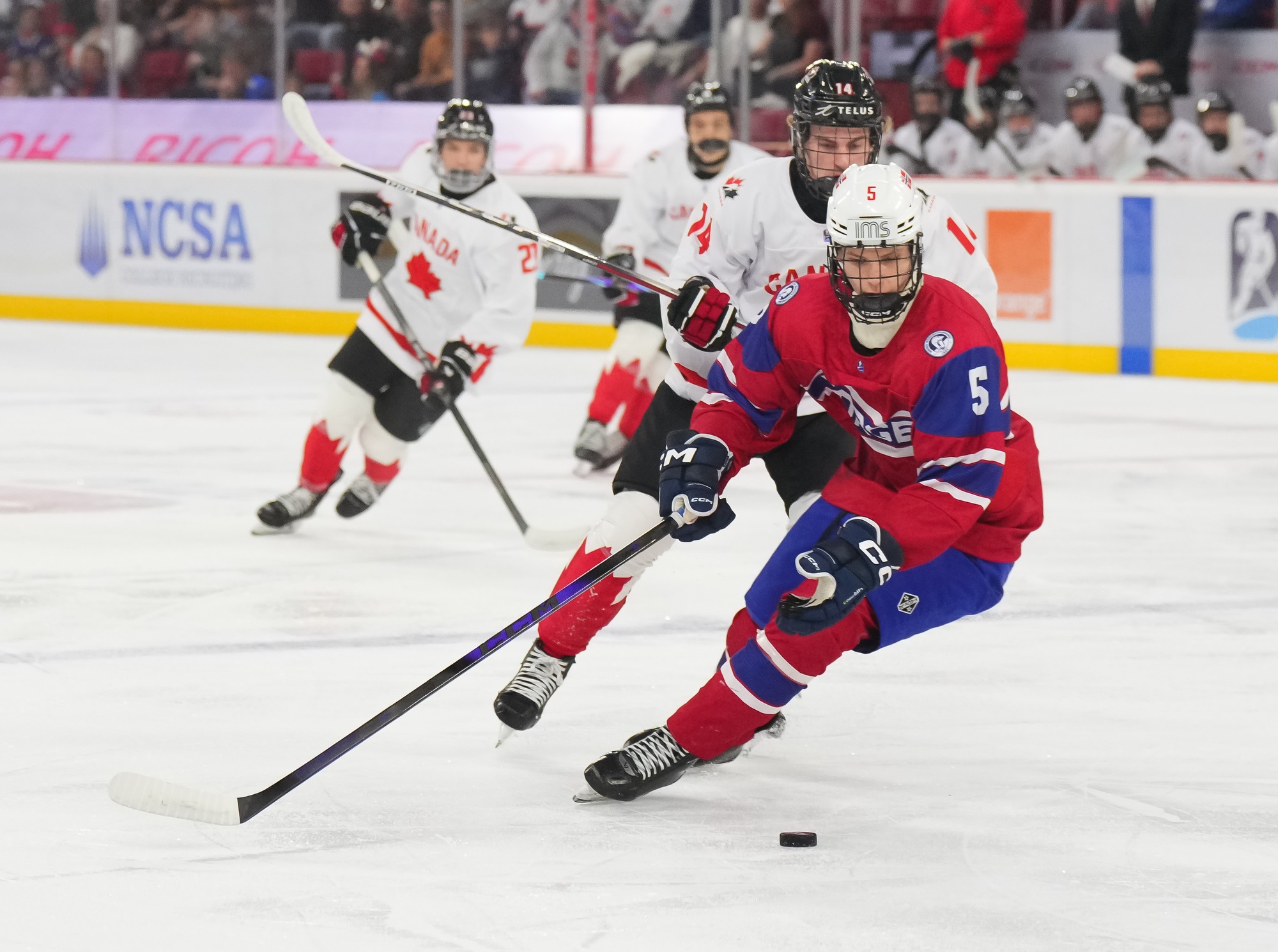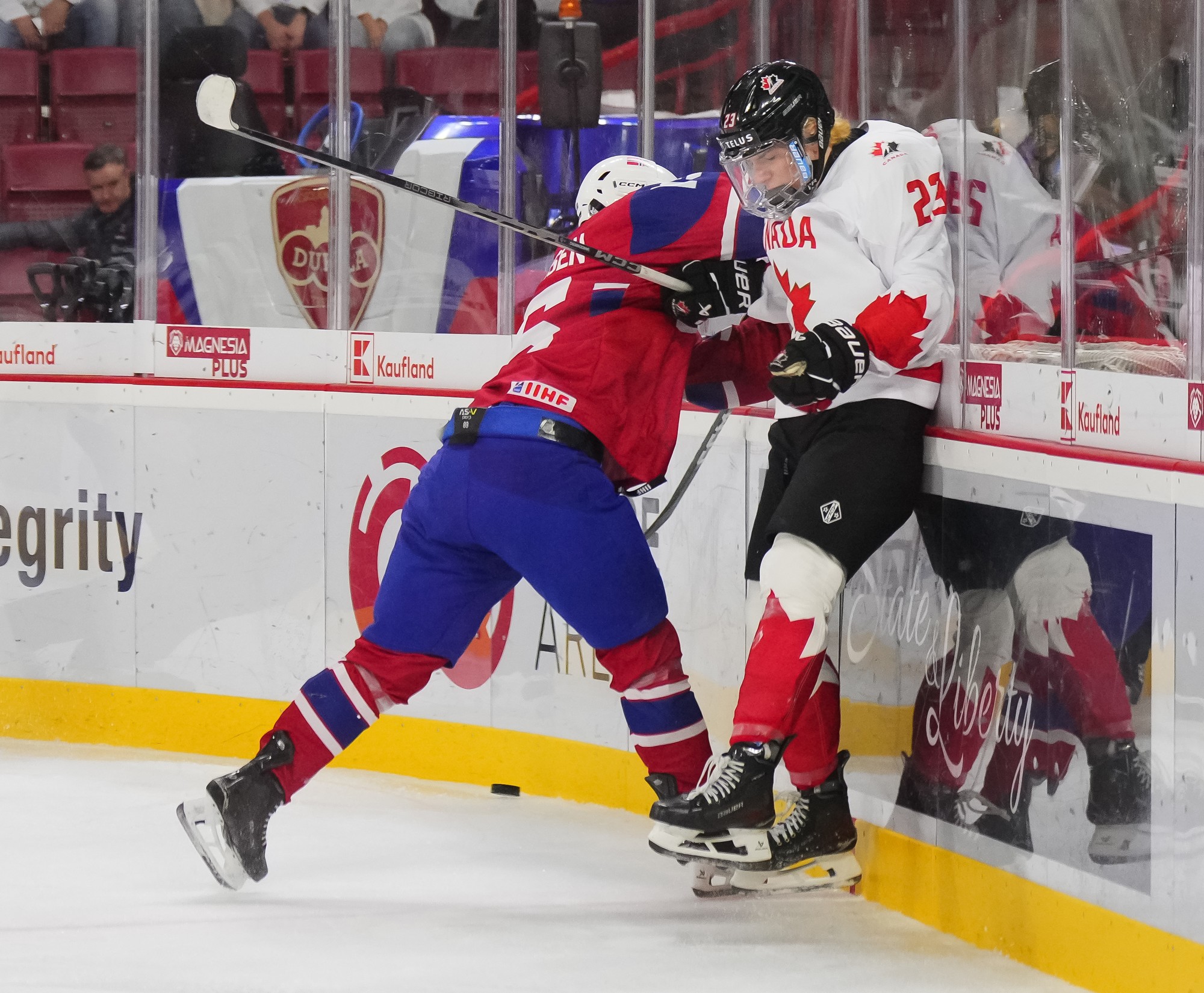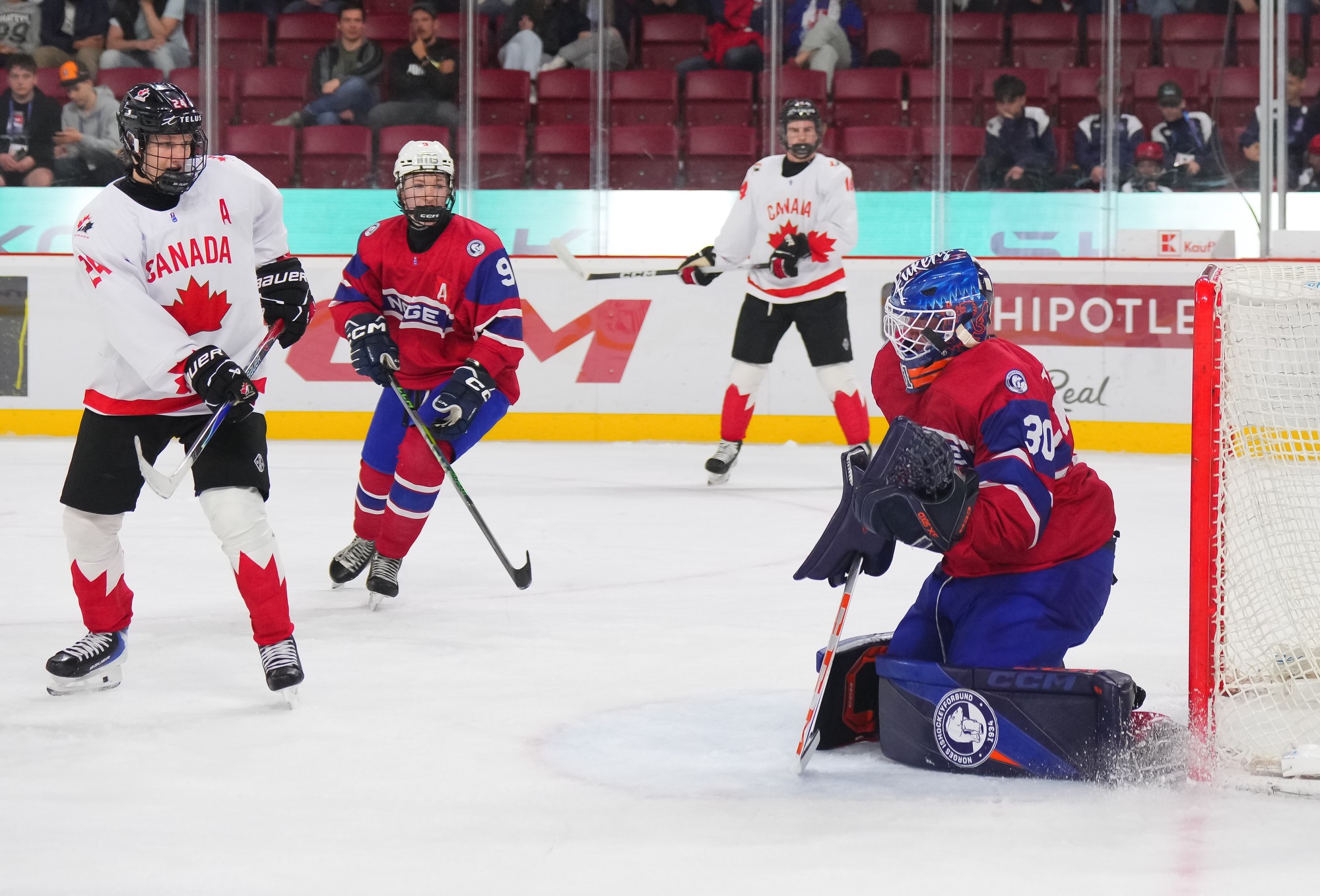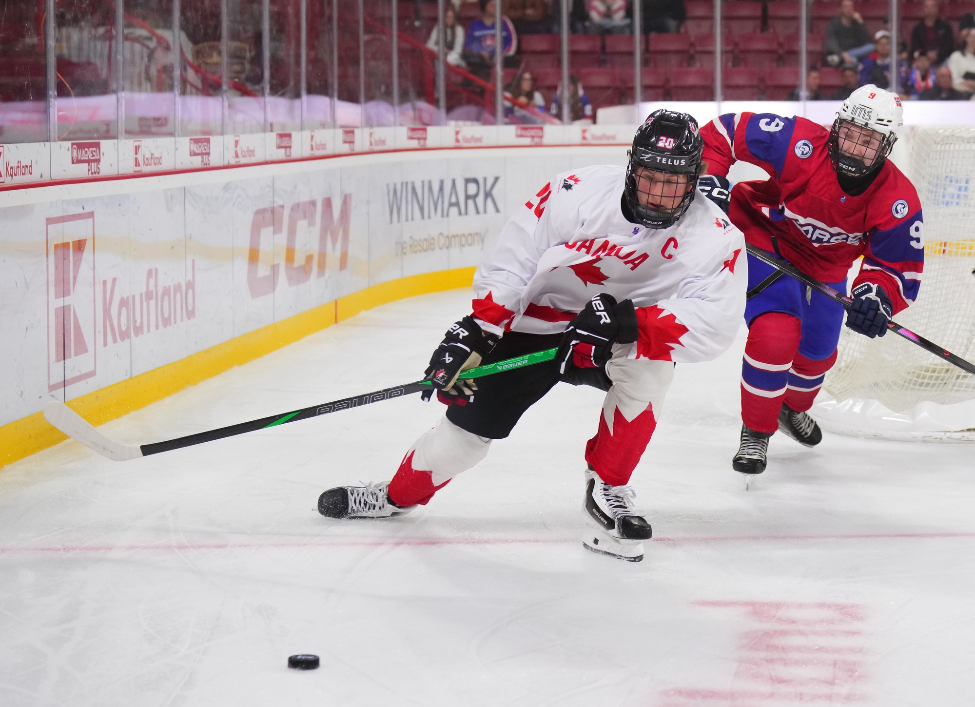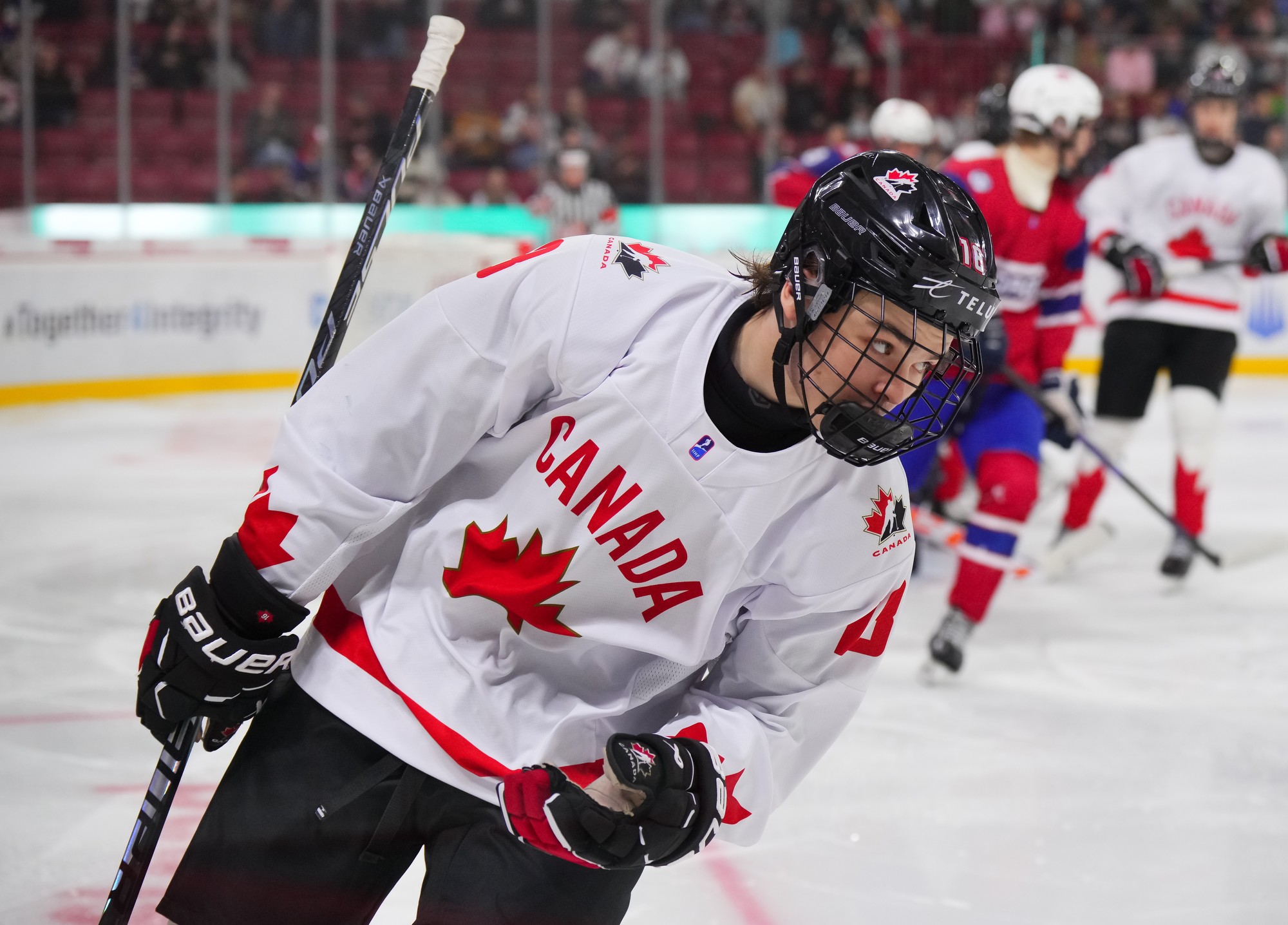 Canada did not have to wait long for more goals. In the 17th minute Zhilkin redirected a Mathis Preston feed into the net, then he assisted as Lawrence added a third just before the intermission for a second power play goal of the game.