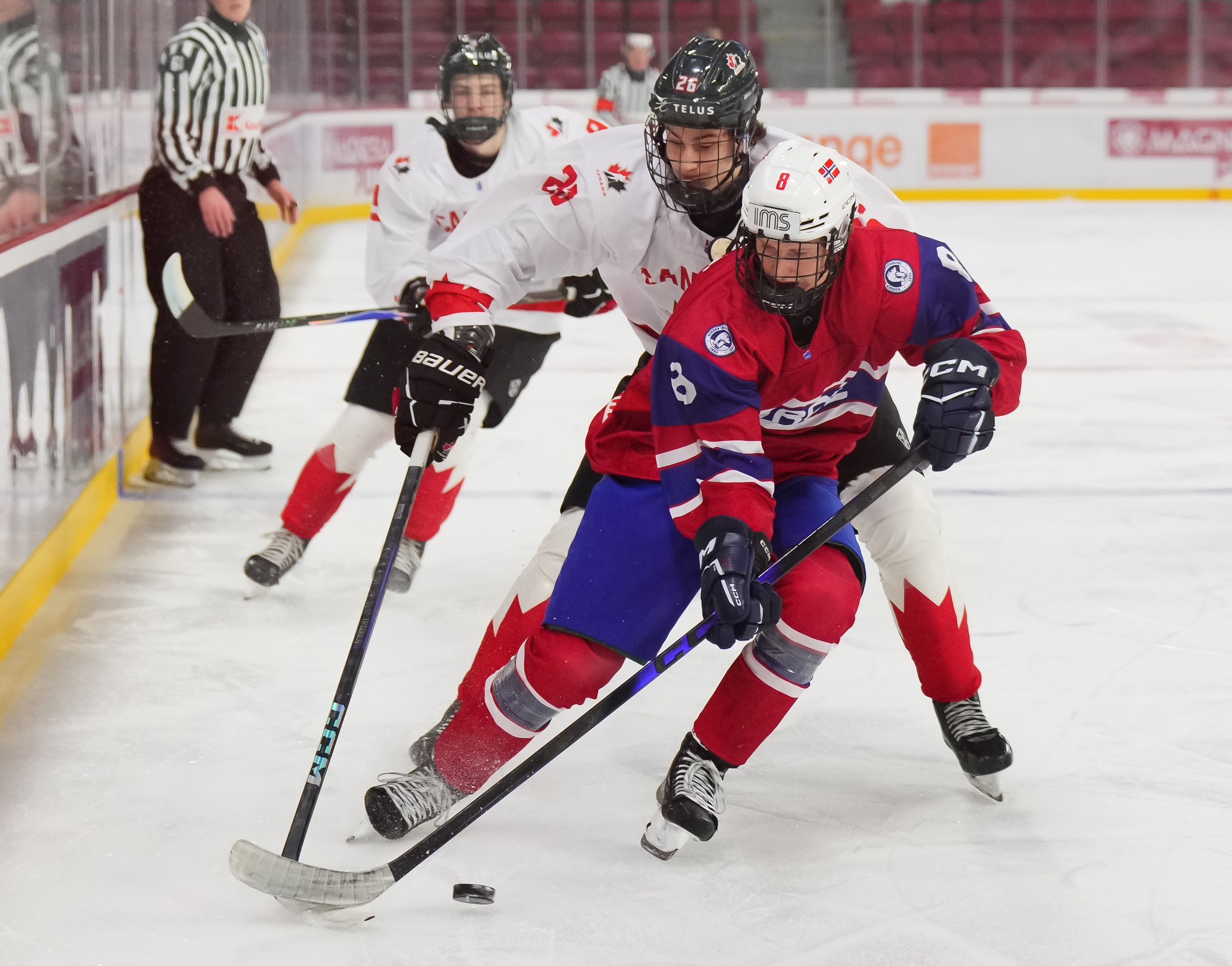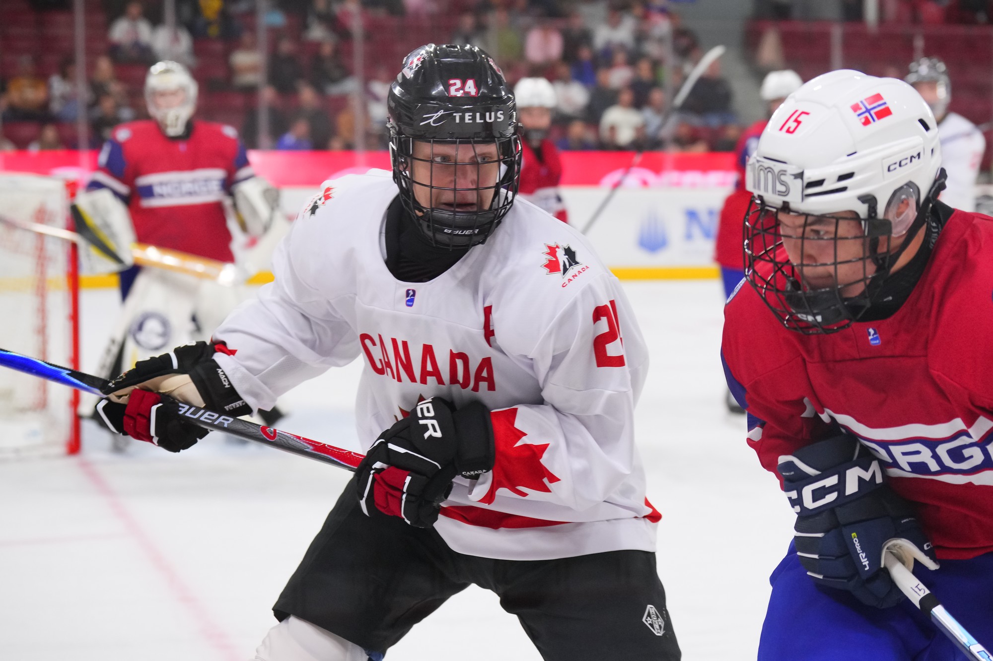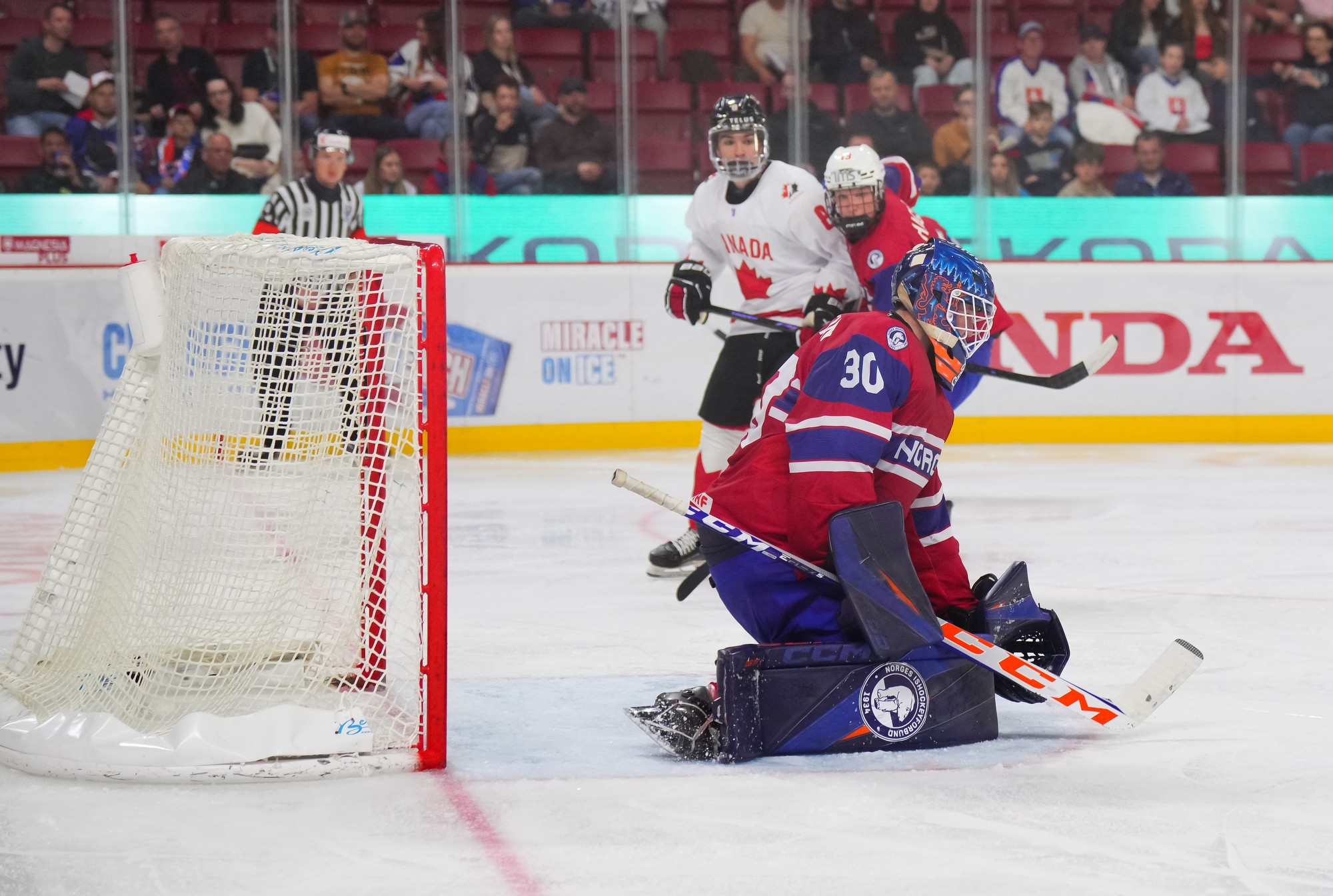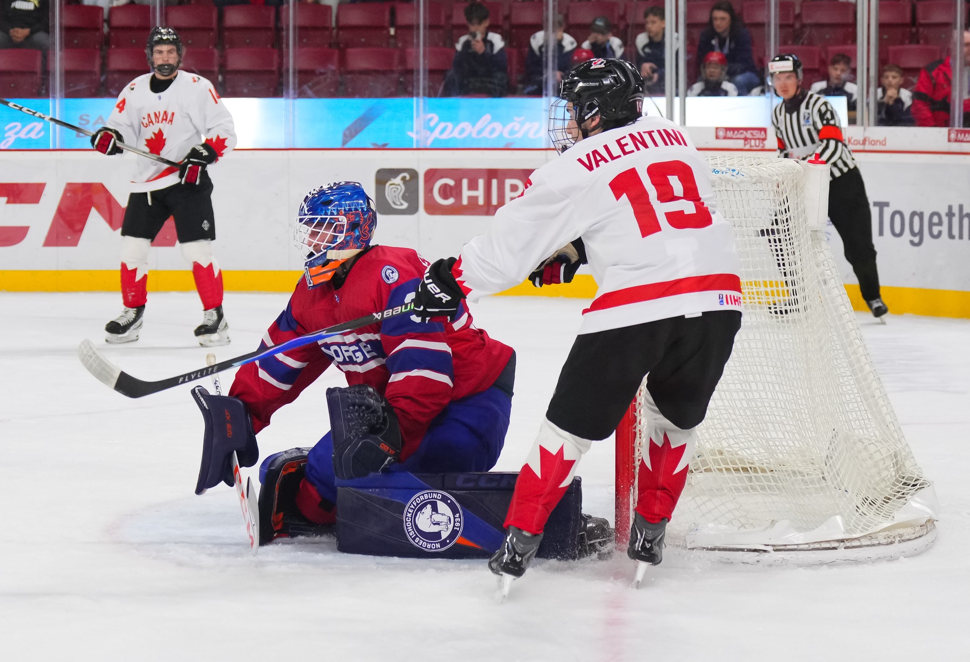 It took Canada a few shifts to settle into its game and in that time Norway managed a couple of half chances. However, the underdog could not seriously trouble Gavin Betts, who was back in the Canadian net after leaving the opening night loss to Slovakia with cramp.