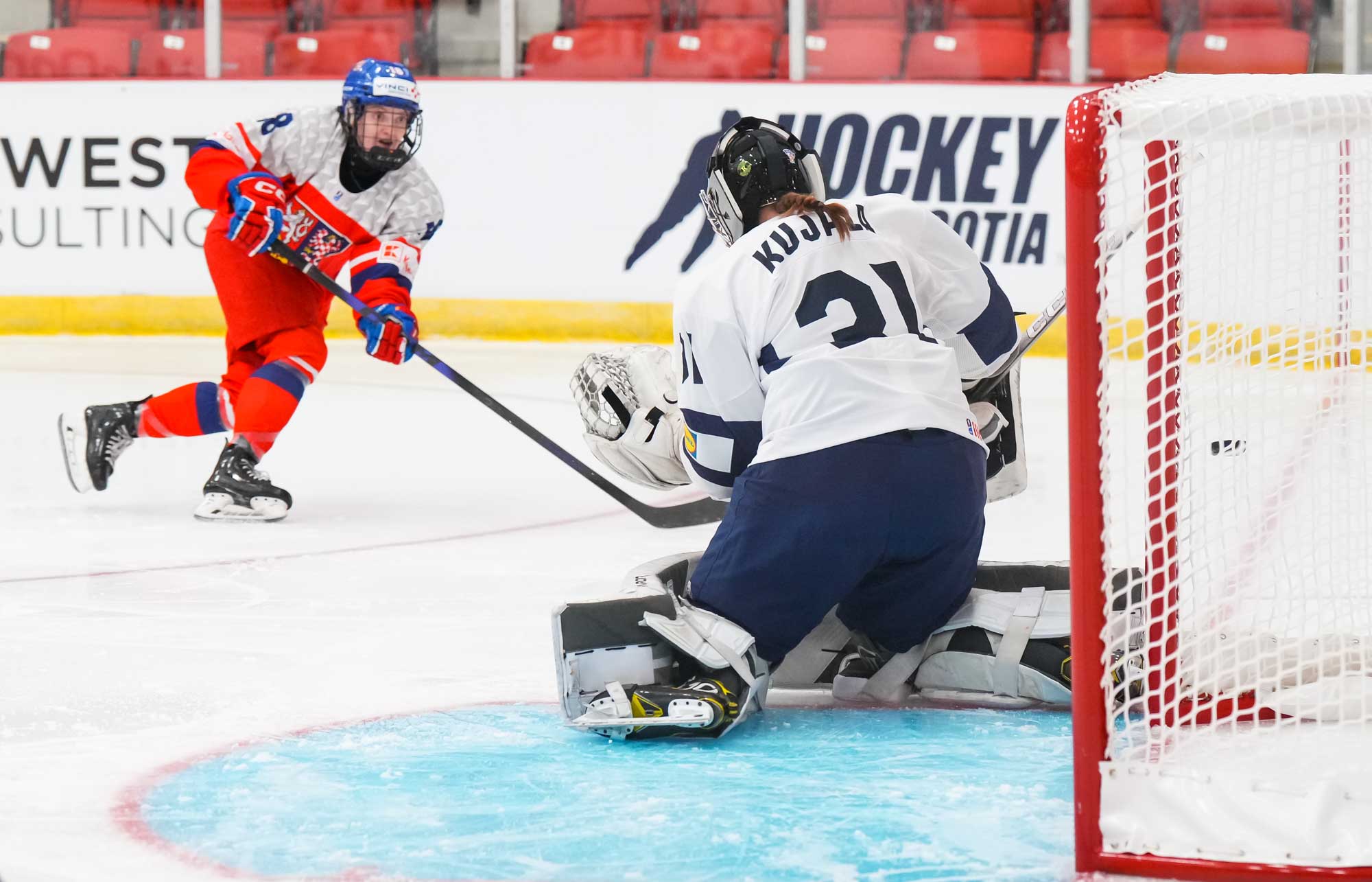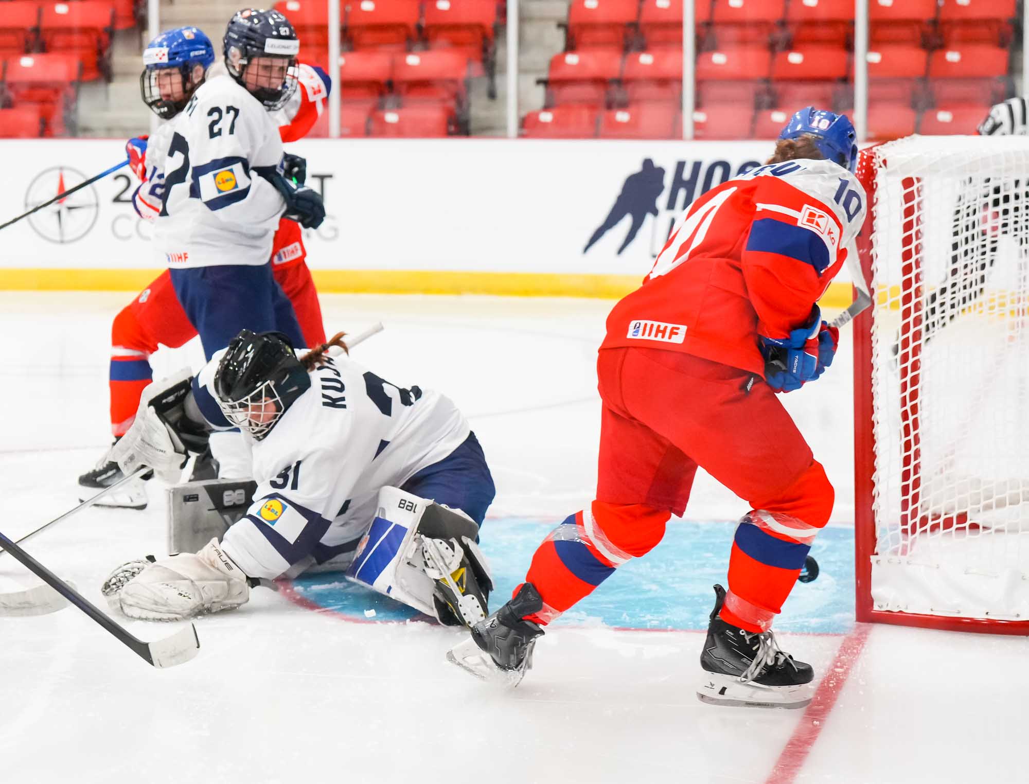 The Czech offense caught fire in the third, with five goals before Kujala was pulled in favor of Saimi Pesola with 3:52 remaining. Sindelarova started the onslaught, followed by Dana Brezinova with a spectacular power-play effort. Gildainova followed up with her second of the day, shorthanded, with 7:12 remaining, then Ellen Jarabkova got her first before Mynarikova logged her second to end Kujala's day.