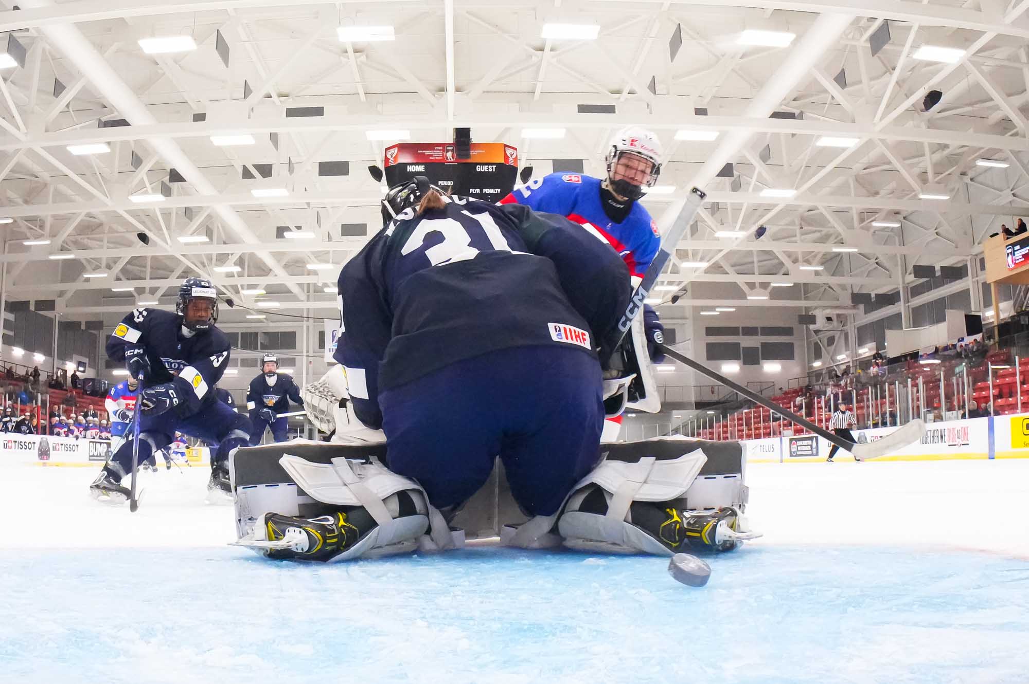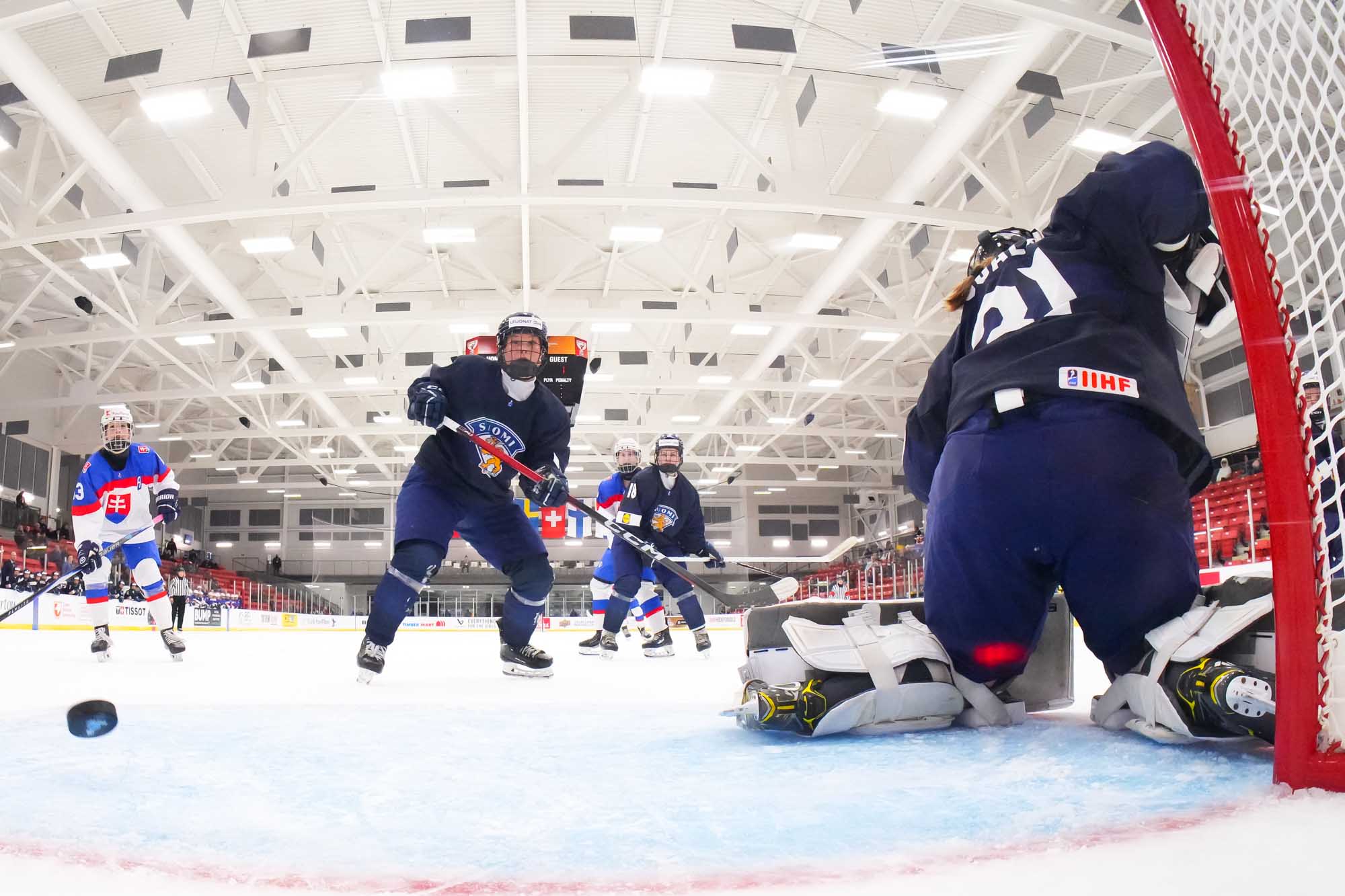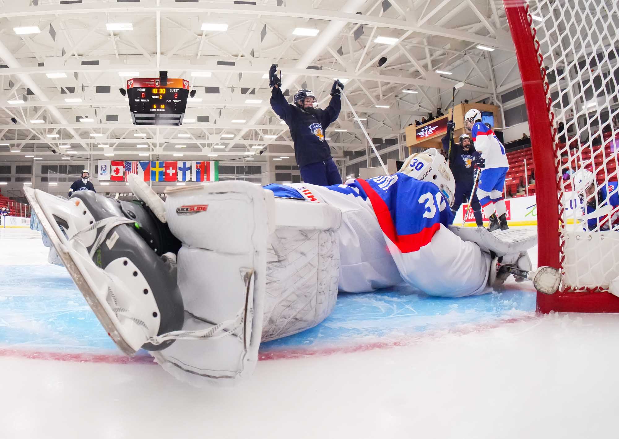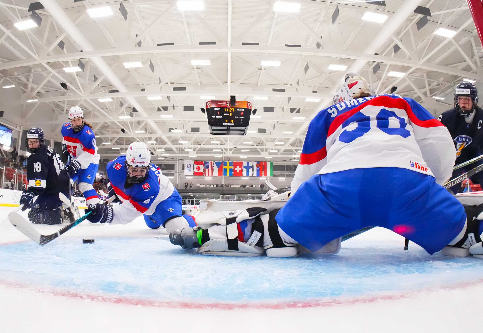 Returning to action barely 24 hours after facing 52 shots in two periods against the Americans on Saturday, Slovak goaltender Mariana Sumegova was steady in earning the win, making 20 saves. Eerika Kujala stopped 24 shots.