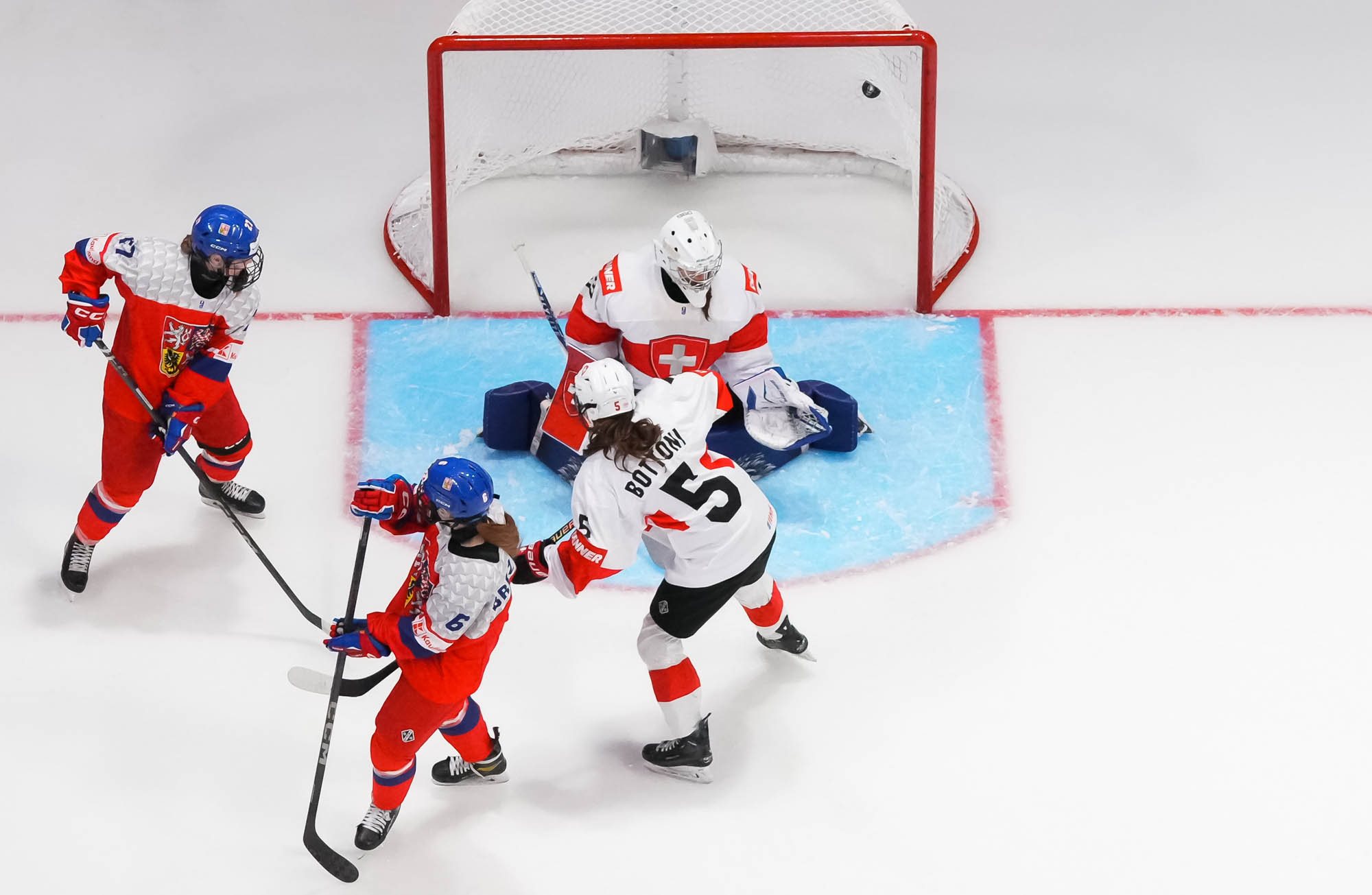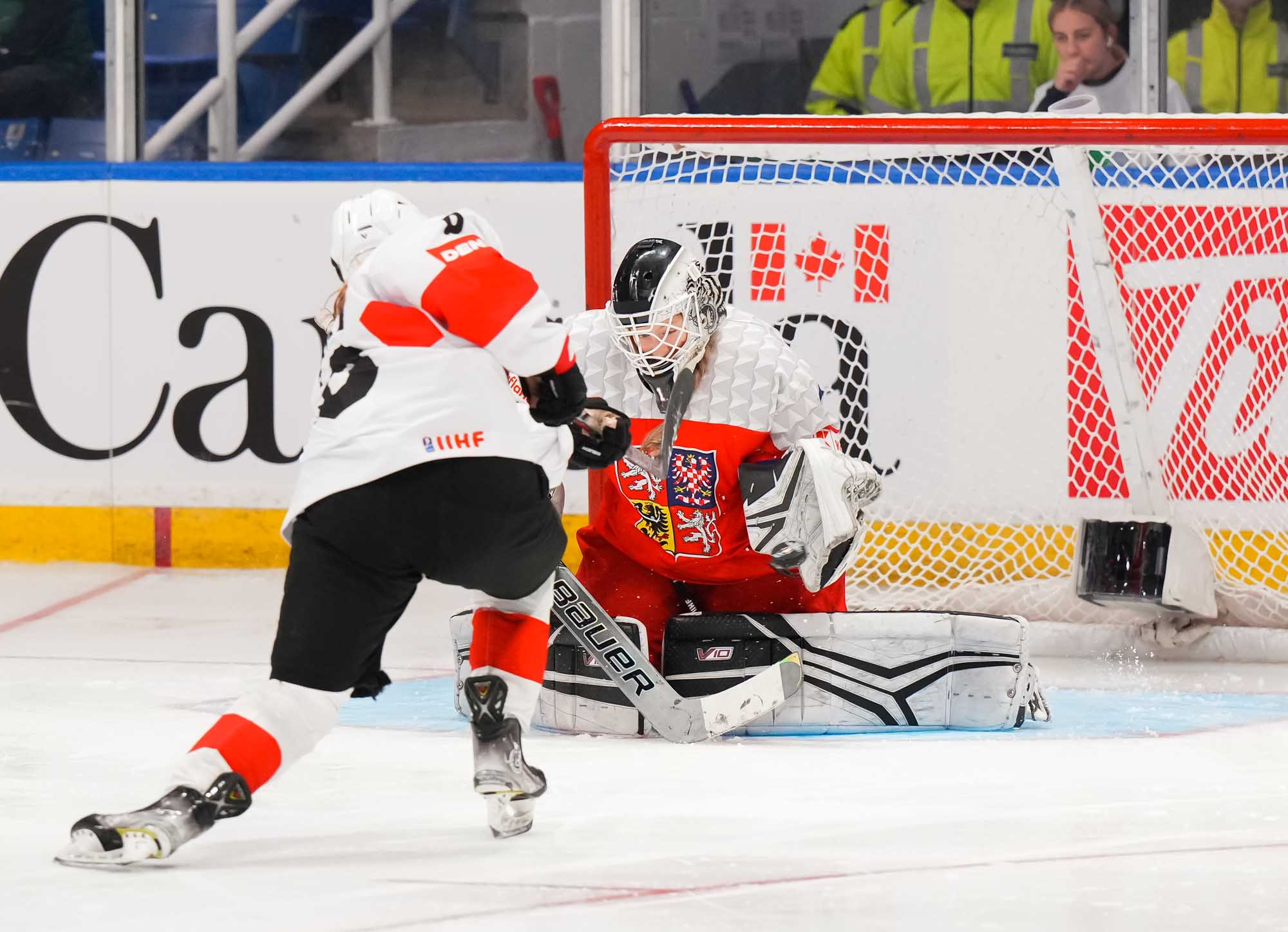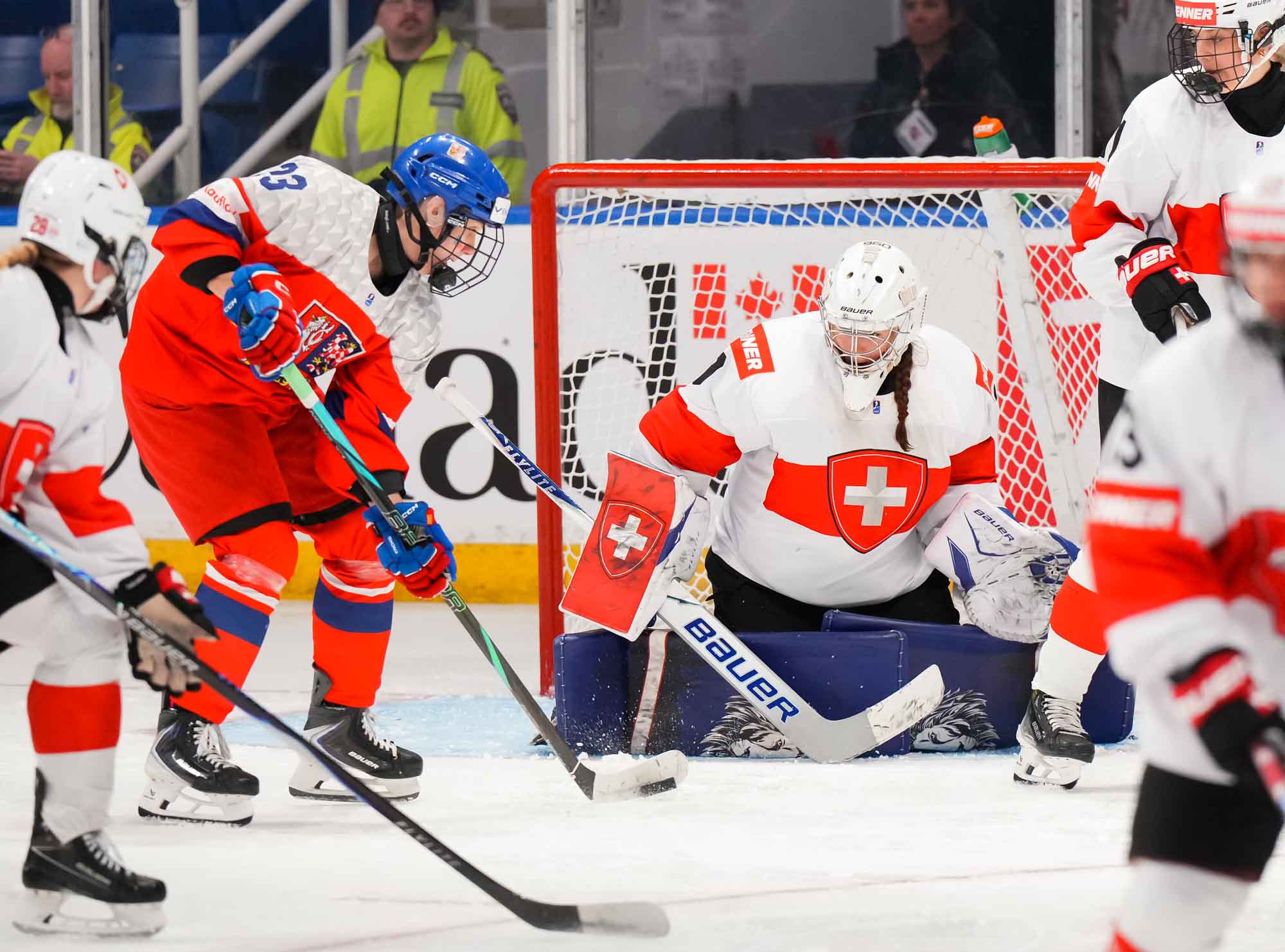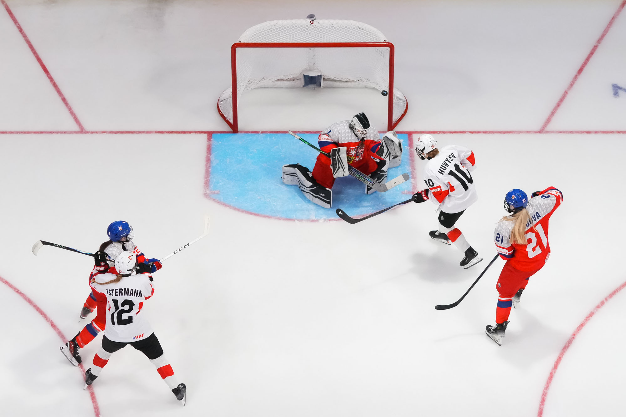 Later in the period, Czech Adela Krenkova slid the puck through the crease and out the other side, a dangerous moment but ultimately harmless. The Swiss, however, finally connected at 13:40 when Jill Baker got the puck at the top of the circle, took a look, and wired a hard shot over the glove of Lili Chmelarova for the opening goal.