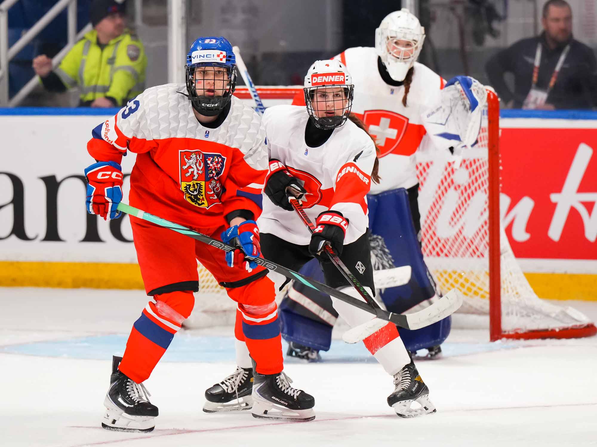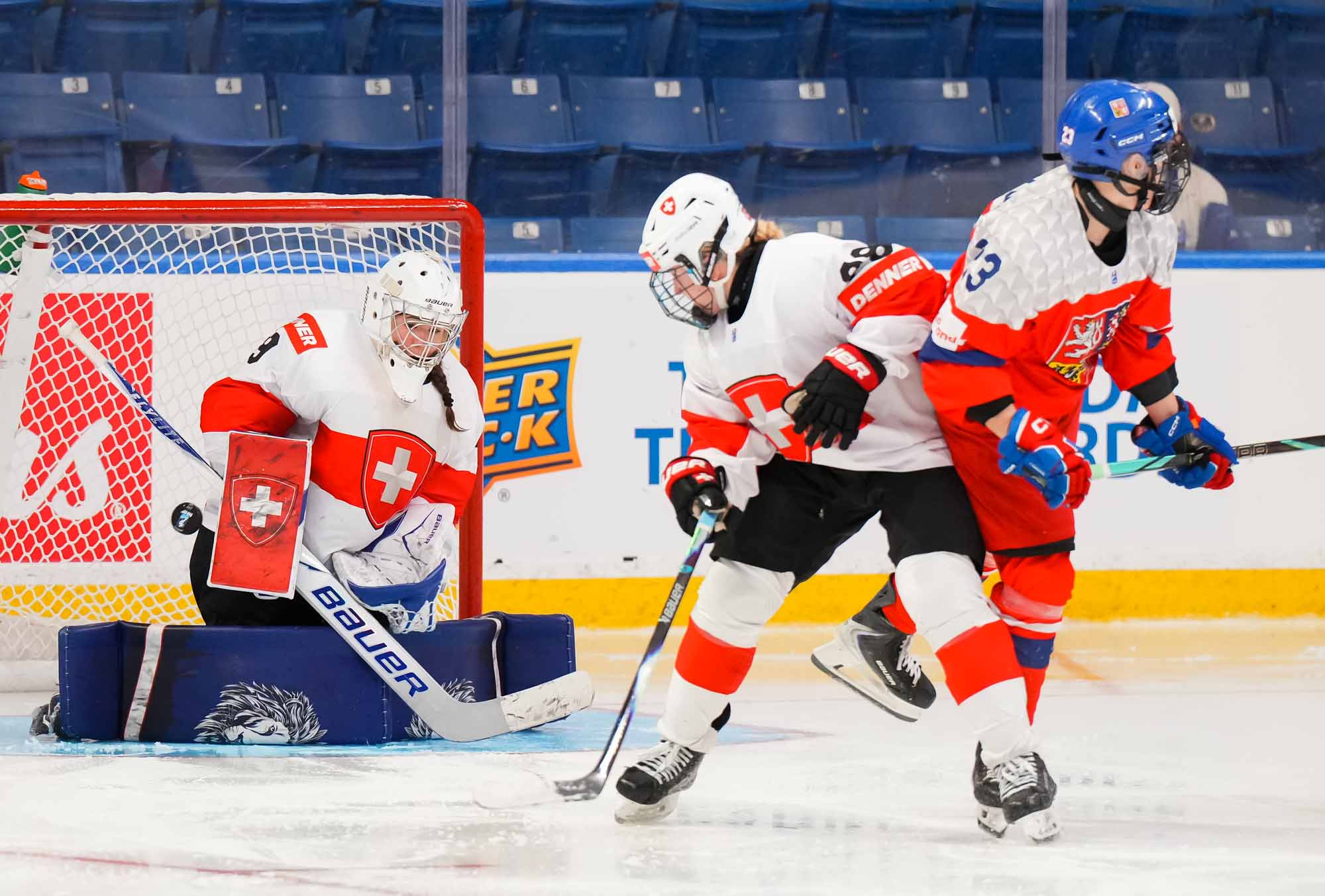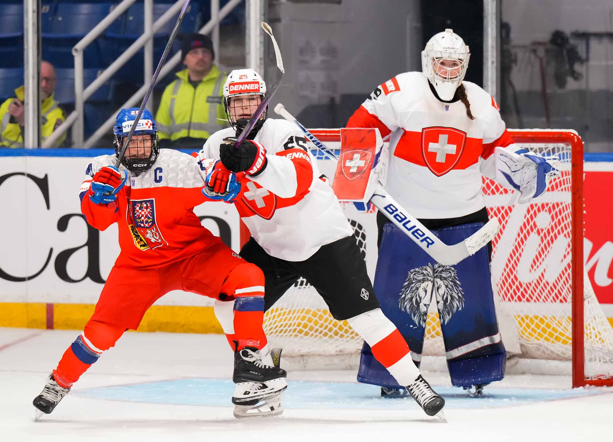 Later in the period, Czech Adela Krenkova slid the puck through the crease and out the other side, a dangerous moment but ultimately harmless. The Swiss, however, finally connected at 13:40 when Jill Baker got the puck at the top of the circle, took a look, and wired a hard shot over the glove of Lili Chmelarova for the opening goal.