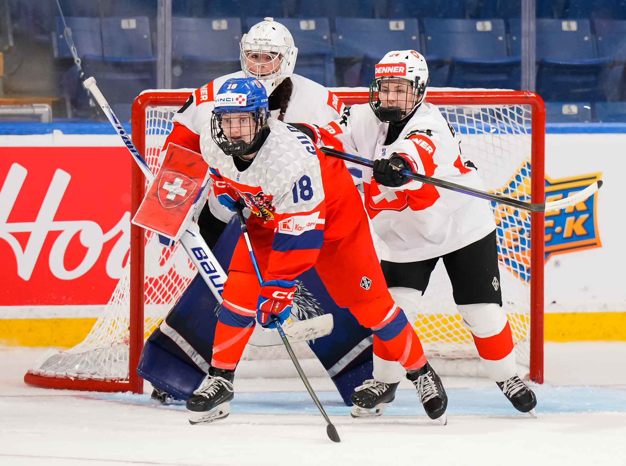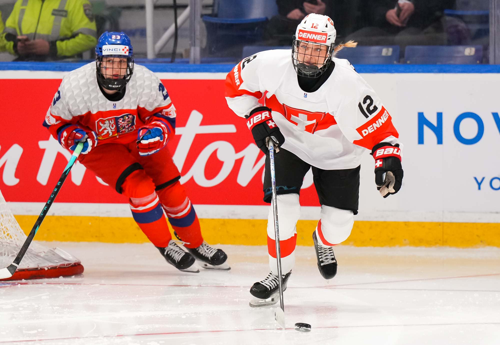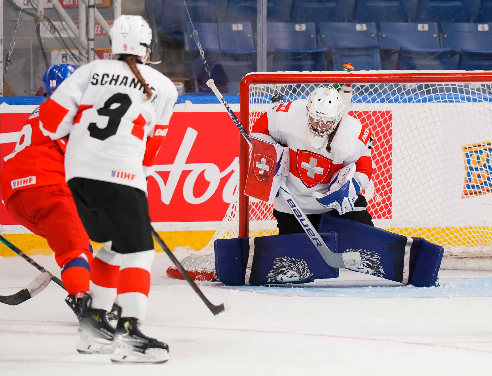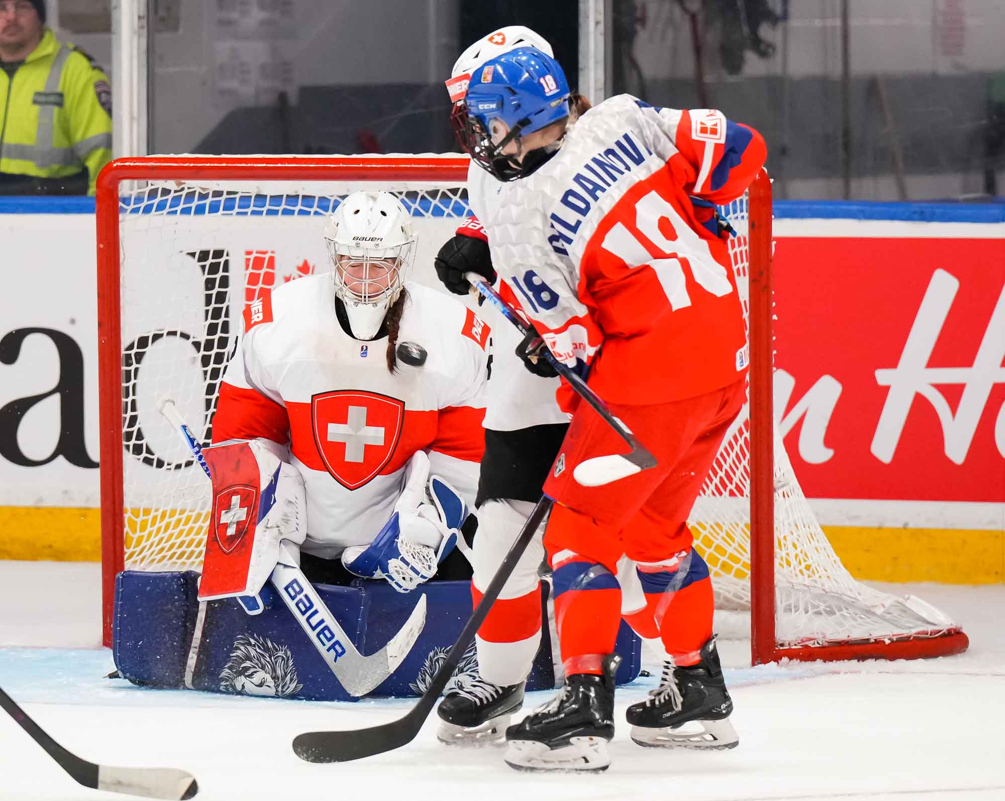 Captain Norina Muller, who was the hero two nights ago against Hungary with the only two goals in a 2-0 win, almost got the Swiss on the board early. She got a clear break on goal but fired the puck high over the cage.