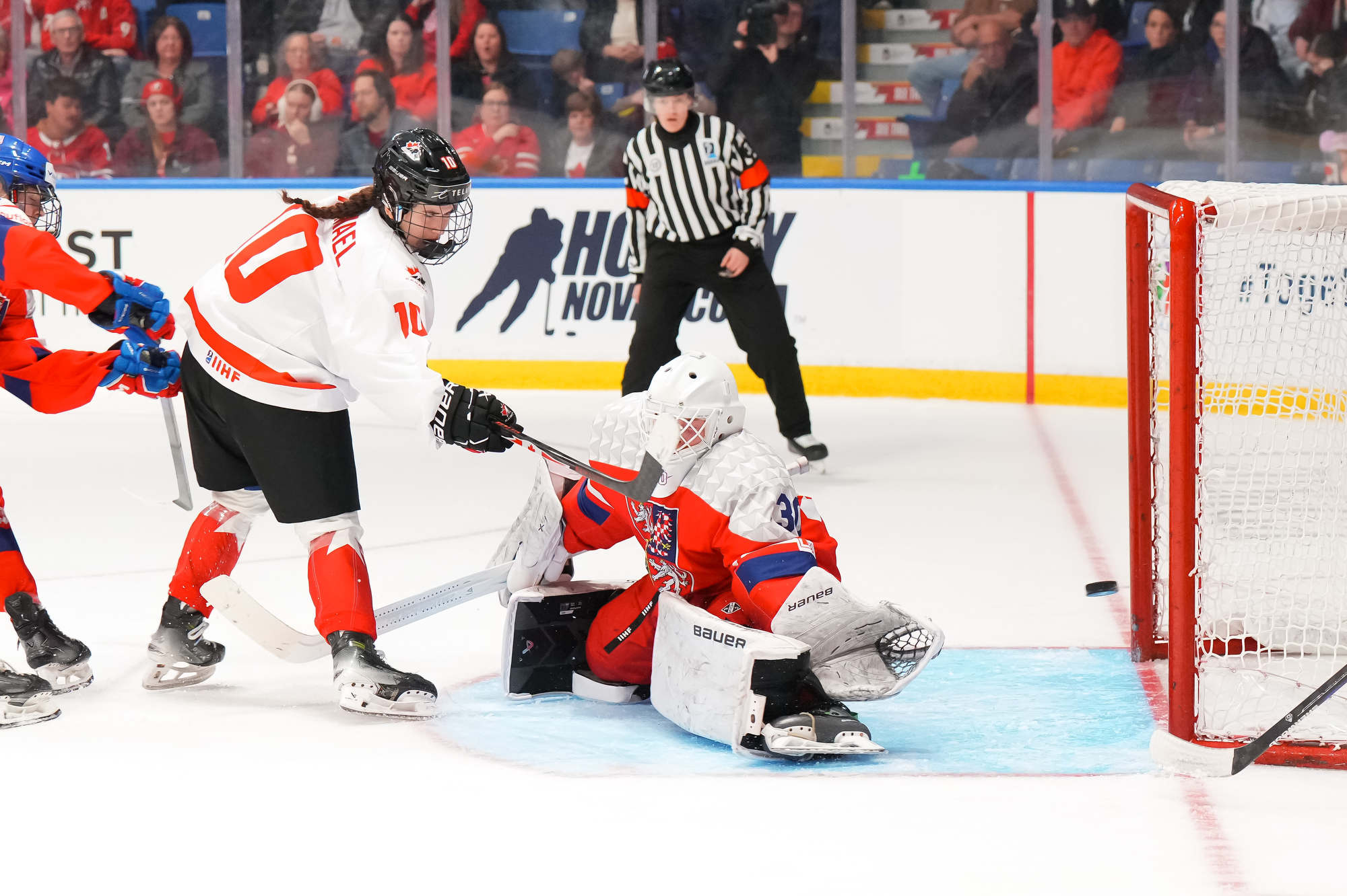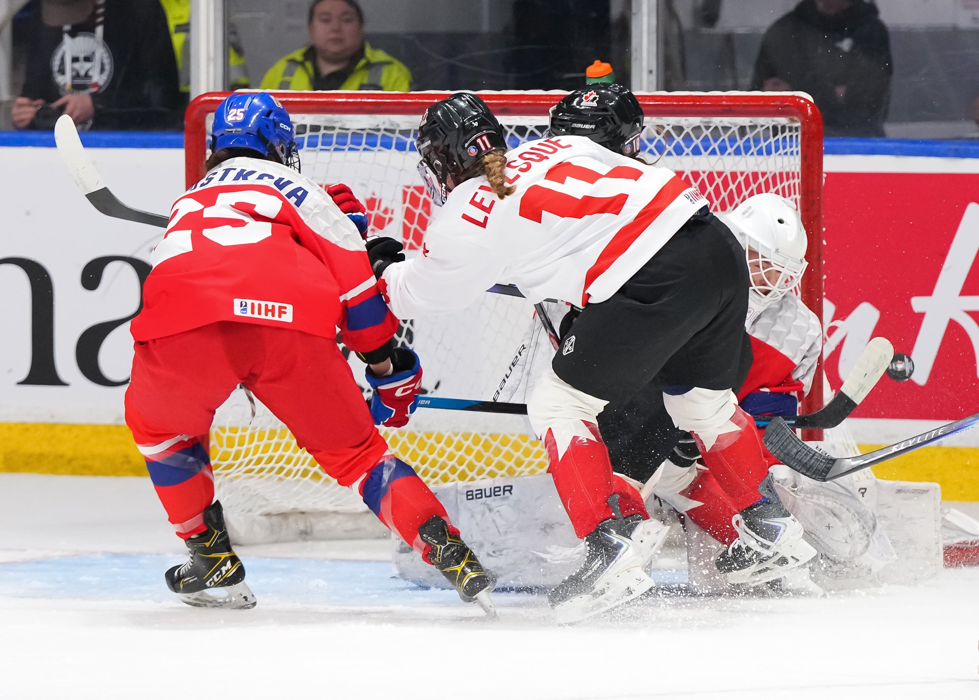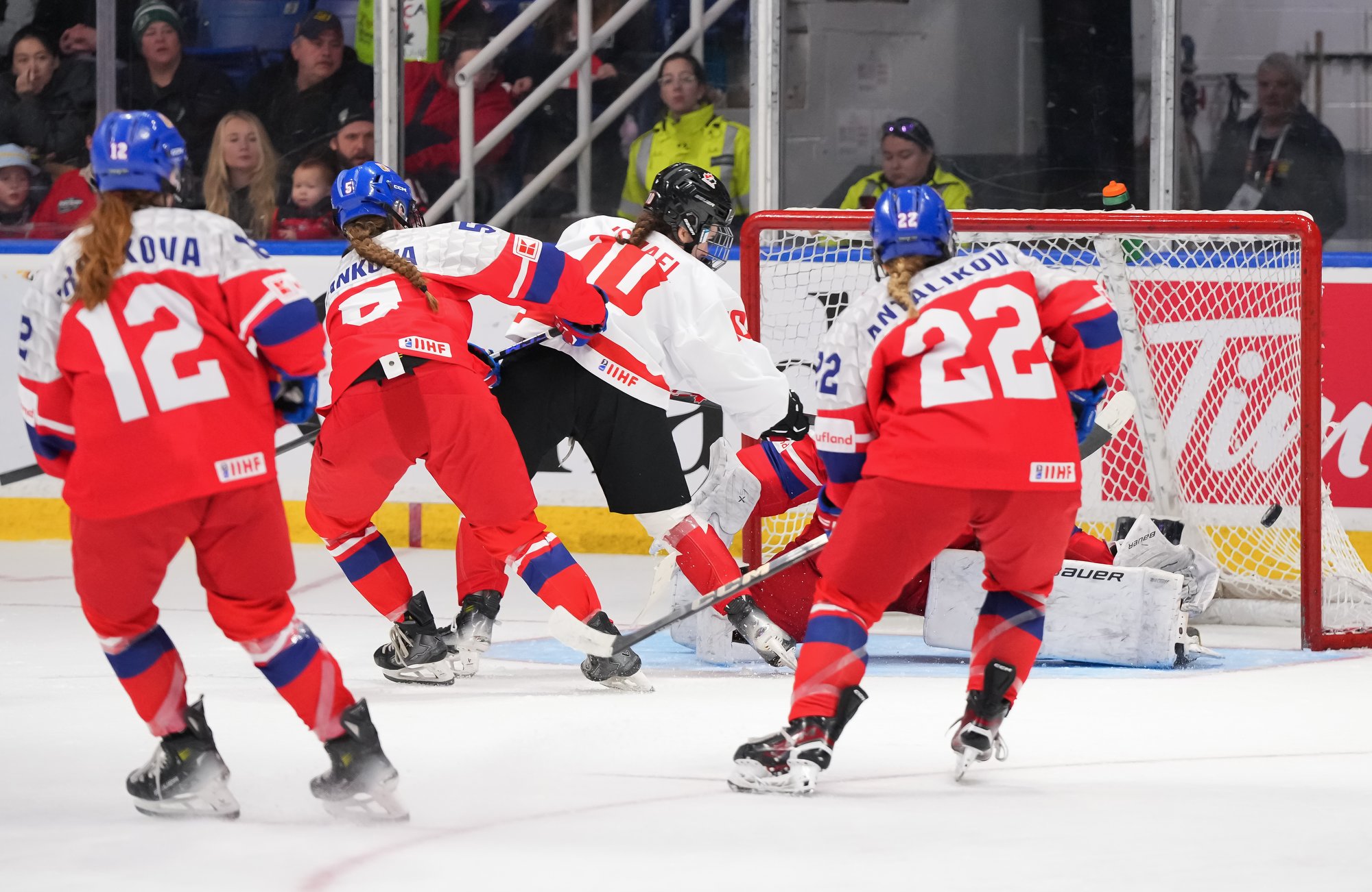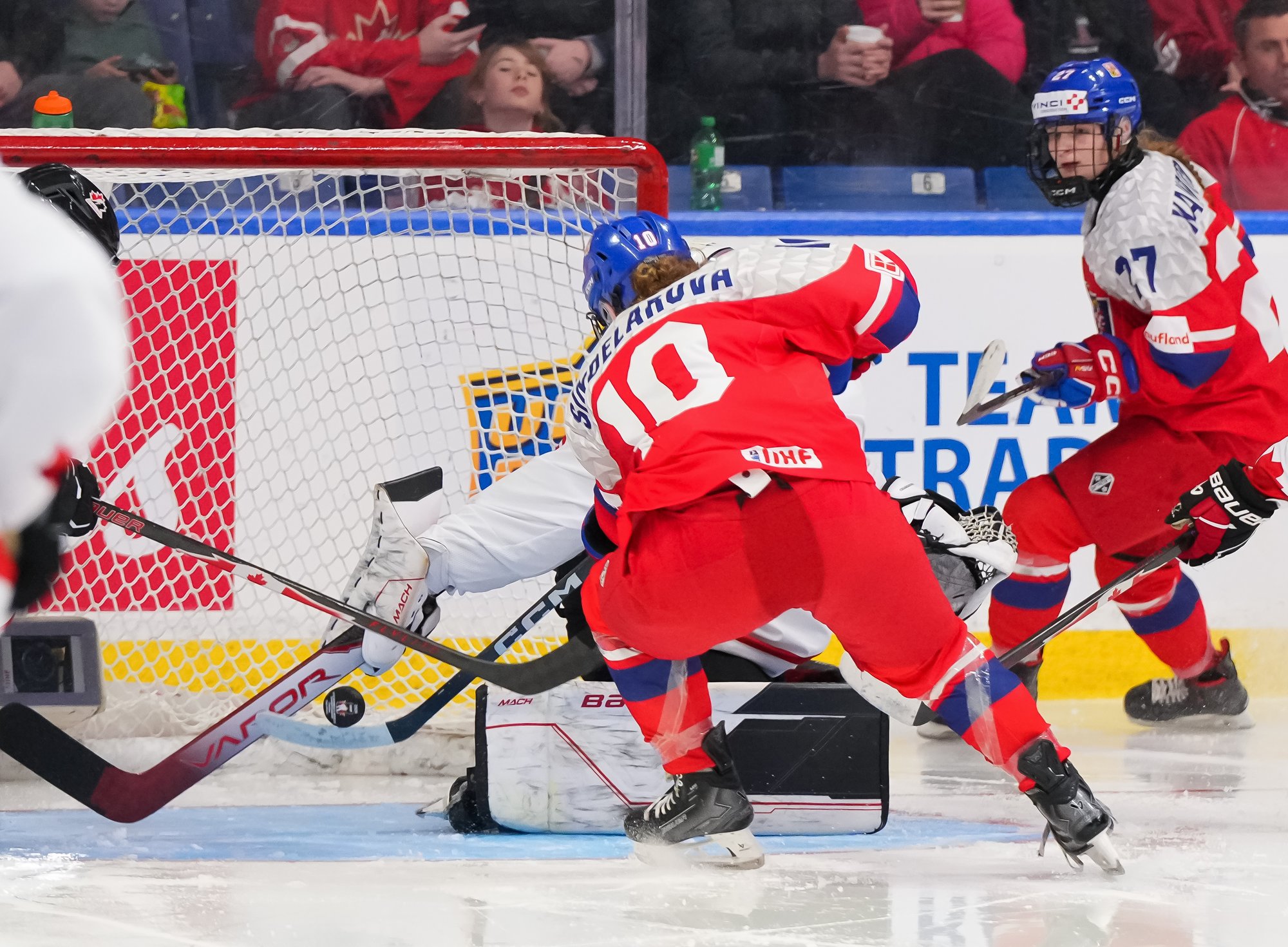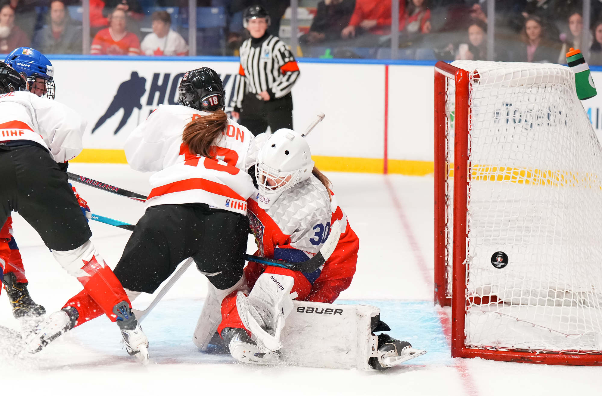 The home side started the third period on the power play once again. But the Czechs made things interesting when Sindelarova picked up a loose rebound and flipped it over Charrois to get on the board with a shorthanded tally.