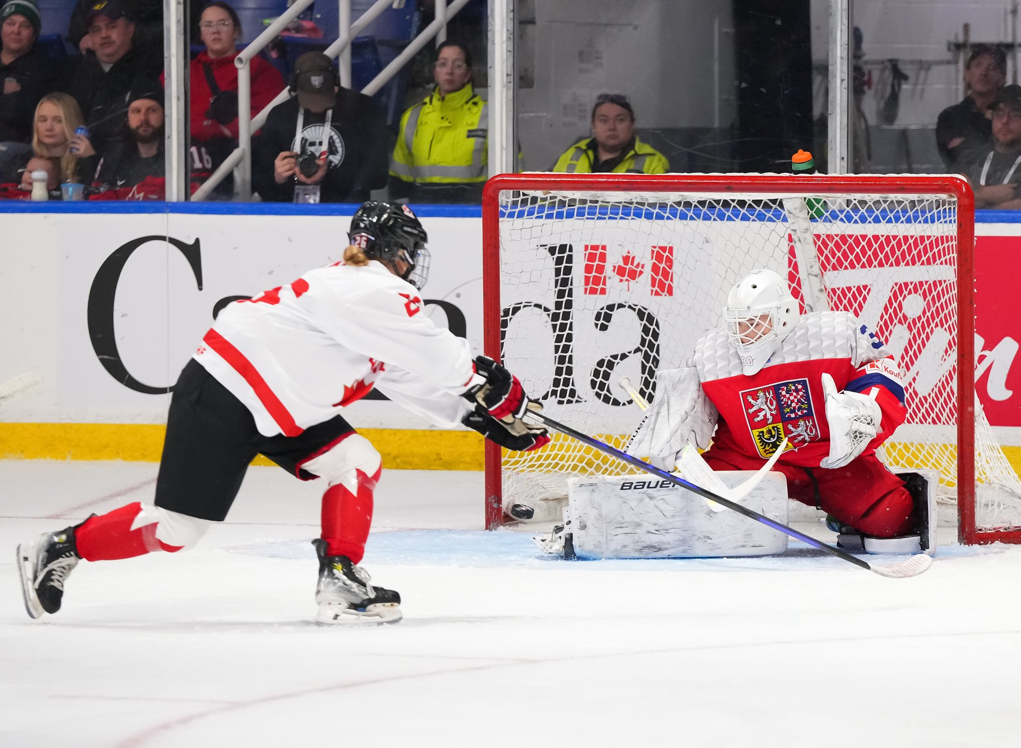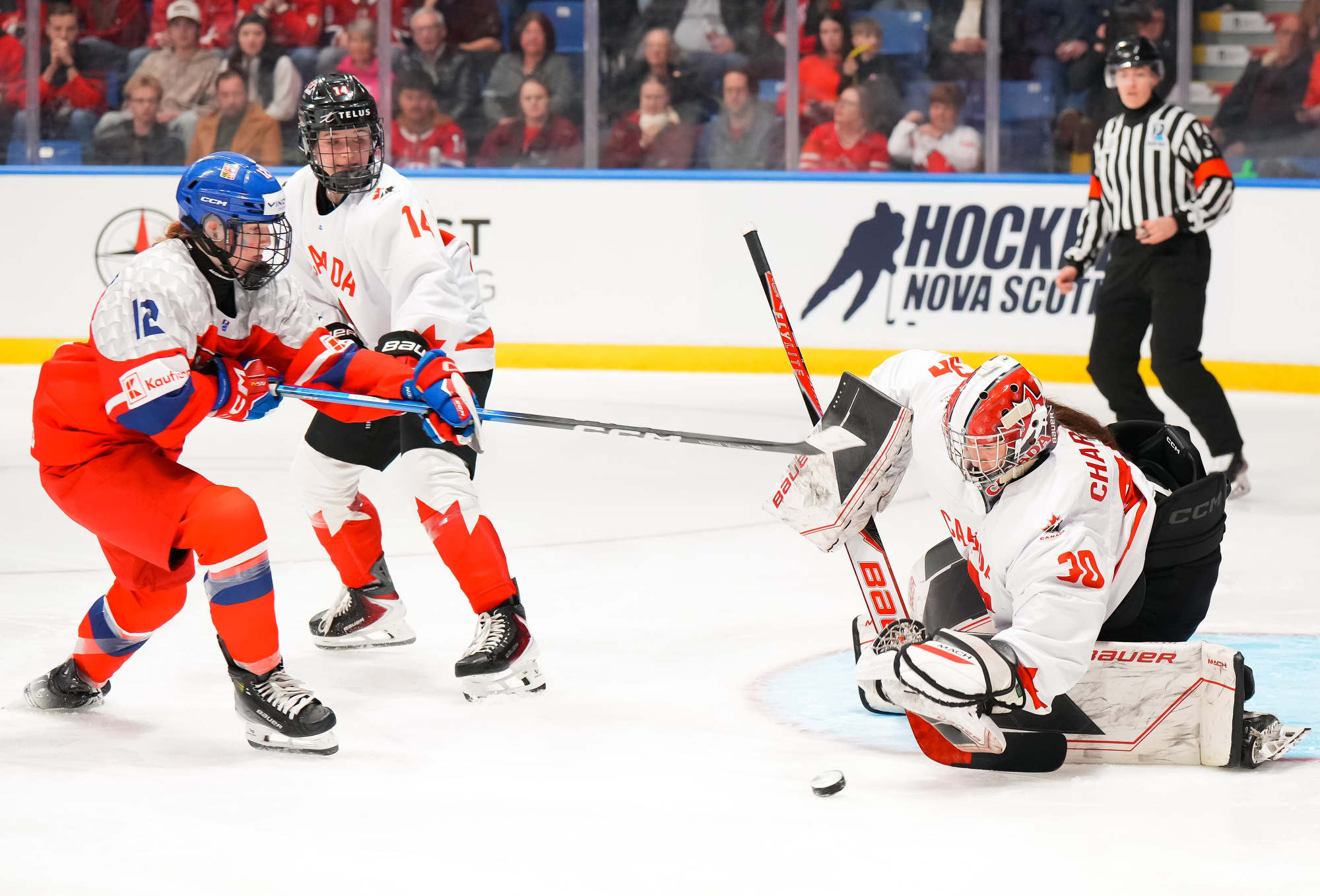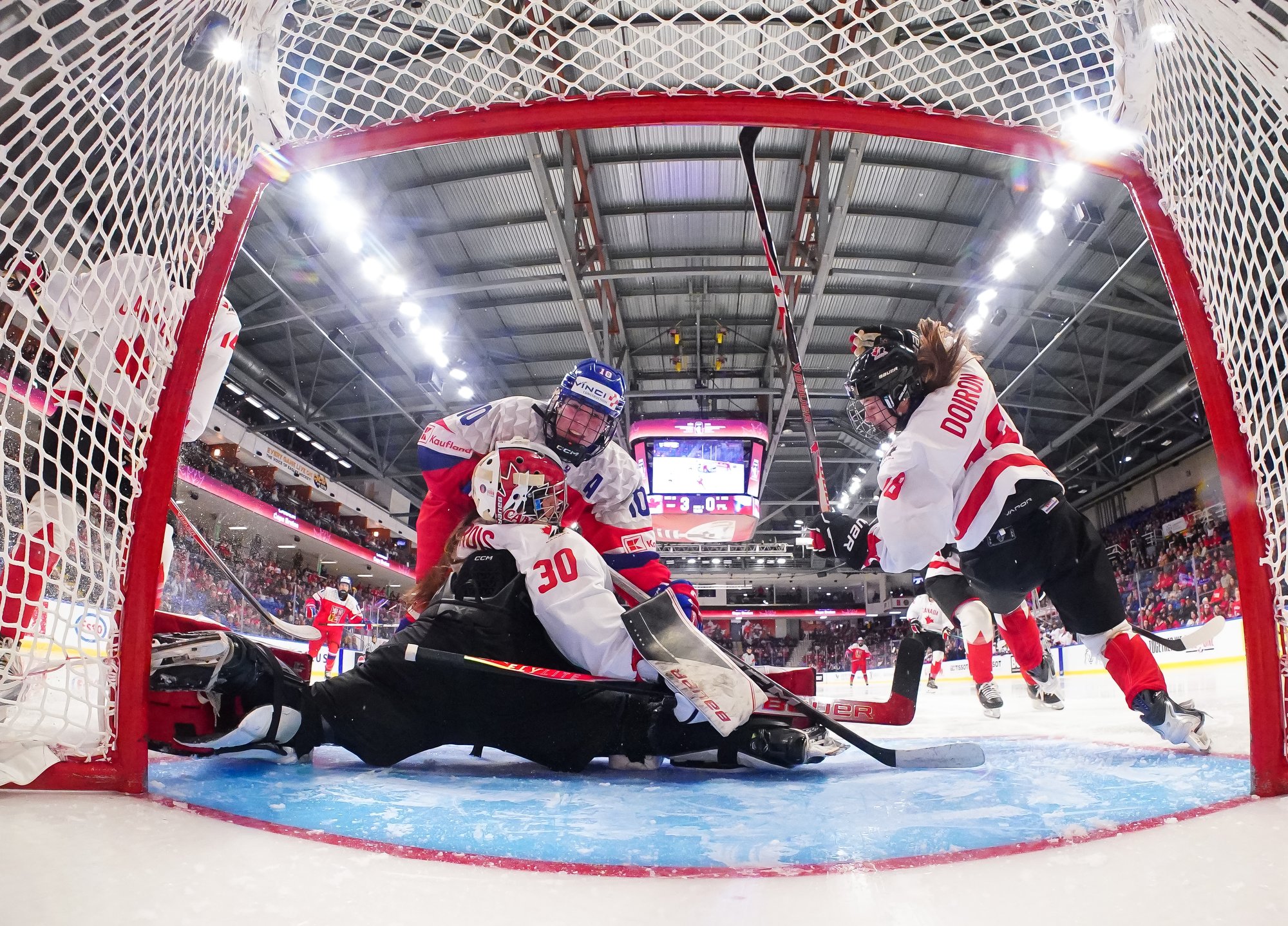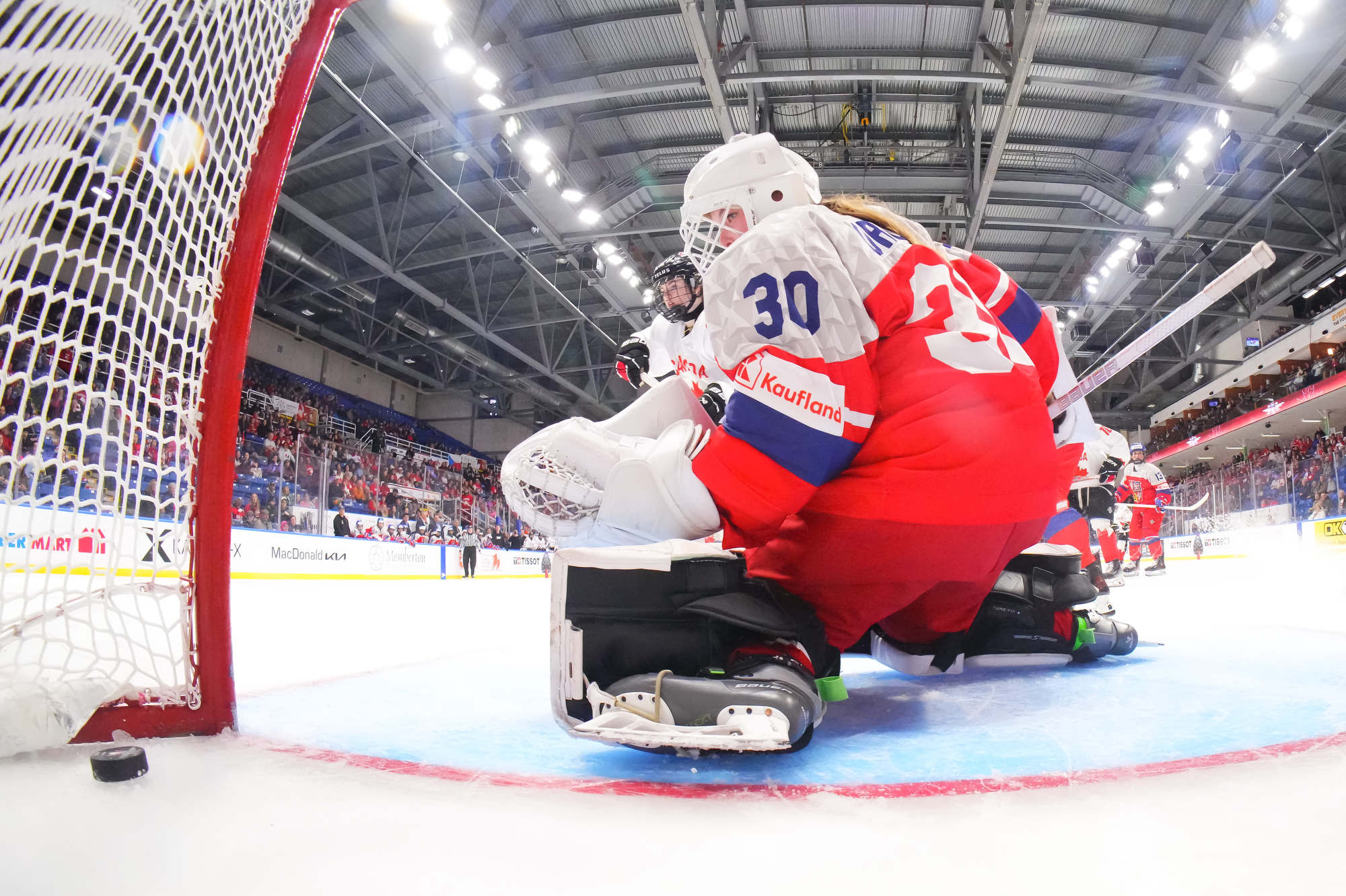 The home side started the third period on the power play once again. But the Czechs made things interesting when Sindelarova picked up a loose rebound and flipped it over Charrois to get on the board with a shorthanded tally.