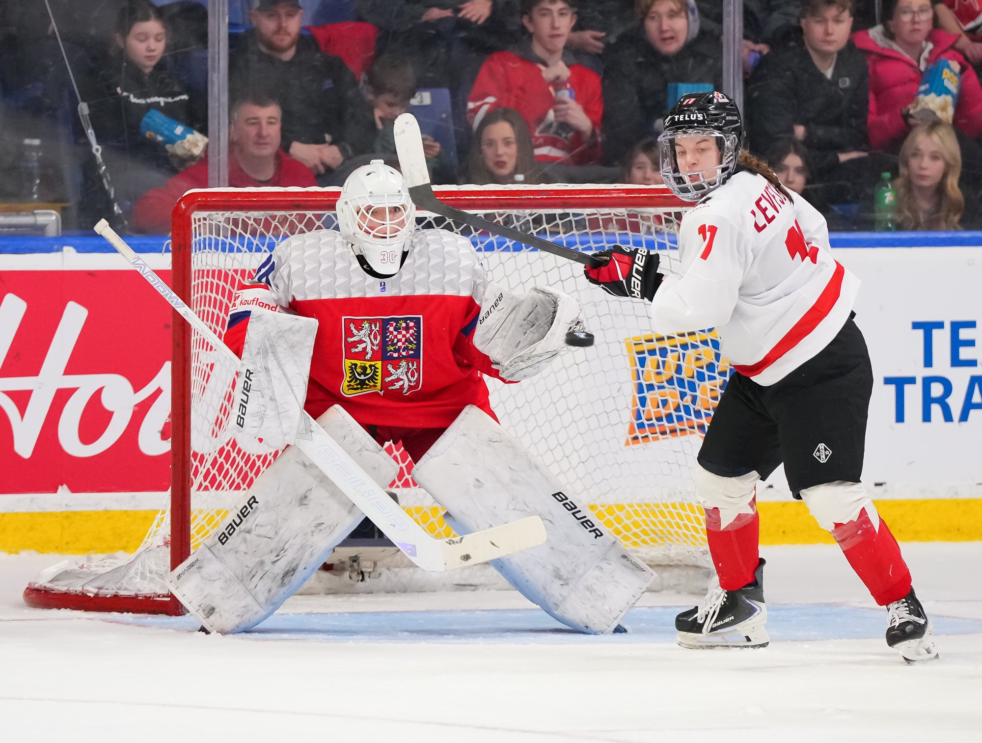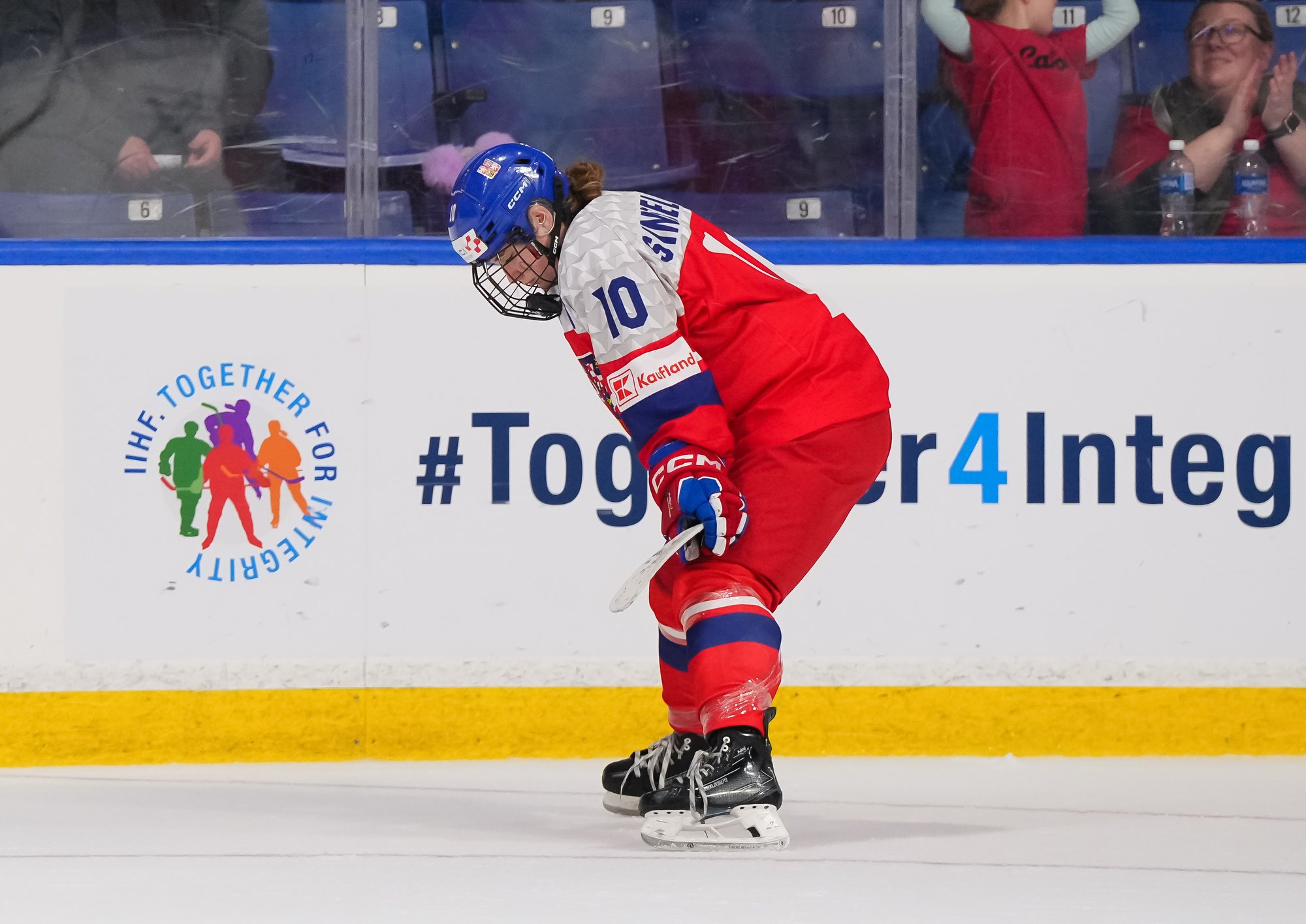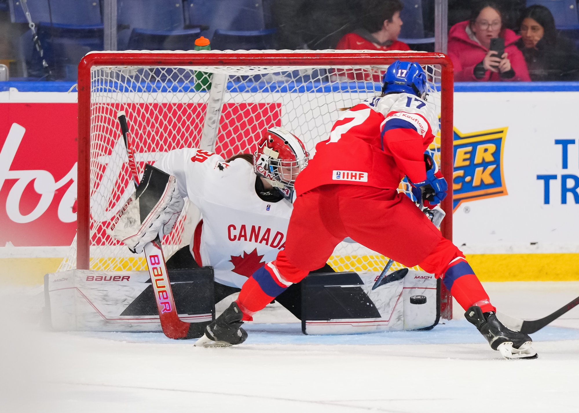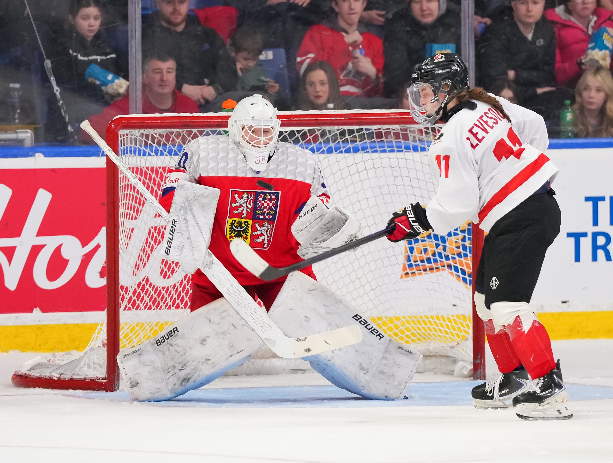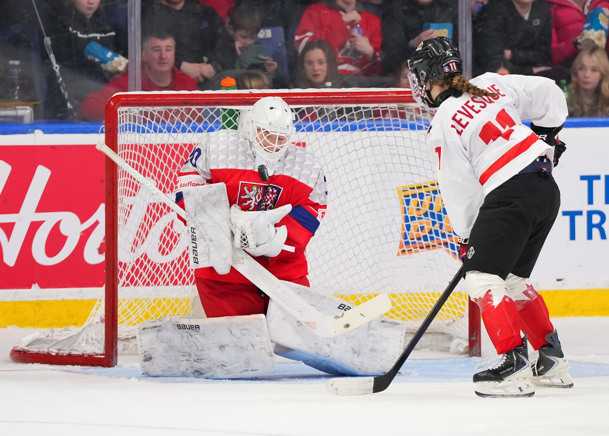 The home side started the third period on the power play once again. But the Czechs made things interesting when Sindelarova picked up a loose rebound and flipped it over Charrois to get on the board with a shorthanded tally.