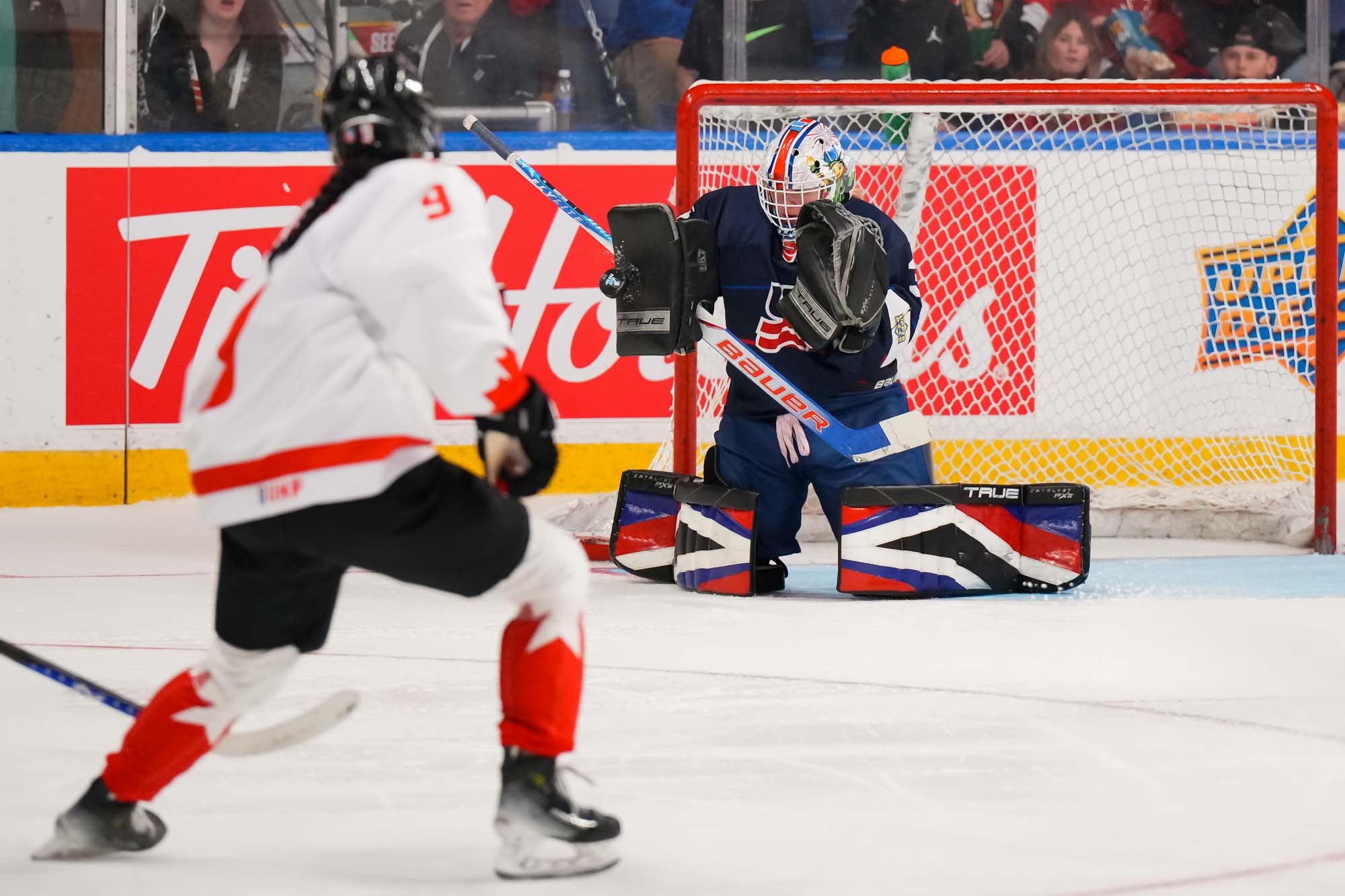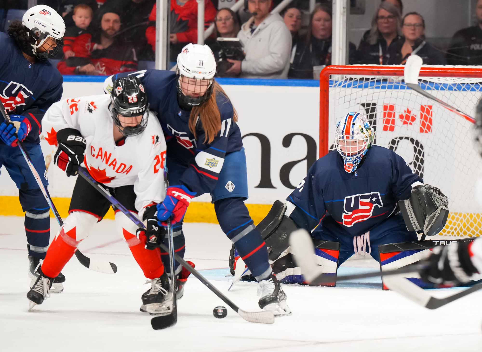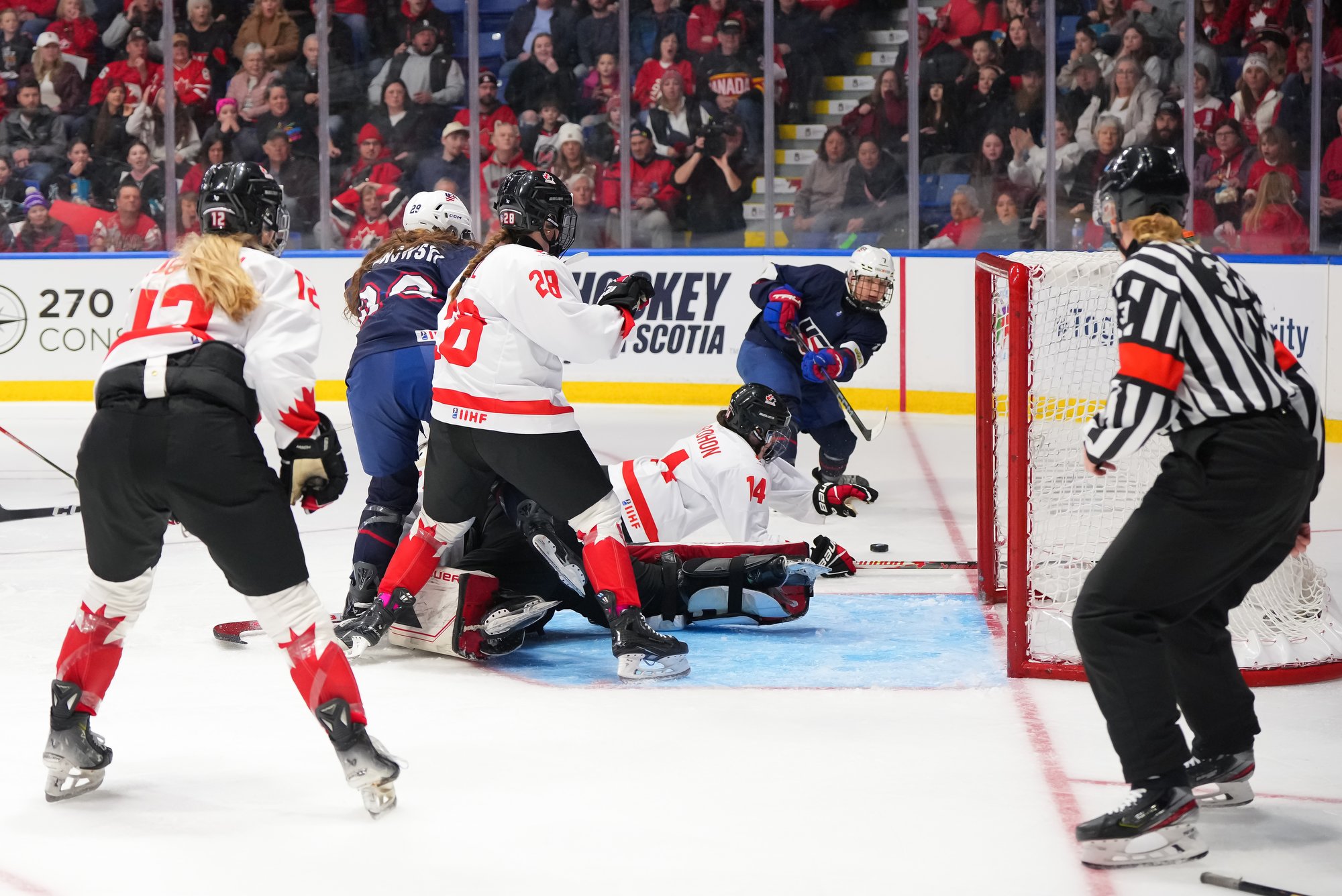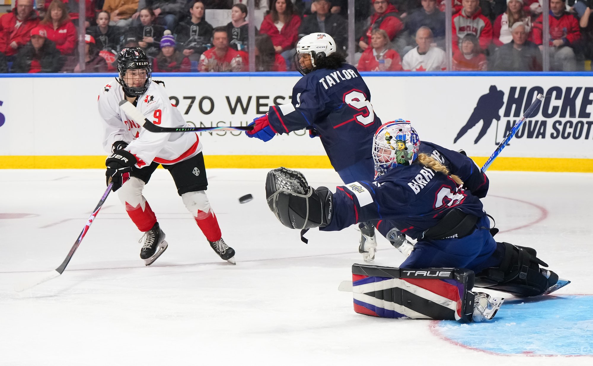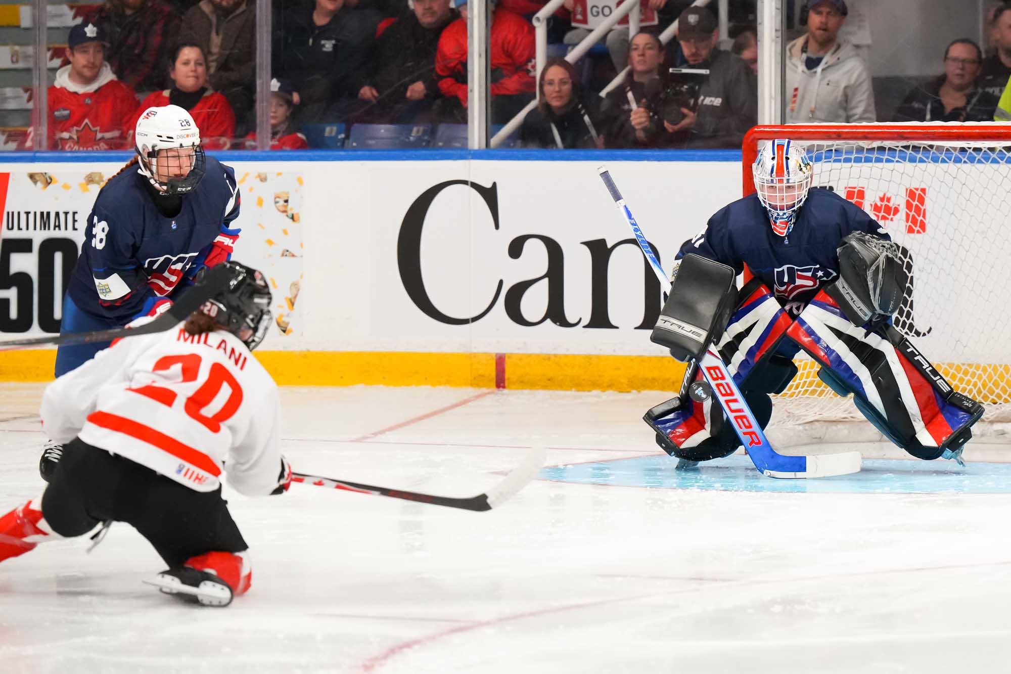 Try as they might, the Canadians were denied time and again by the determined U.S. defence. Birrittieri made her best save in the third. Milani was in the slot to knock a loose puck into the empty net, but the goalie dove and poked the puck away just in time.