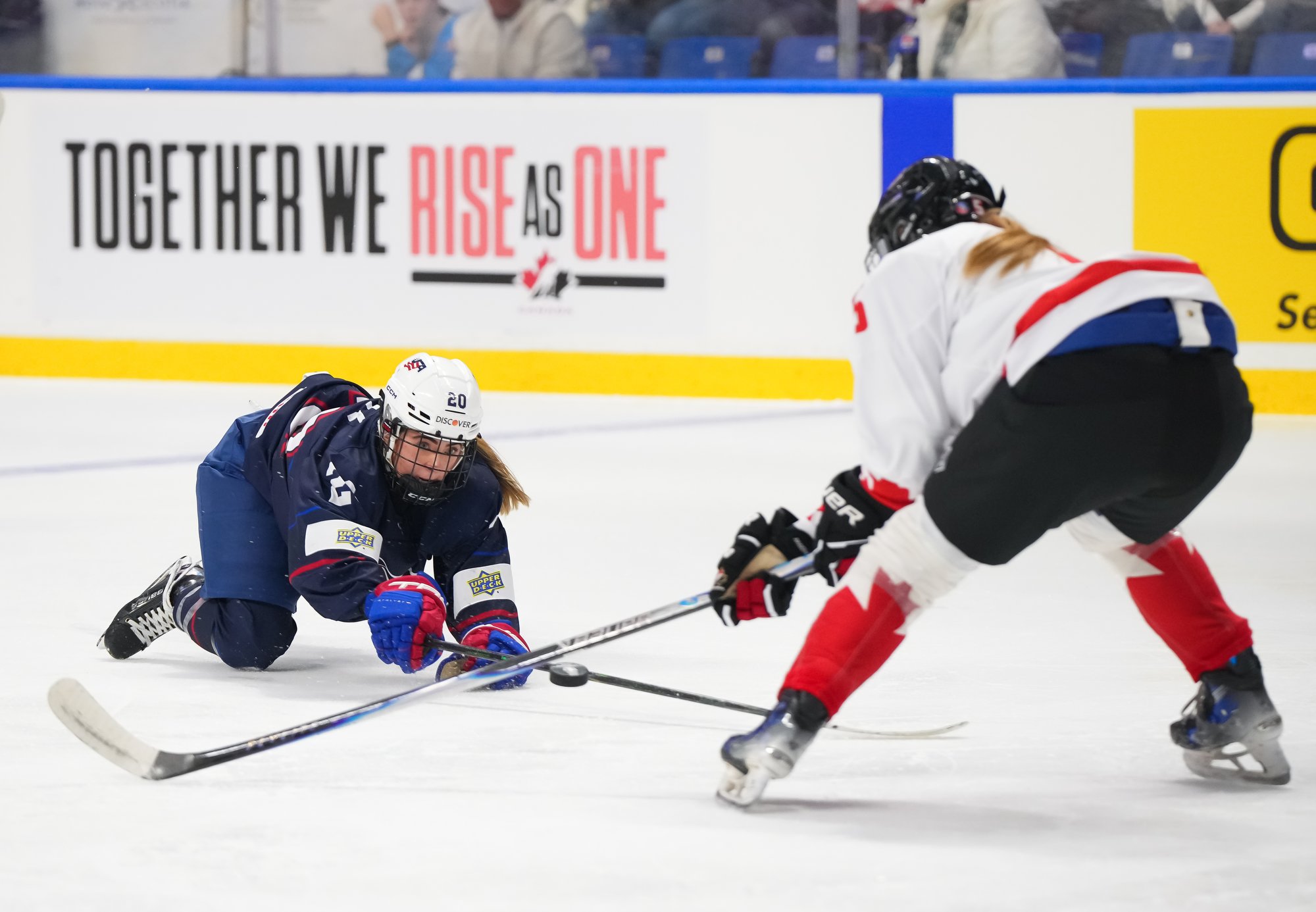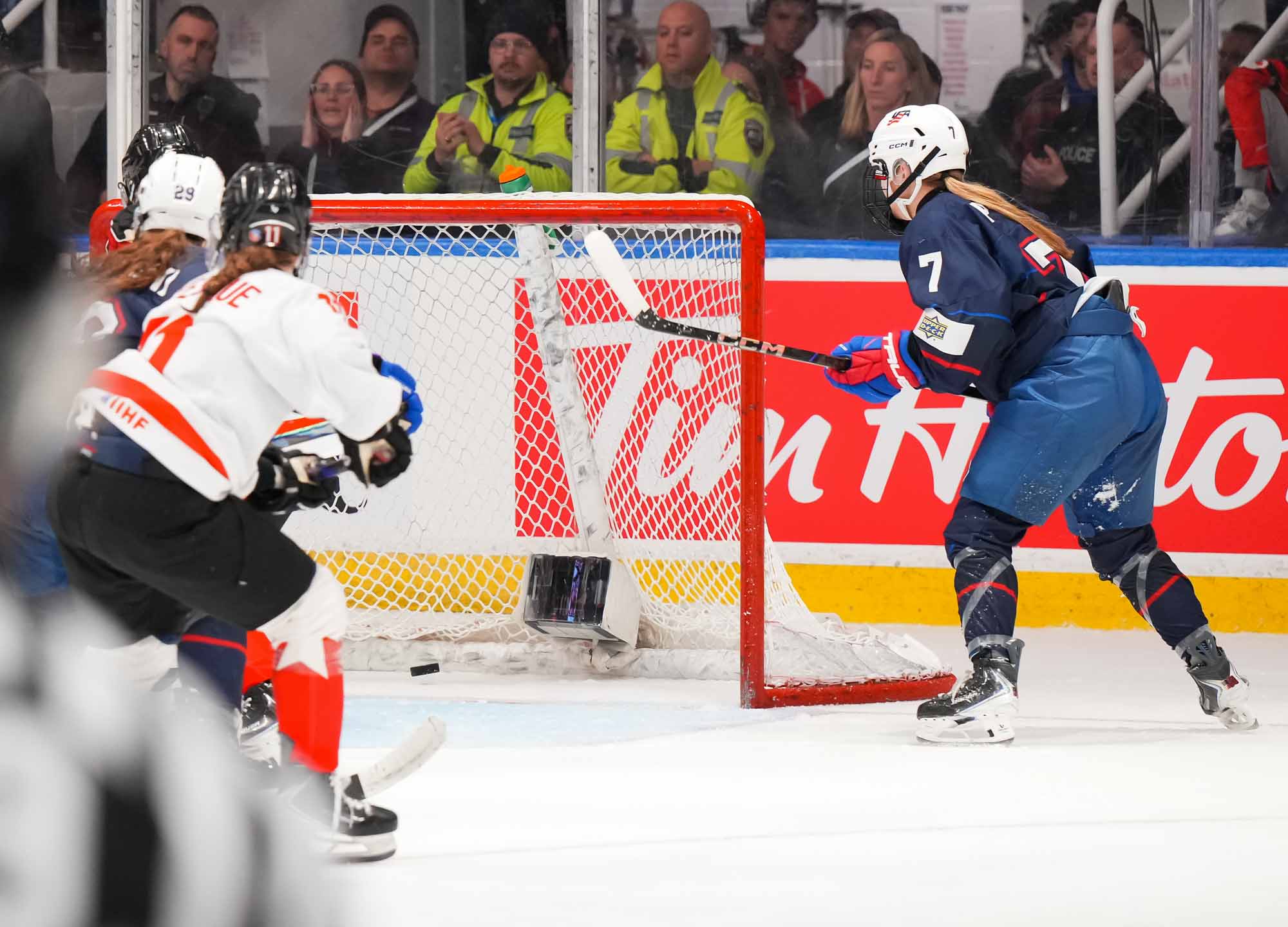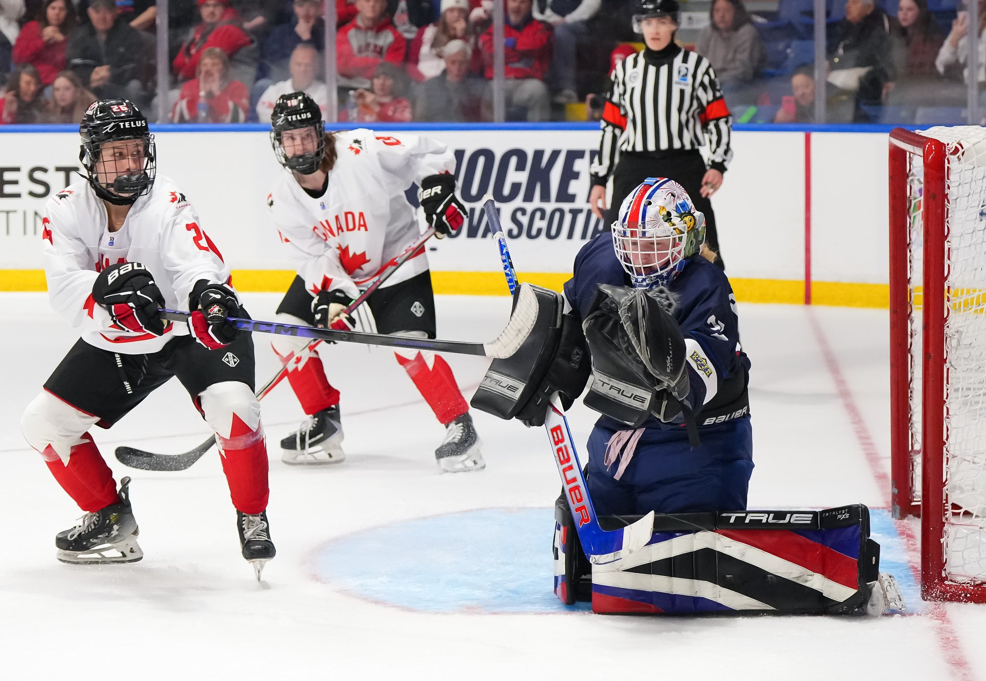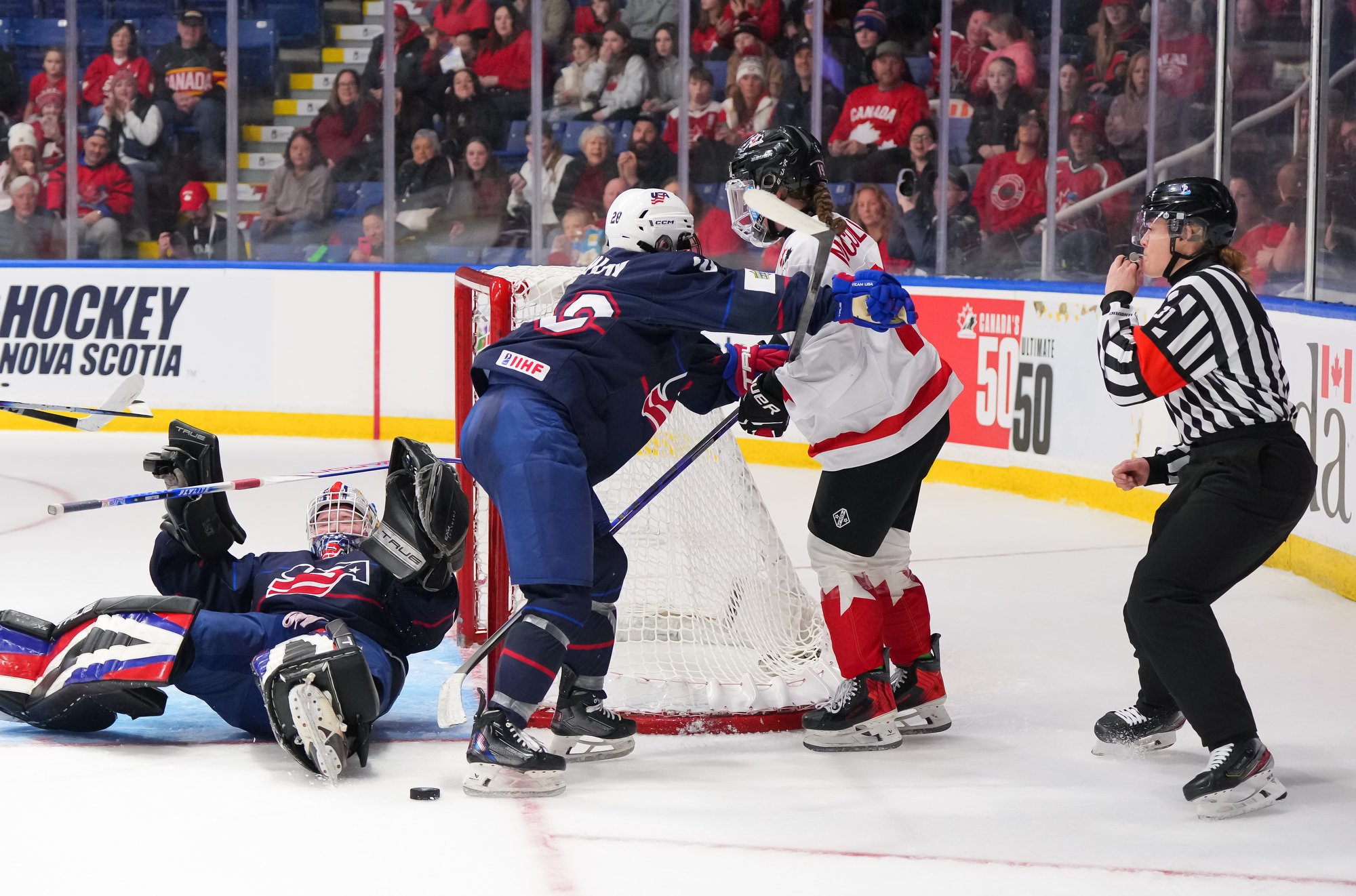 At the other end, Kylie Amelkovich tried a wraparound that went through the crease, and soon after the Canadians had the first power play when Maggie Averill inadvertently put the puck over the glass in her end.