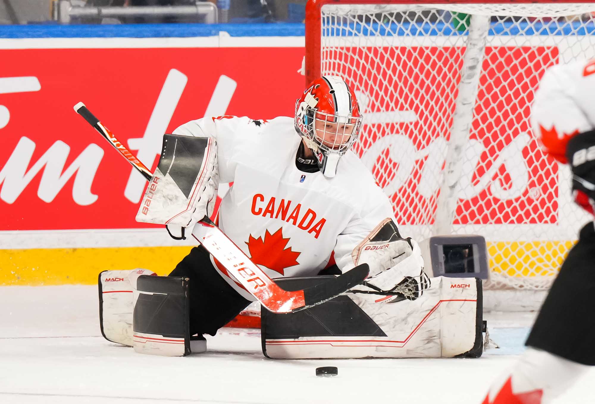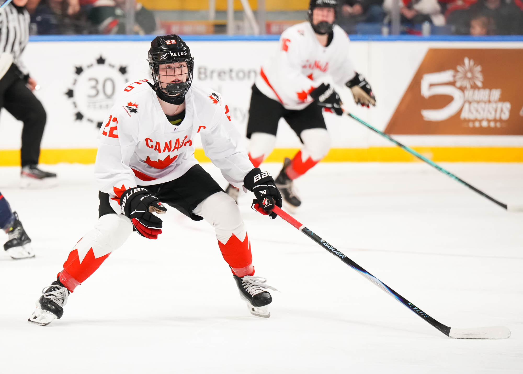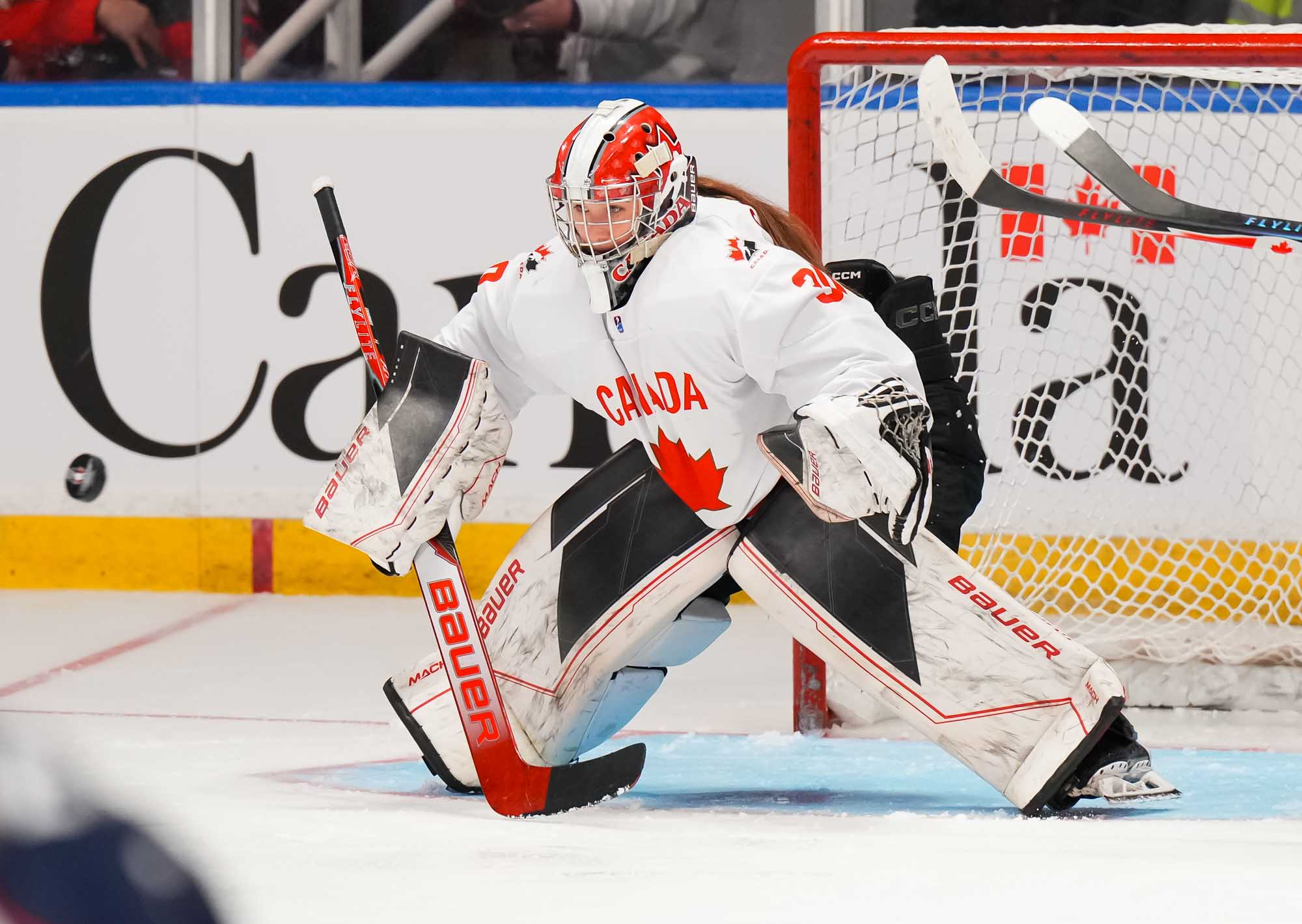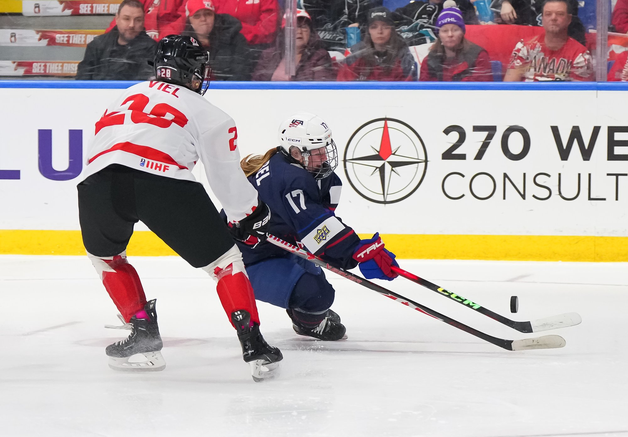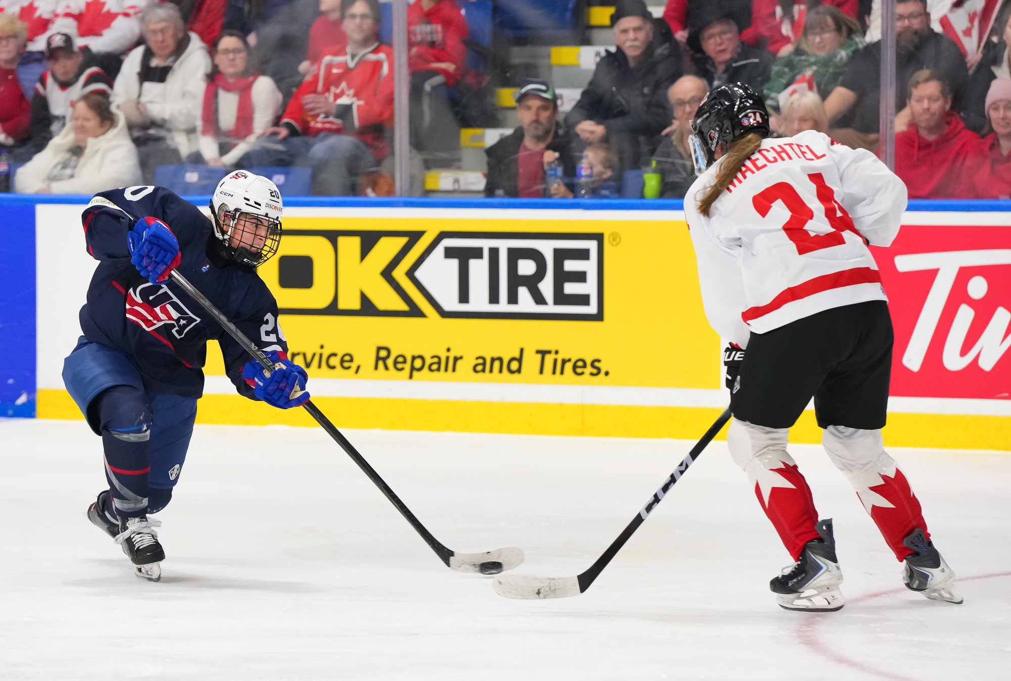 At the other end, Kylie Amelkovich tried a wraparound that went through the crease, and soon after the Canadians had the first power play when Maggie Averill inadvertently put the puck over the glass in her end.