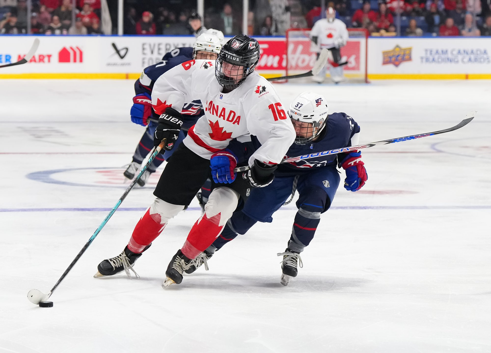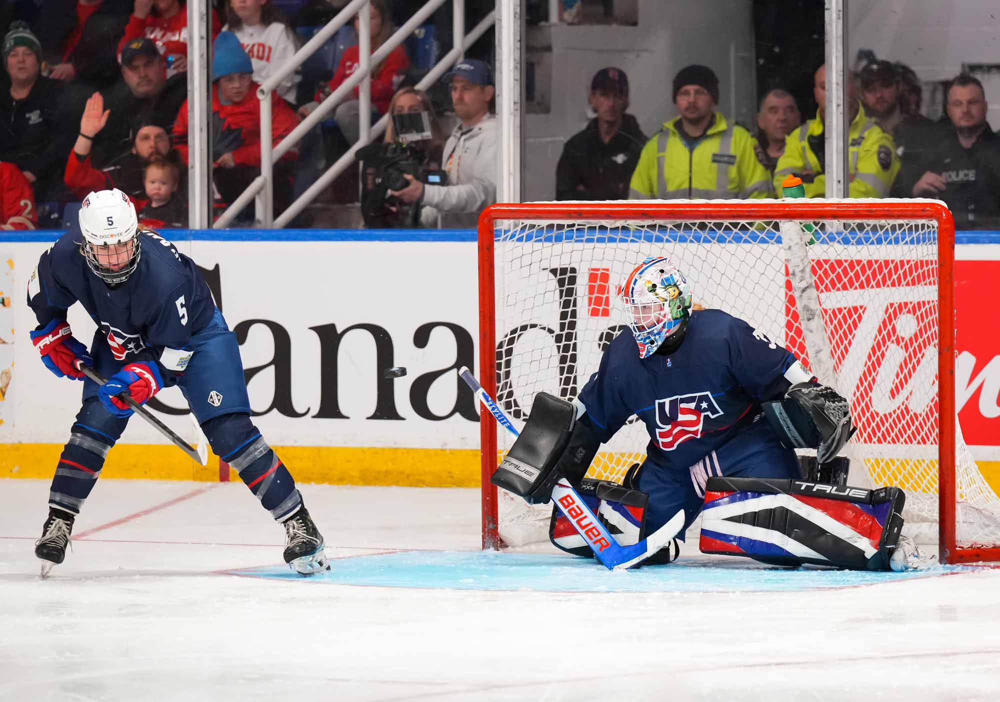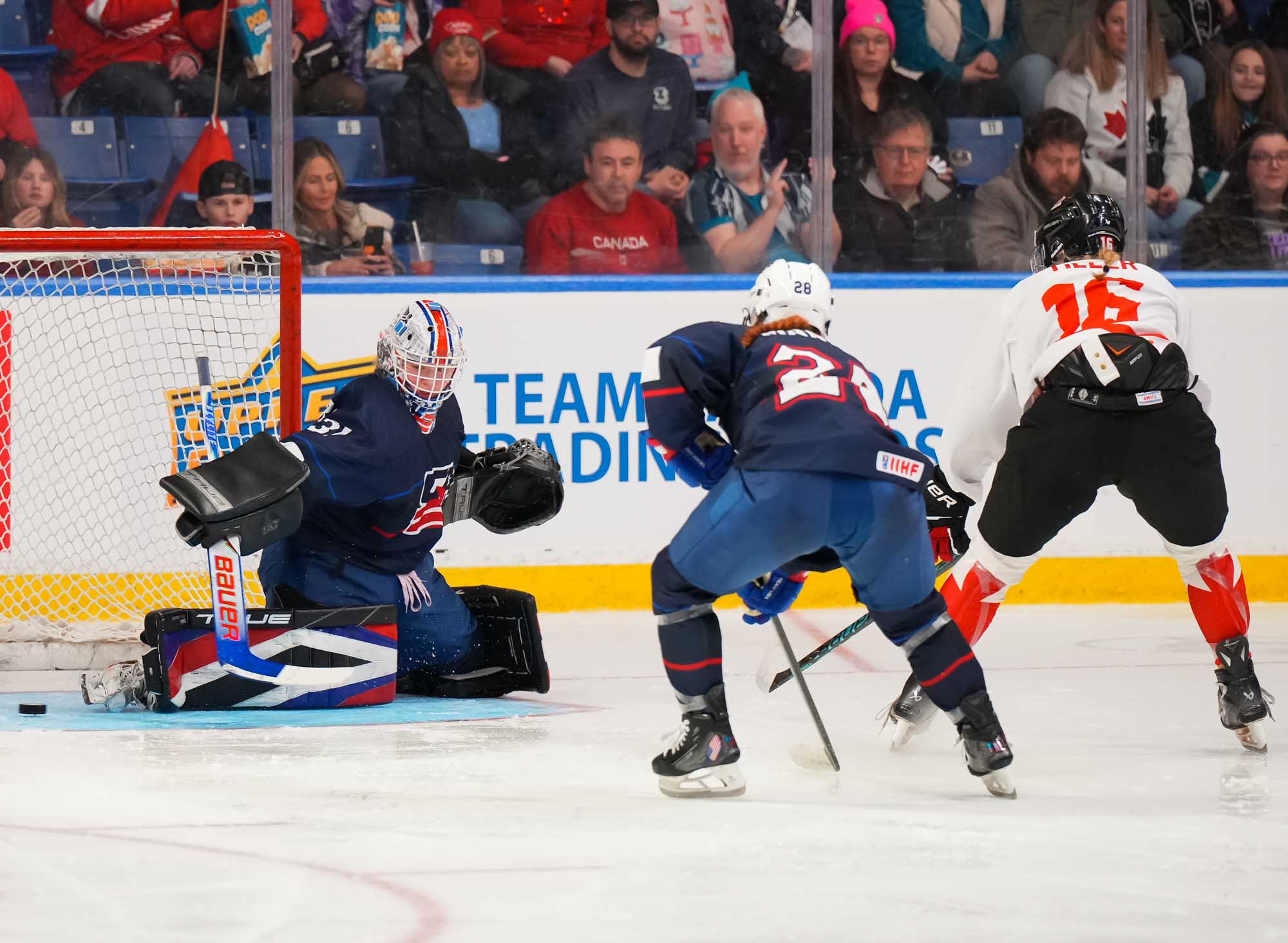 Although Canada moved the puck around crisply and generated several shots, none got past Birrittieri. And then, at 14:08, the Americans opened the scoring on a set faceoff play in the Canada end.