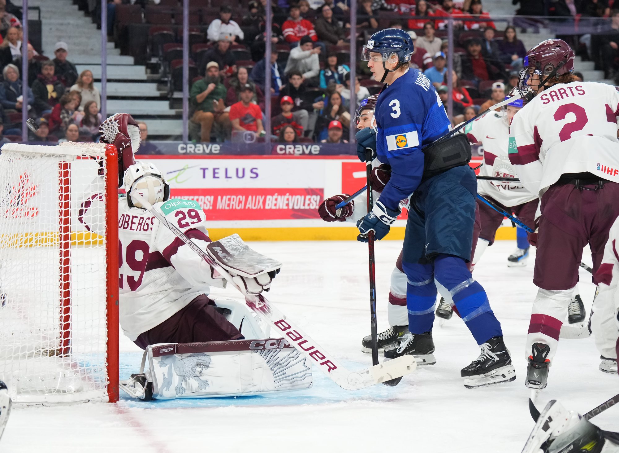 La Finlande a ajouté à son avance en début de troisième sur un autre gros tir en avantage numérique. La table a été mise par une belle passe d’Aron Kiviharju pour Kasper Halttunen, qui a dévissé un tir au-delà du bloqueur de Feldbergs pour porter la marque à 3-0.